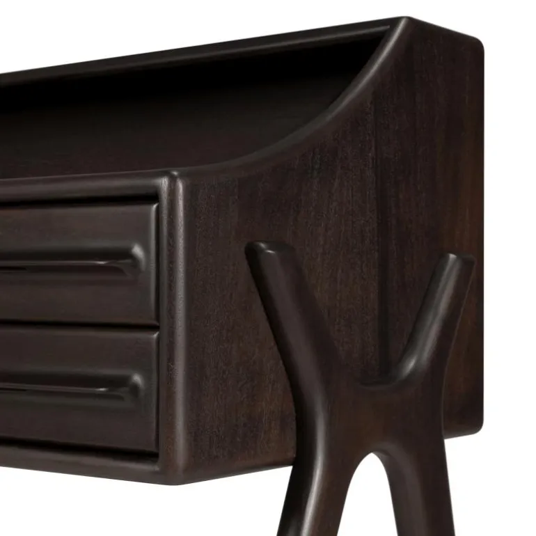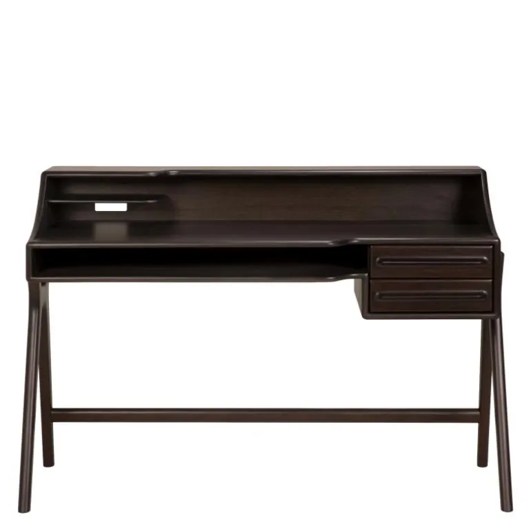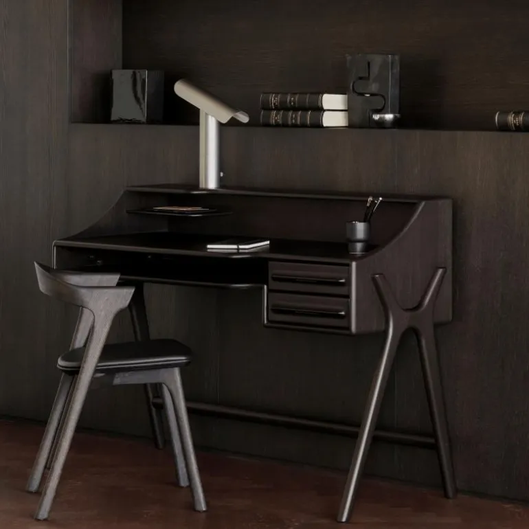 De Ethnicraft Flow Desk is een bureau dat comfort en bruikbaarheid combineert met een verfijnde vormgeving. Het meubel maakt deel uit van de Flow collectie, die wordt gekenmerkt door zachte lijnen en afgeronde hoeken. Deze vormtaal geeft het bureau een vloeiend en uitnodigend karakter en zorgt ervoor dat het zich gemakkelijk aanpast aan uiteenlopende werkruimtes. Het ontwerp is gericht op productiviteit en rust en voegt tegelijkertijd warmte toe aan de omgeving.Het bureau is vervaardigd uit massief mahoniehout dat is afgewerkt met een bruine beits en een beschermende laklaag. Deze afwerking versterkt de natuurlijke houtnerf en geeft diepte aan het oppervlak, terwijl het meubel beter bestand is tegen dagelijks gebruik. Het robuuste materiaal en de zorgvuldige afwerking maken de Flow Desk tot een duurzame keuze die jarenlang meegaat zonder in te boeten aan uitstraling of kwaliteit.De werkbladen van de Flow Desk zijn ruim opgezet en bieden voldoende plaats voor uiteenlopende werkbenodigdheden. Onder het blad zijn twee lades geïntegreerd die openen met een discrete greep aan de onderzijde. Deze lades maken het mogelijk om kleinere accessoires, zoals schrijfwaren of documenten, netjes op te bergen zodat het werkoppervlak overzichtelijk blijft. Daarnaast is het bureau voorzien van een geïntegreerde kabeldoorvoer, waardoor snoeren eenvoudig kunnen worden weggewerkt en een opgeruimde werkomgeving wordt gecreëerd.De combinatie van vloeiende lijnen en praktische details zorgt voor een bureau dat geschikt is voor diverse toepassingen. De Flow Desk kan zowel in een thuiswerkplek als in een zakelijke kantooromgeving worden gebruikt. Het open onderstel draagt bij aan een lichte en toegankelijke uitstraling, waardoor het meubel ook in kleinere ruimtes ruimtelijk oogt.Ethnicraft staat bekend om het gebruik van massief hout en een consequente aandacht voor duurzaamheid en vakmanschap. De Flow Desk is hier een duidelijk voorbeeld van. Door de toepassing van hoogwaardige materialen, een solide constructie en een zorgvuldige afwerking biedt het bureau een combinatie van functionaliteit en lange levensduur.De Ethnicraft Flow Desk onderscheidt zich door de balans tussen een warme uitstraling, een solide basis en slimme oplossingen zoals lades en kabelbeheer. Het bureau is ontworpen om zowel creatieve als productieve momenten te ondersteunen en vormt een betrouwbare en stijlvolle aanvulling op elke werkruimte.
