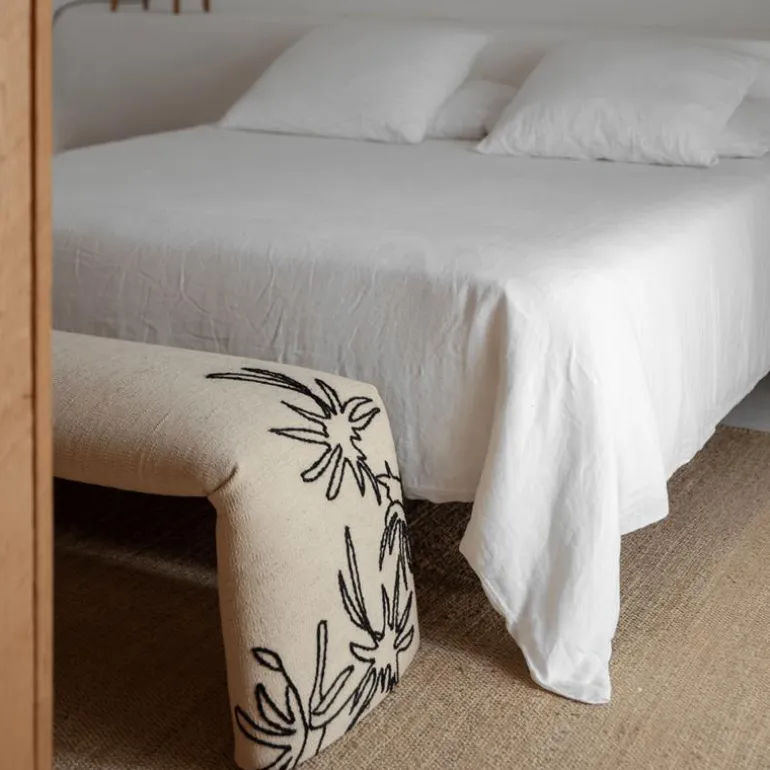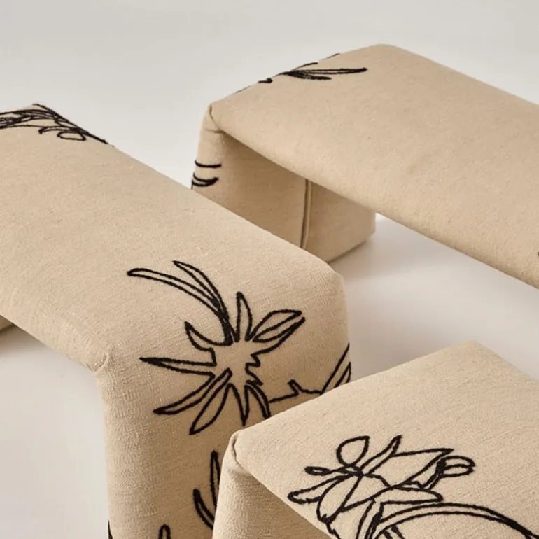 Binnen de collectie zijn meerdere uitvoeringen beschikbaar, elk met een eigen karakter: van ingetogen effen stoffen die de geometrie accentueren tot patronen en geborduurde versies die een speelse, decoratieve laag toevoegen. Deze variatie biedt ruimte voor persoonlijke expressie en toepassing binnen zowel minimalistische als eclectische interieurs.