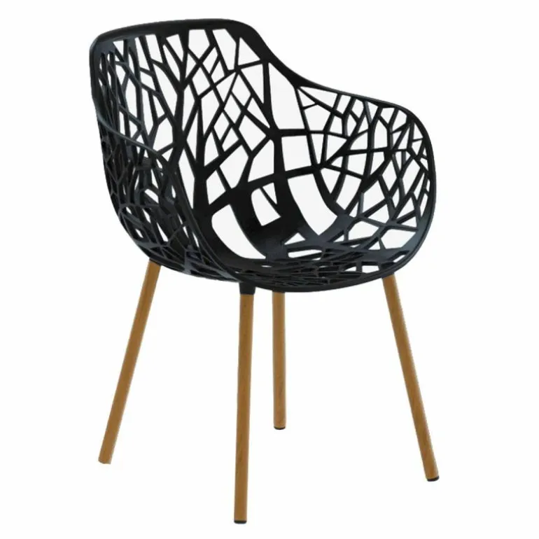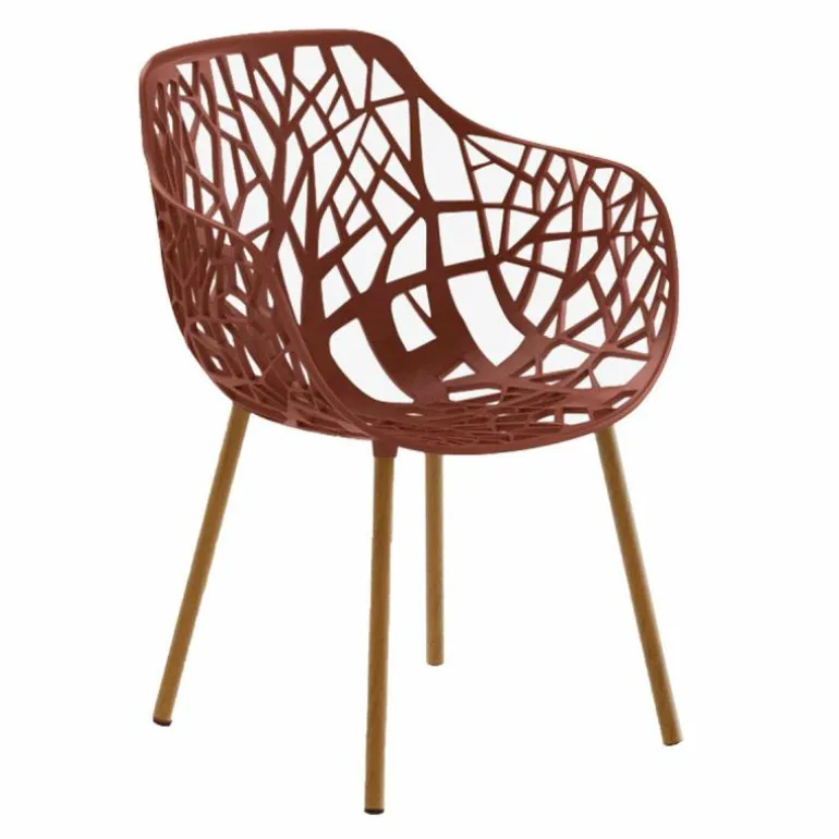 De Fast Forest Armchair Iroko is een ontwerp van Robby & Francesca Cantarutti. Het opvallende lijnenspel in de zitting en rugleuning van de stoel springt meteen in het oog. De ontwerpers lieten zich inspireren door de silhouetten die in het bos ontstaan bij een laaghangende zon. Door deze inspiratie ontstond een ontwerp met een natuurlijk en bosrijk tintje, zonder dat daarbij het strakke karakter verloren is gegaan. Net zoals de rest van de collectie van Fast voert ook bij dit ontwerp de heldere, enigszins minimalistische vormgeving de boventoon. Dat komt door de hoekige lijnen, maar ook door het gebruik van aluminium dat is voorzien van een gekleurde poedercoating. Hierdoor oogt de Forest Armchair Iroko heel modern. r