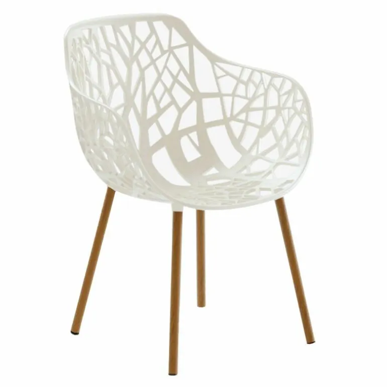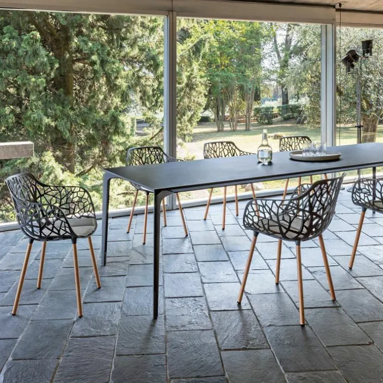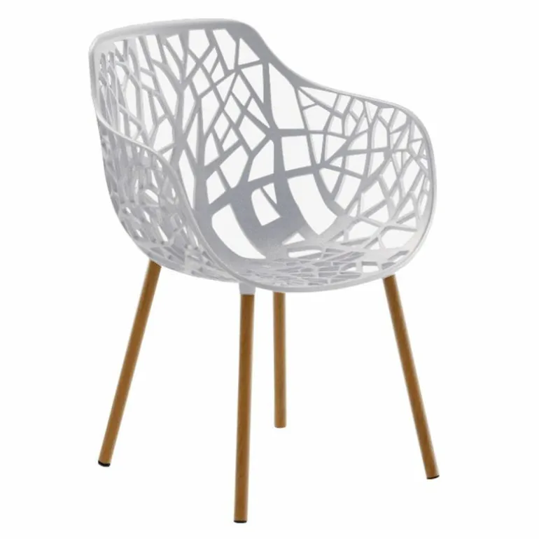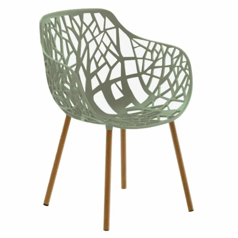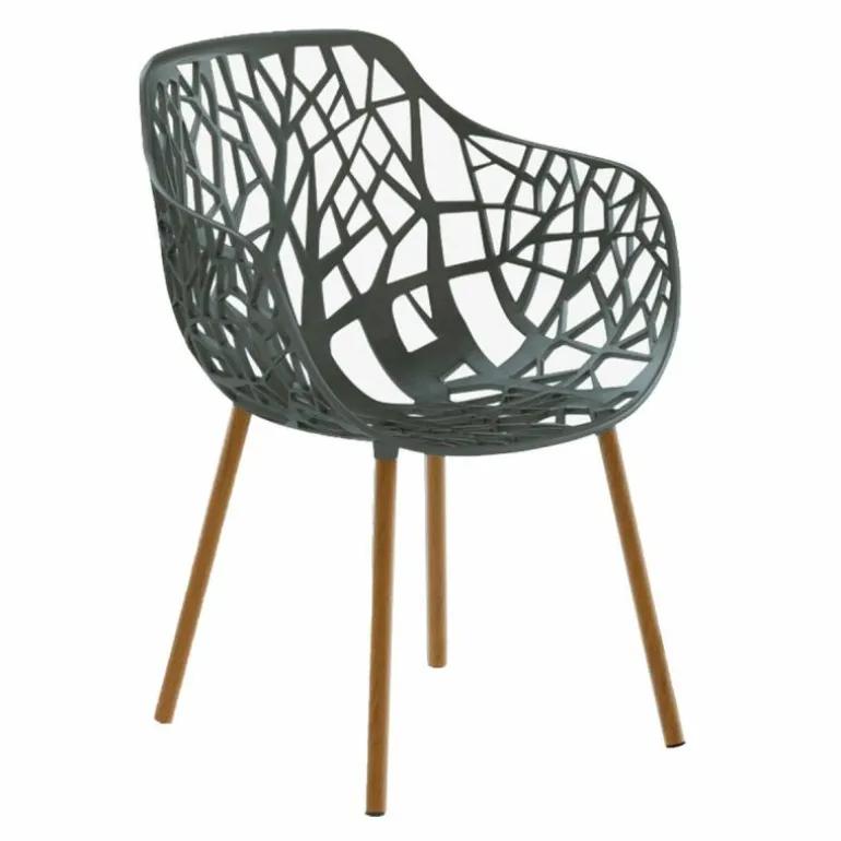 Dankzij het gebruik van aluminium kan de stoel ook gemakkelijk buiten gebruikt worden. Het gebruik van dit materiaal zorgt er namelijk voor dat de stoel sterk en licht van gewicht is. Daarnaast is aluminium een materiaal dat niet roest. De poten van deze versie van de Forest Armchair Iroko zijn omhuld met Iroko hout. Dit is sterke, duurzame houtsoort. Door de aluminium kern van de poot ontstaat een stevige constructie. r