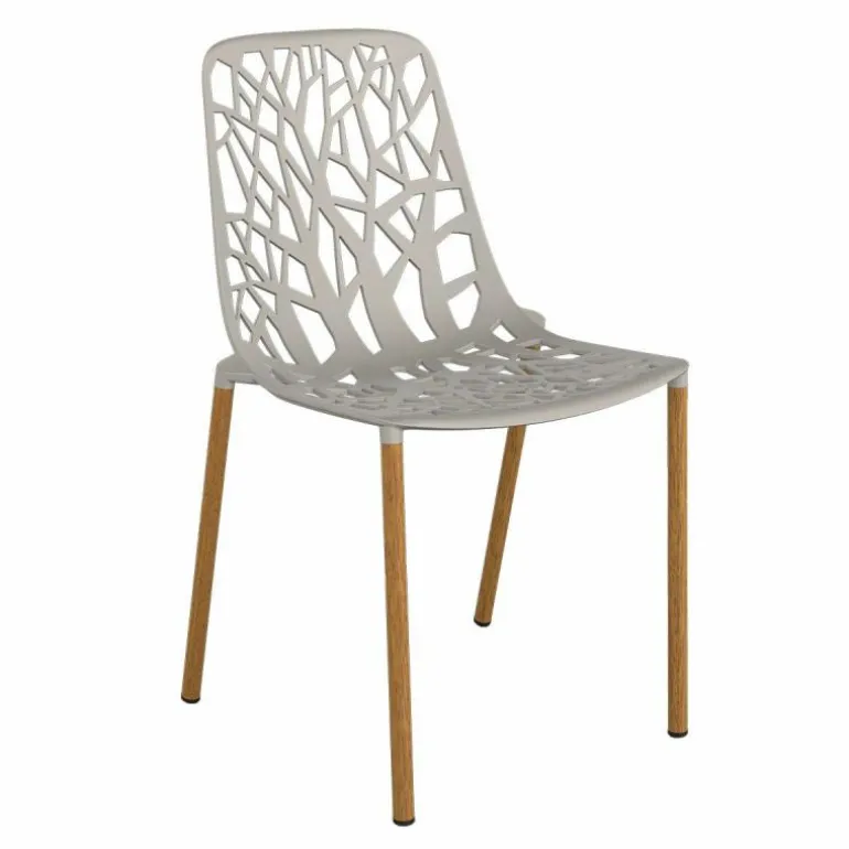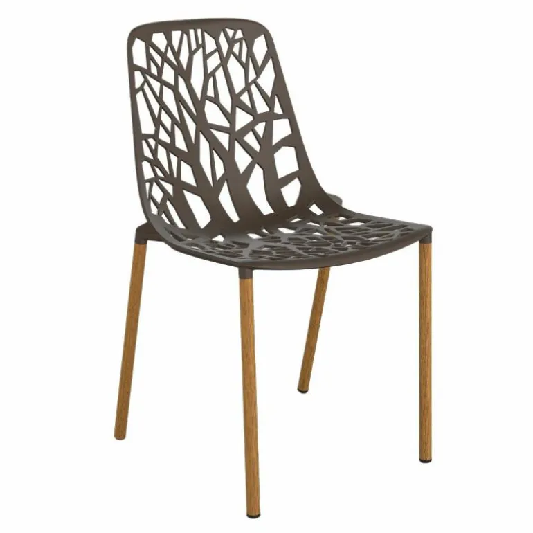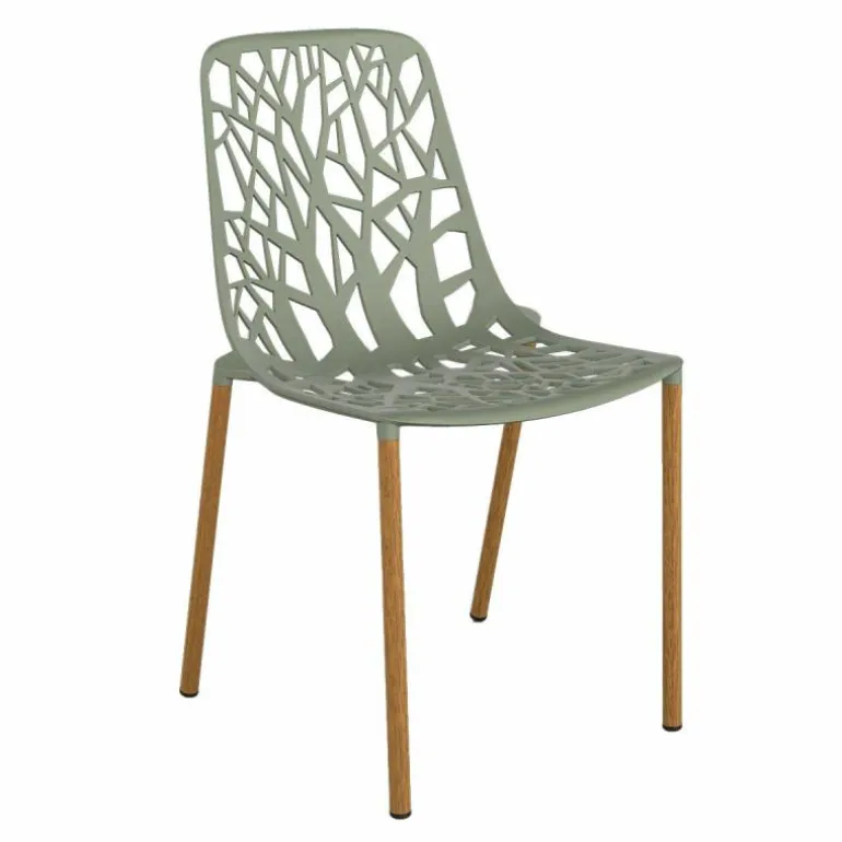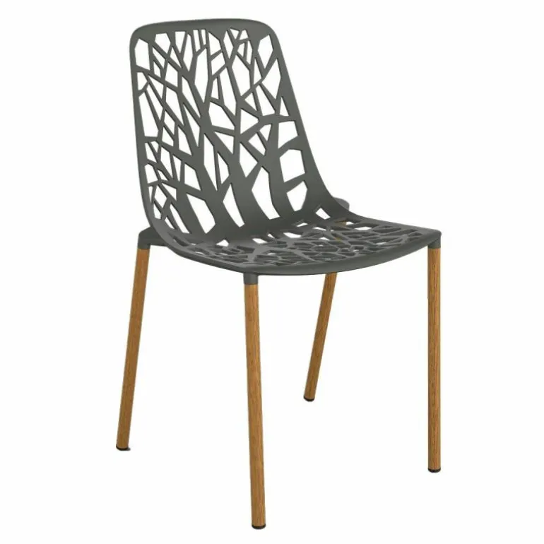 Dankzij het gebruik van aluminium kan de stoel ook gemakkelijk buiten gebruikt worden. Het gebruik van dit materiaal zorgt er namelijk voor dat de stoel sterk en licht van gewicht is. Daarnaast is aluminium een materiaal dat niet roest. De poten van deze versie van de Forest Chair Iroko zijn omhuld met Iroko hout. Dit is sterke, duurzame houtsoort. Door de aluminium kern van de poot ontstaat een stevige constructie. r