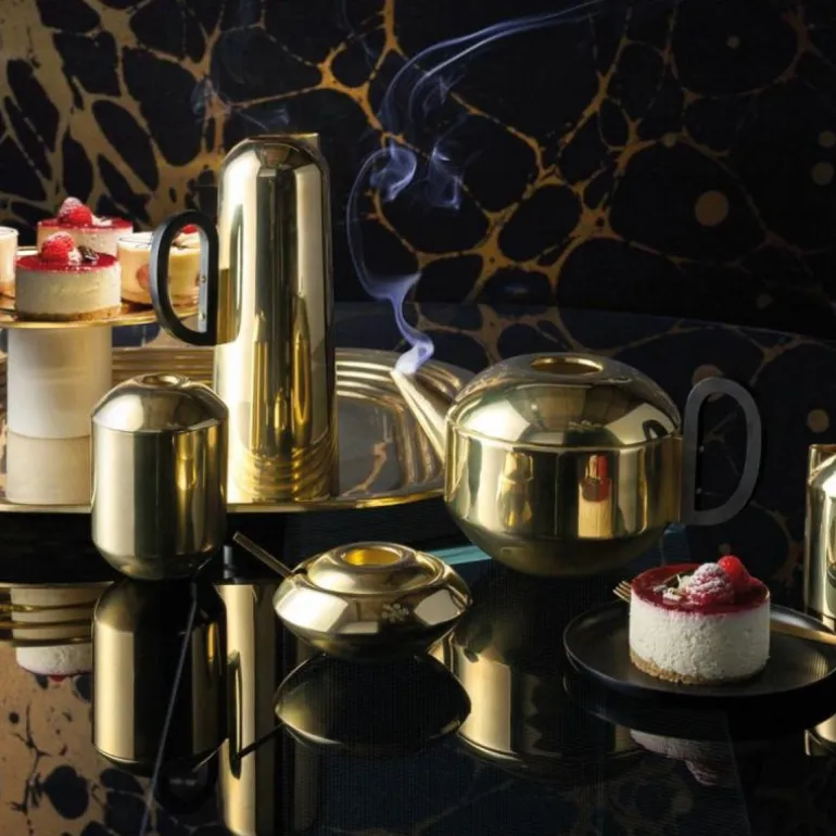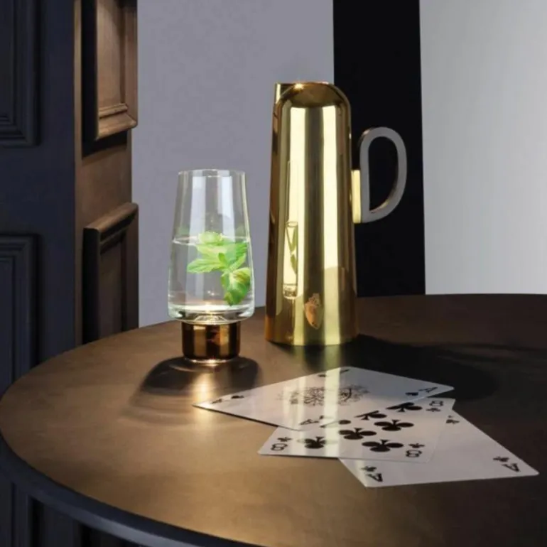 De kan is vervaardigd uit gesponnen messing. Het materiaal is gepolijst en daarna ondergedompeld in een warme gouden wassing voor een subtiel matte afwerking.r