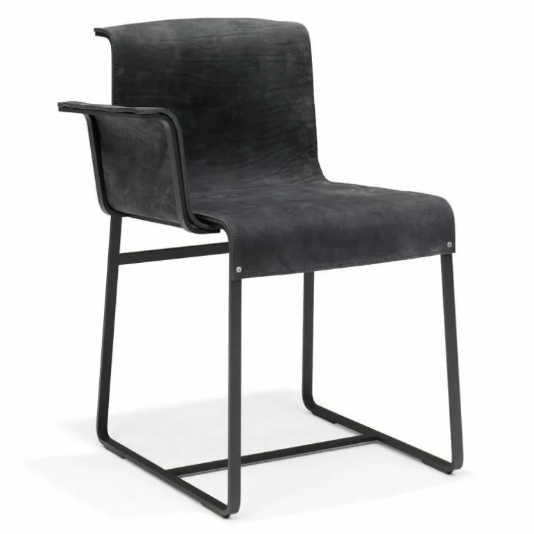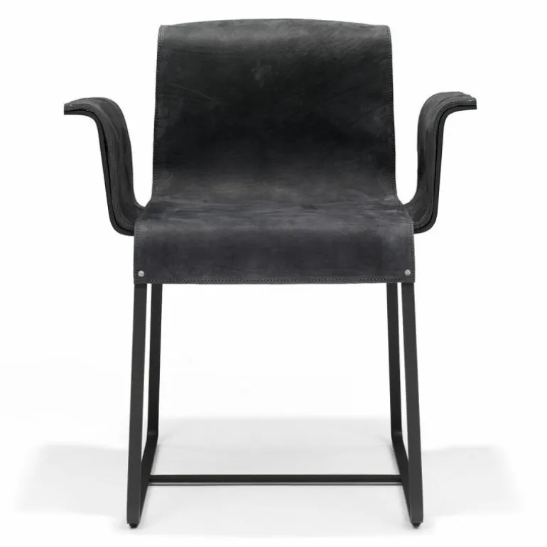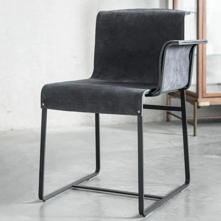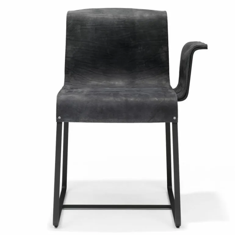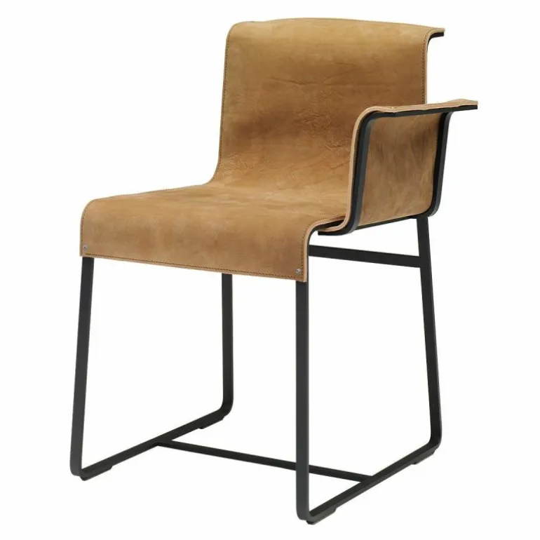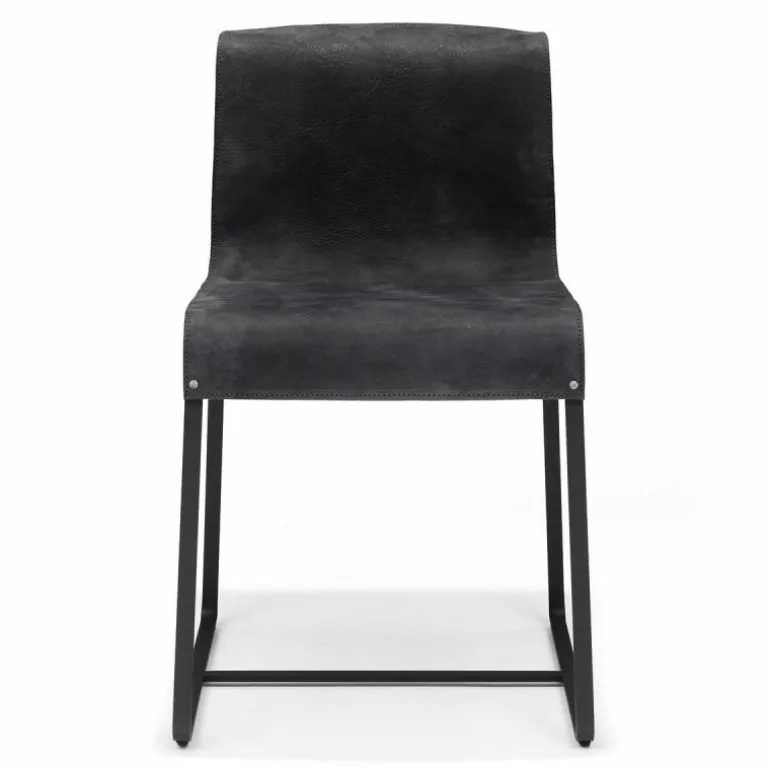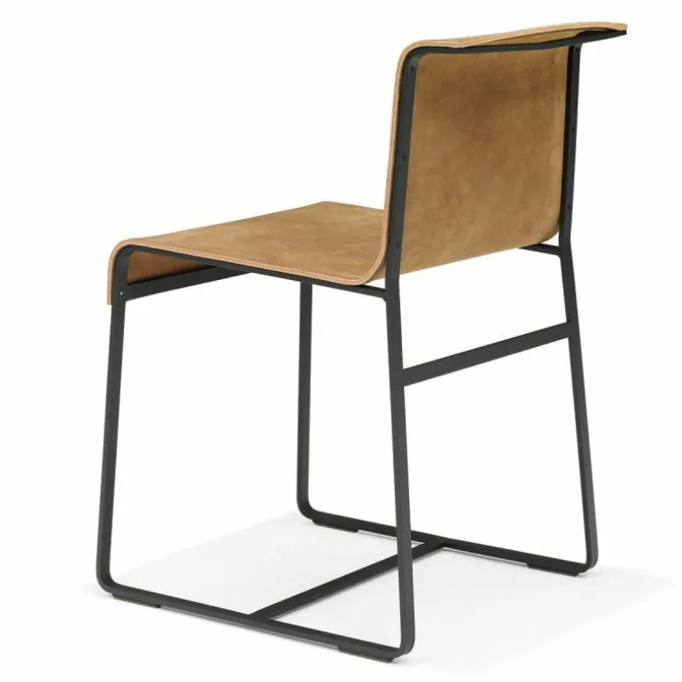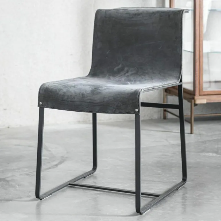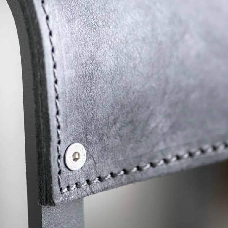 Het frame van de Founded Stoel bestaat uit één stuk staal. Een laser snijdt het materiaal op de juiste maat. Vervolgens wordt het staal vakkundig in de juiste vorm gebogen. Het frame is afgewerkt met een donkergrijze poedercoating in de kleur RAL 7021. Het stevige stalen frame is gecombineerd met een zitting van tuigleer, een leersoort die afkomstig is van volwassen runderen. Het kenmerk zich als steviger, dikker en sterker dan andere leersoorten. Het is stugger en zwaarder en daardoor zeer geschikt voor meubilair. Qua structuur heeft het een natuurlijke uitstraling.r