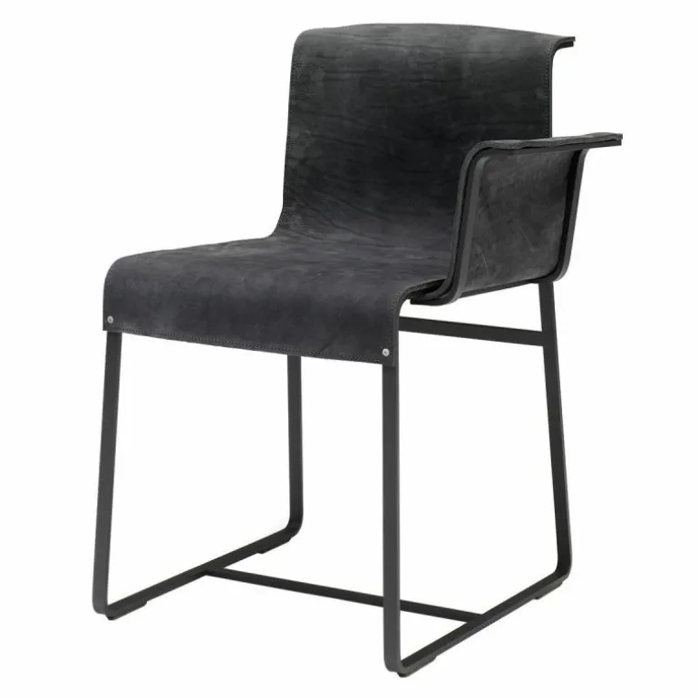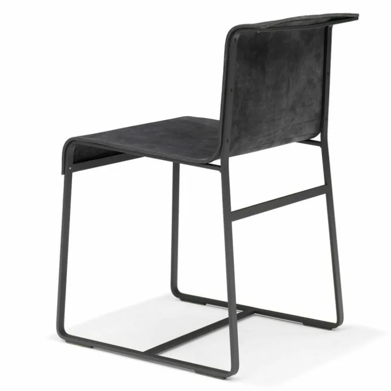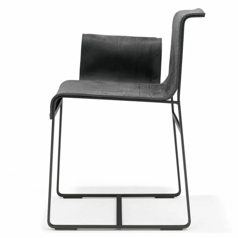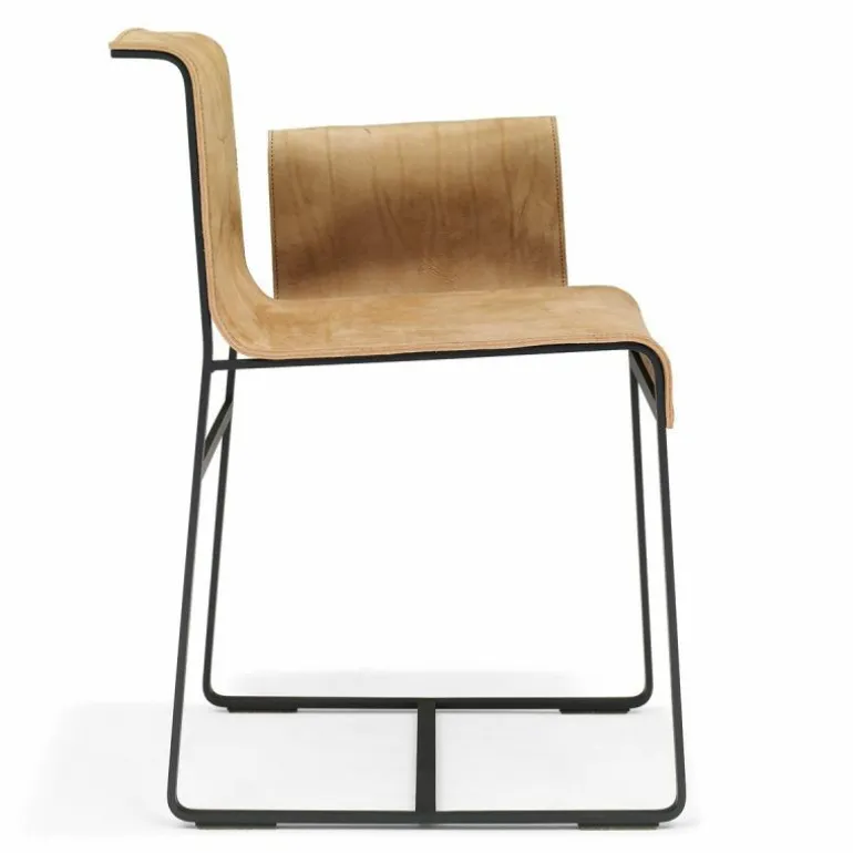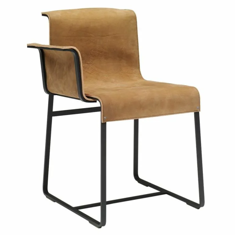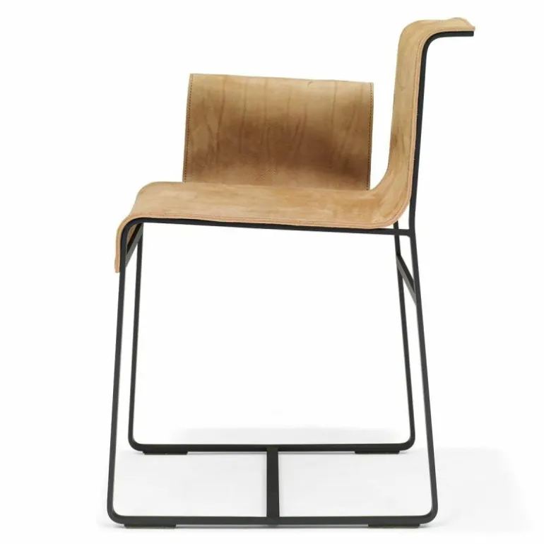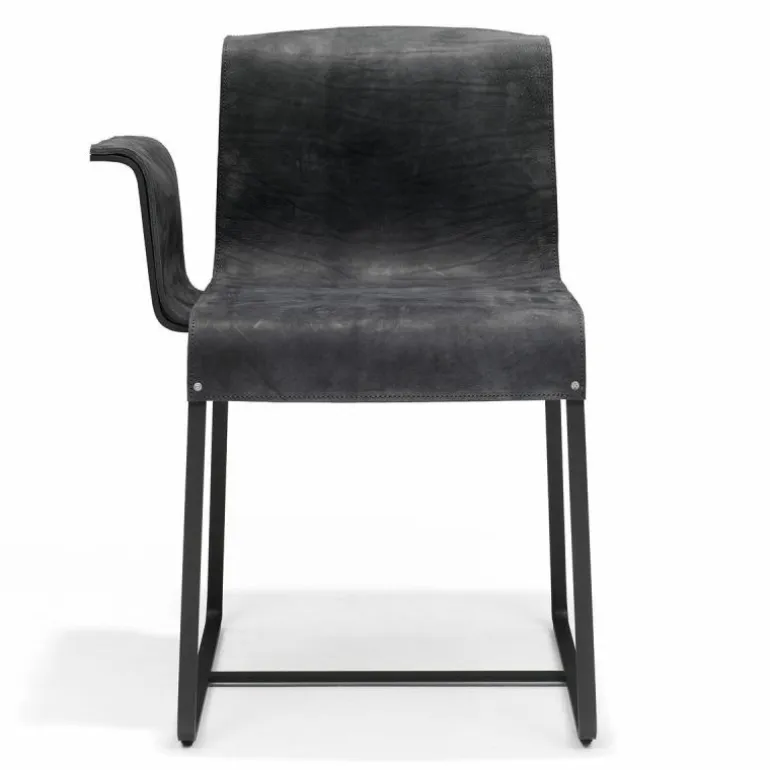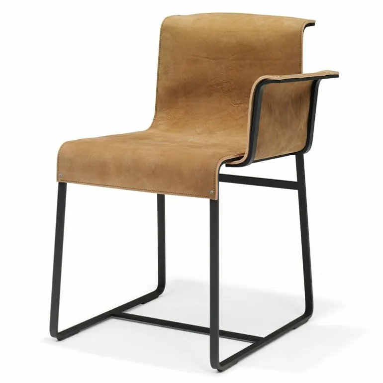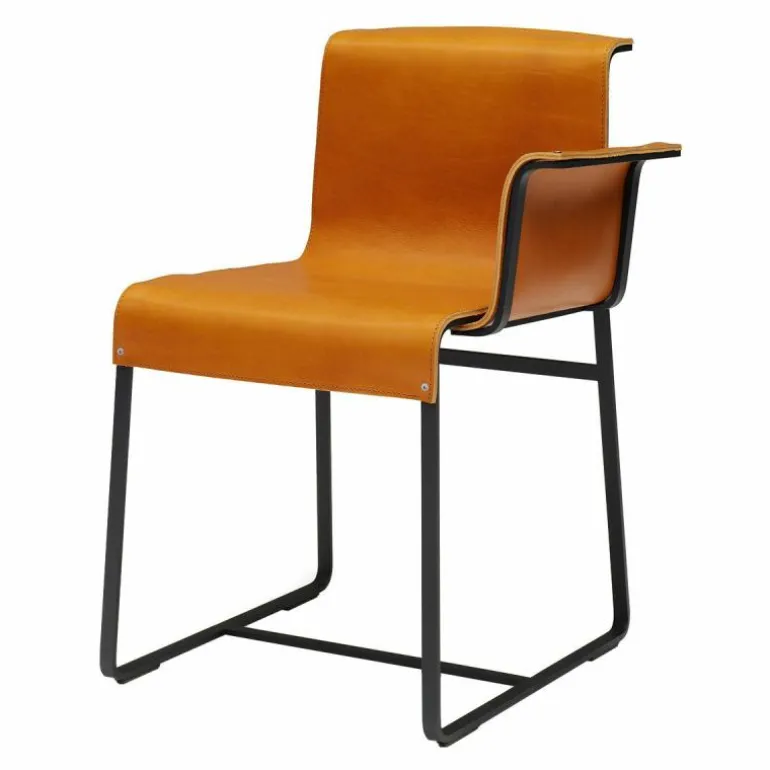 Het frame van de Founded Stoel bestaat uit één stuk staal. Een laser snijdt het materiaal op de juiste maat. Vervolgens wordt het staal vakkundig in de juiste vorm gebogen. Het frame is afgewerkt met een donkergrijze poedercoating in de kleur RAL 7021. Het stevige stalen frame is gecombineerd met een zitting van tuigleer, een leersoort die afkomstig is van volwassen runderen. Het kenmerk zich als steviger, dikker en sterker dan andere leersoorten. Het is stugger en zwaarder en daardoor zeer geschikt voor meubilair. Qua structuur heeft het een natuurlijke uitstraling.r
