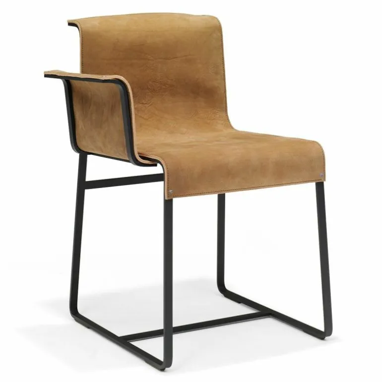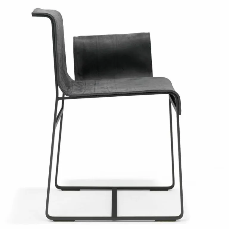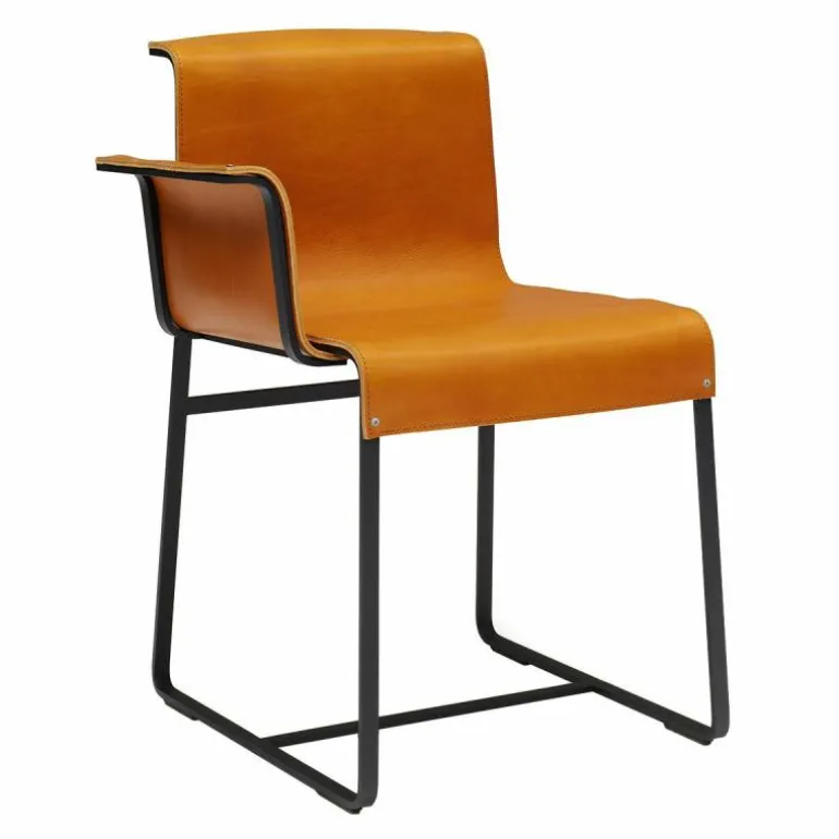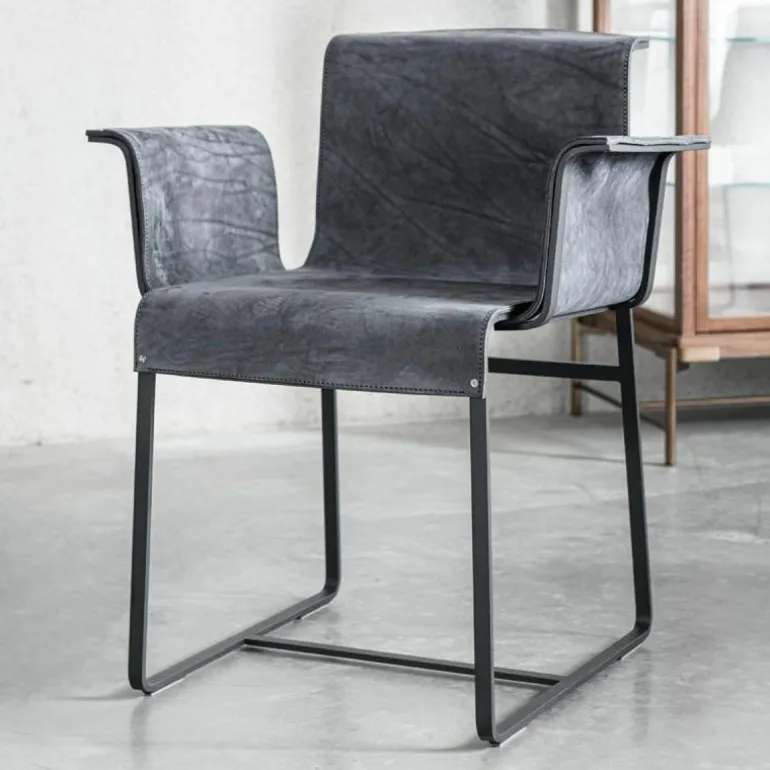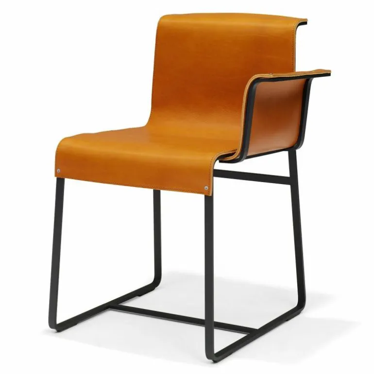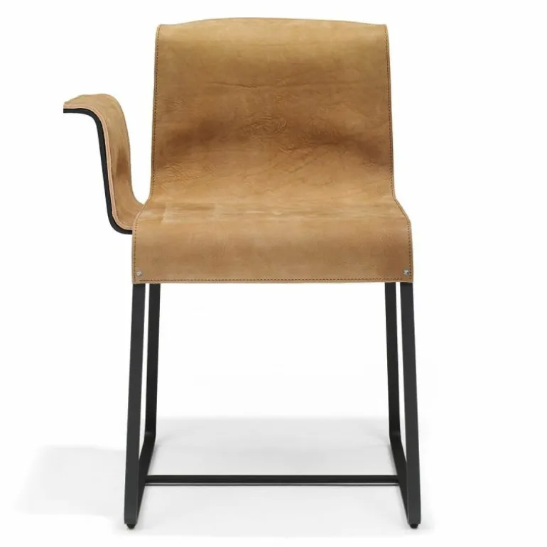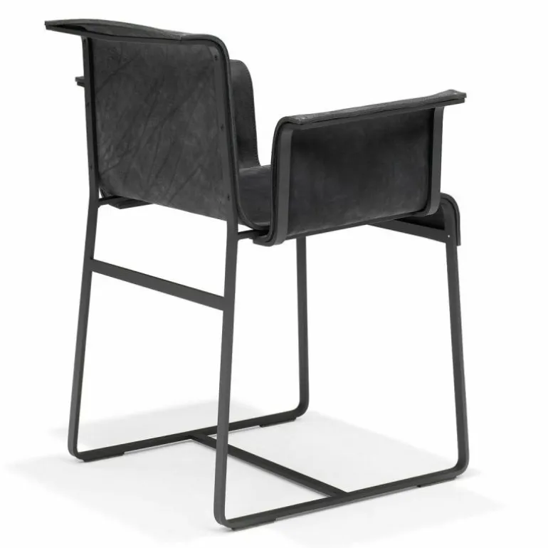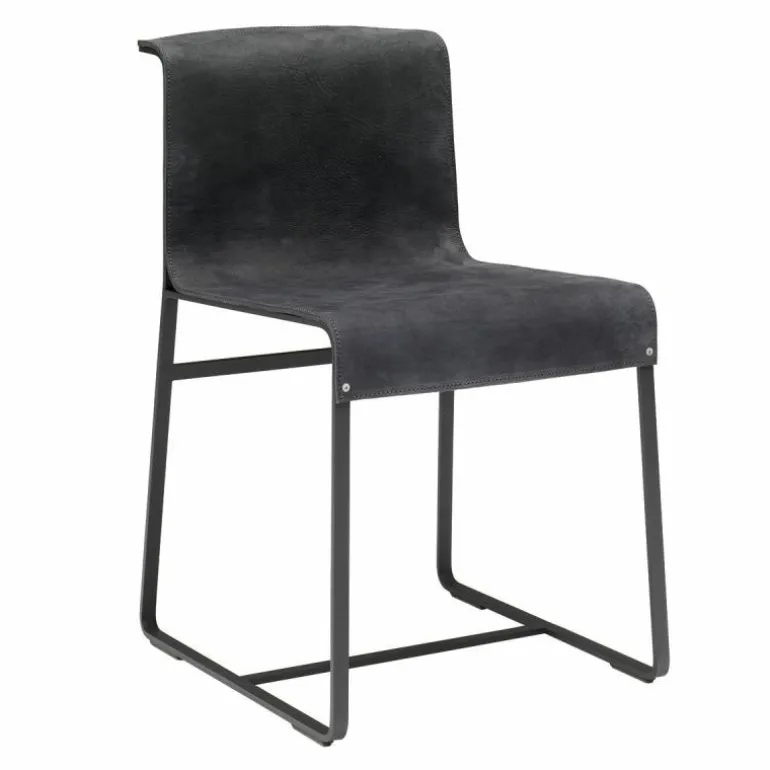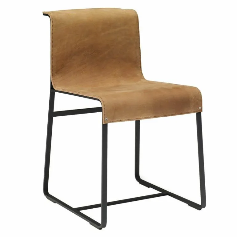 Het frame van de Founded Stoel bestaat uit één stuk staal. Een laser snijdt het materiaal op de juiste maat. Vervolgens wordt het staal vakkundig in de juiste vorm gebogen. Het frame is afgewerkt met een donkergrijze poedercoating in de kleur RAL 7021. Het stevige stalen frame is gecombineerd met een zitting van tuigleer, een leersoort die afkomstig is van volwassen runderen. Het kenmerk zich als steviger, dikker en sterker dan andere leersoorten. Het is stugger en zwaarder en daardoor zeer geschikt voor meubilair. Qua structuur heeft het een natuurlijke uitstraling.r