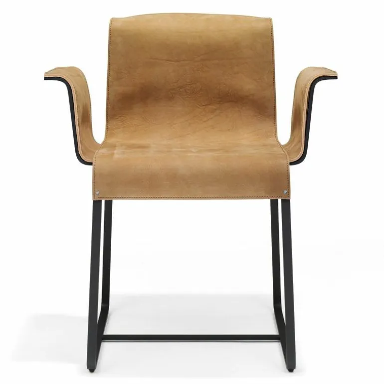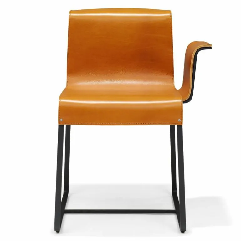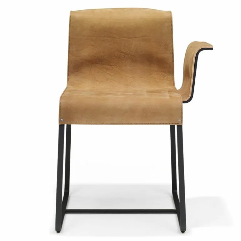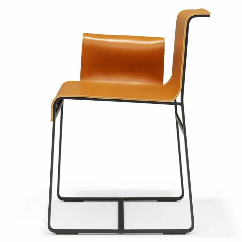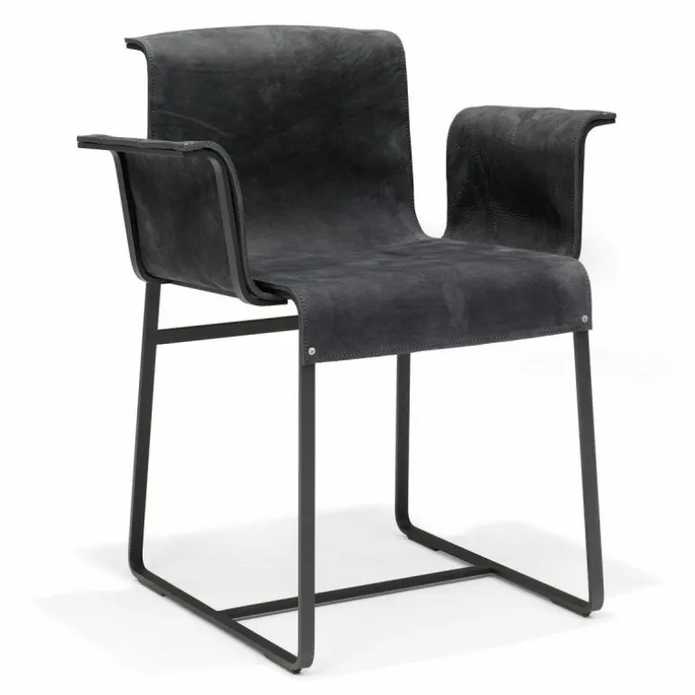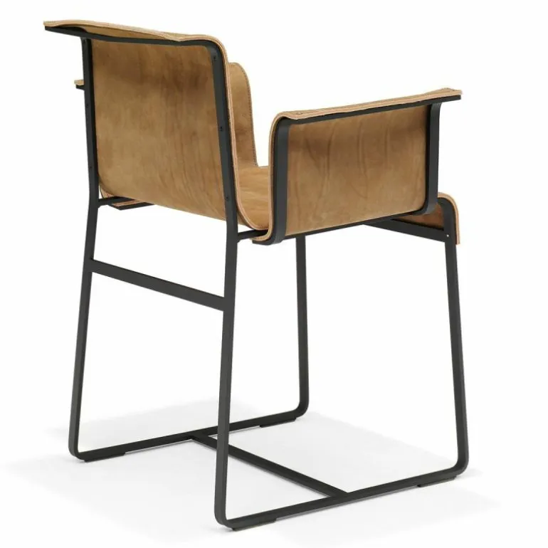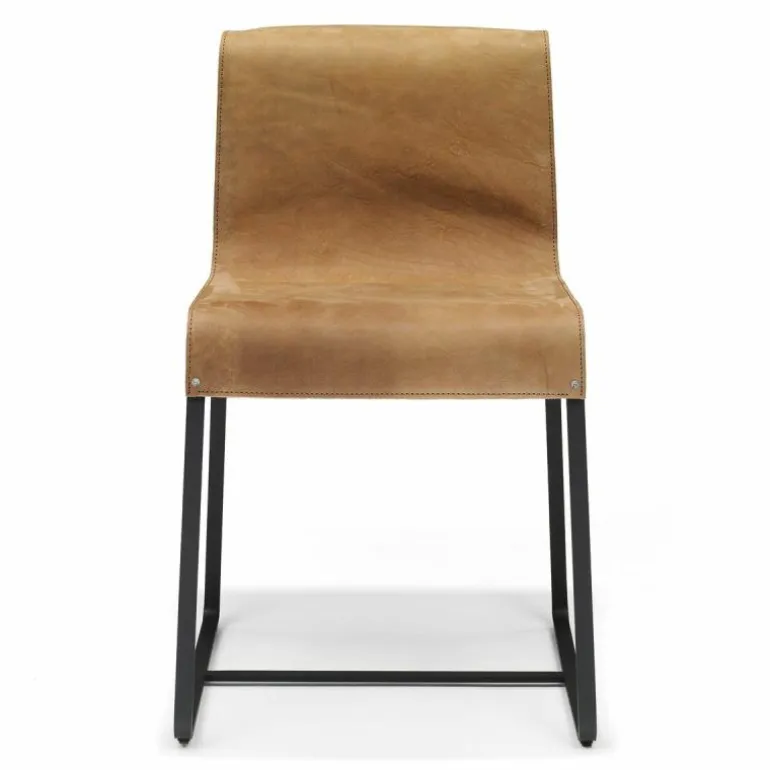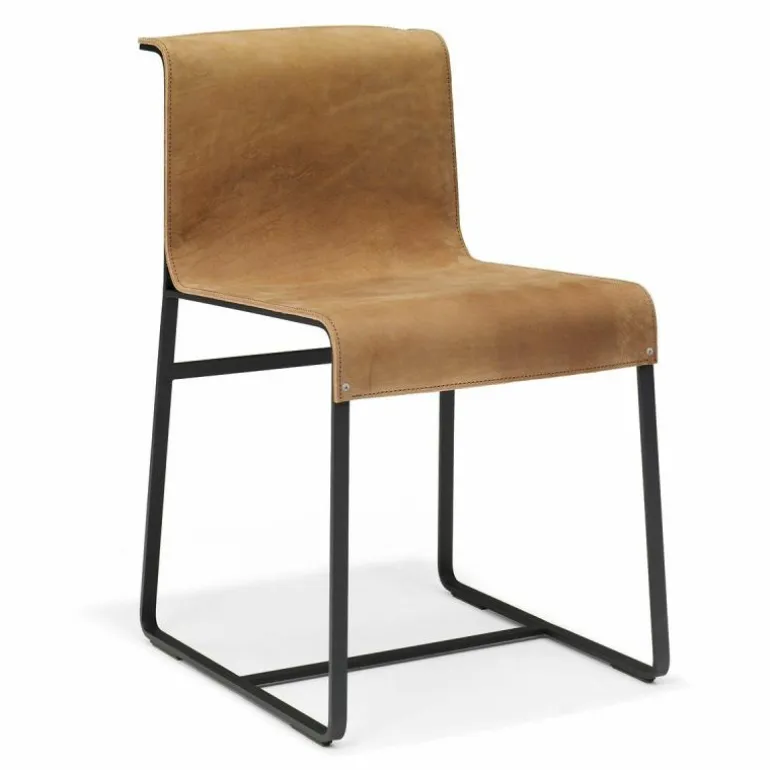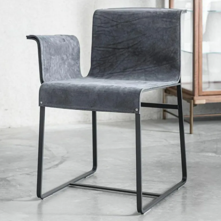 Het frame van de Founded Stoel bestaat uit één stuk staal. Een laser snijdt het materiaal op de juiste maat. Vervolgens wordt het staal vakkundig in de juiste vorm gebogen. Het frame is afgewerkt met een donkergrijze poedercoating in de kleur RAL 7021. Het stevige stalen frame is gecombineerd met een zitting van tuigleer, een leersoort die afkomstig is van volwassen runderen. Het kenmerk zich als steviger, dikker en sterker dan andere leersoorten. Het is stugger en zwaarder en daardoor zeer geschikt voor meubilair. Qua structuur heeft het een natuurlijke uitstraling.r