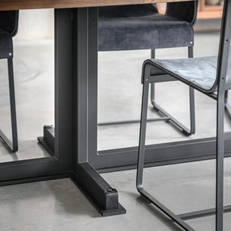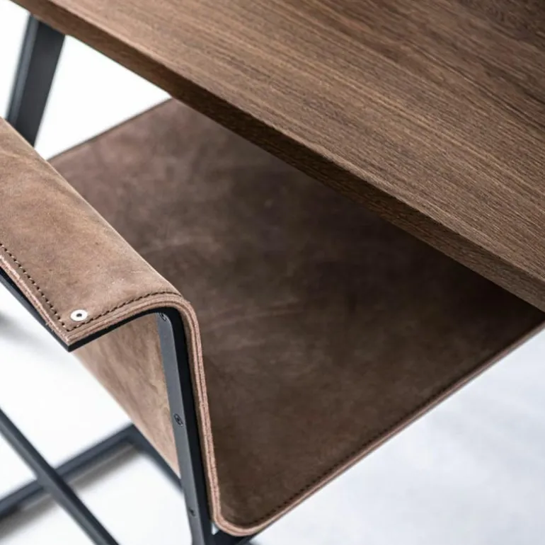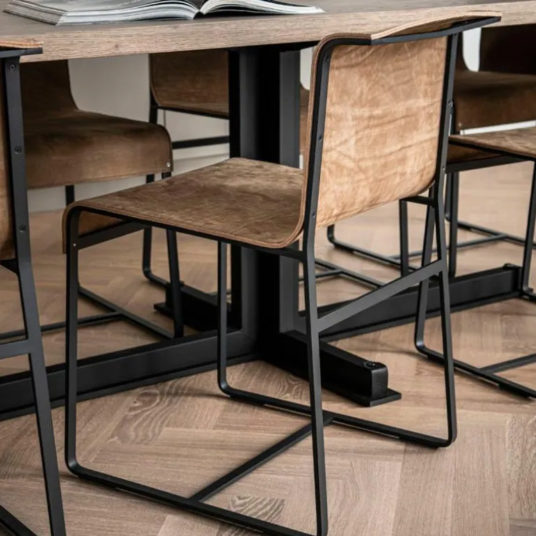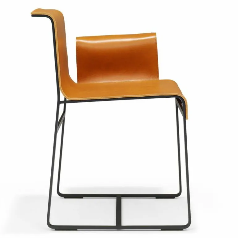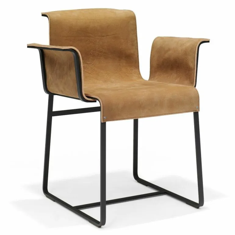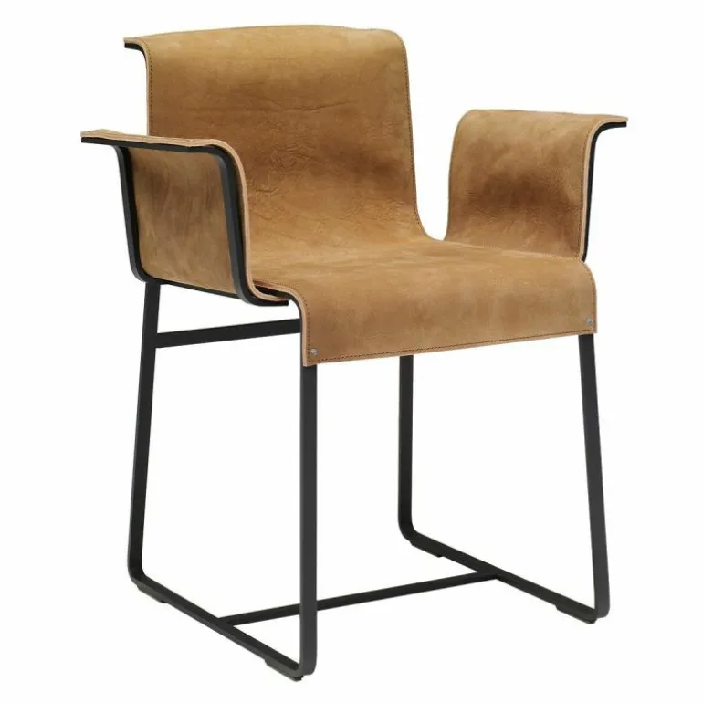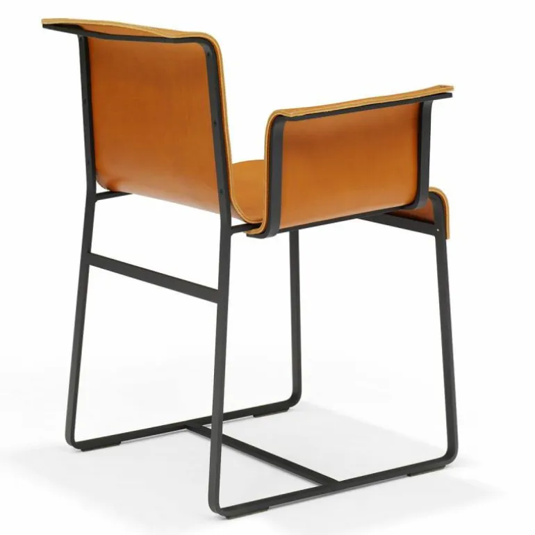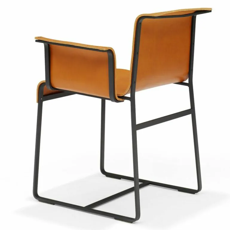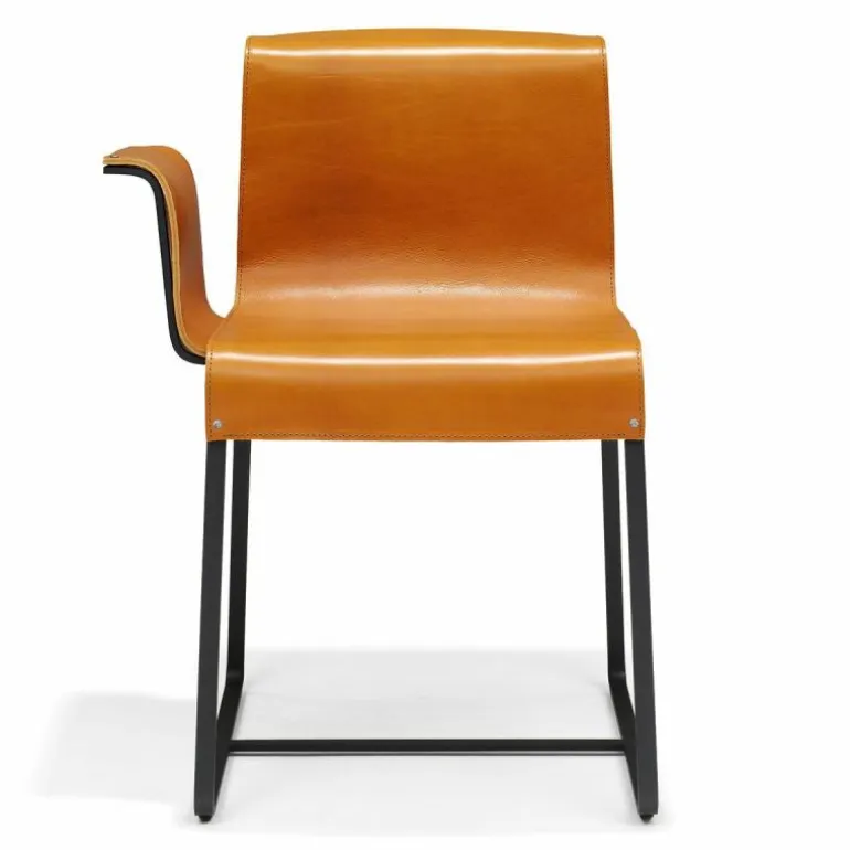 Het frame van de Founded Stoel bestaat uit één stuk staal. Een laser snijdt het materiaal op de juiste maat. Vervolgens wordt het staal vakkundig in de juiste vorm gebogen. Het frame is afgewerkt met een donkergrijze poedercoating in de kleur RAL 7021. Het stevige stalen frame is gecombineerd met een zitting van tuigleer, een leersoort die afkomstig is van volwassen runderen. Het kenmerk zich als steviger, dikker en sterker dan andere leersoorten. Het is stugger en zwaarder en daardoor zeer geschikt voor meubilair. Qua structuur heeft het een natuurlijke uitstraling.r