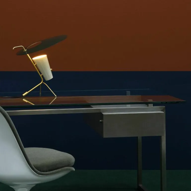 De G24 Tafellamp heeft een ontwerp waarin de vormgeving van verschillende elementen met elkaar spelen. De koker die de lichtbron omhult wordt gedragen door een driepotig statief. De ronde schijf met een ronde opening hangt als een dakje boven de lichtbron. Door de ronde opening in de schijf kan het licht zich verspreiden. Tegelijkertijd wordt een deel van het licht gereflecteerd tegen de onderkant van de schijf. Dit indirecte licht creëert een comfortabel, sfeervol effect. r