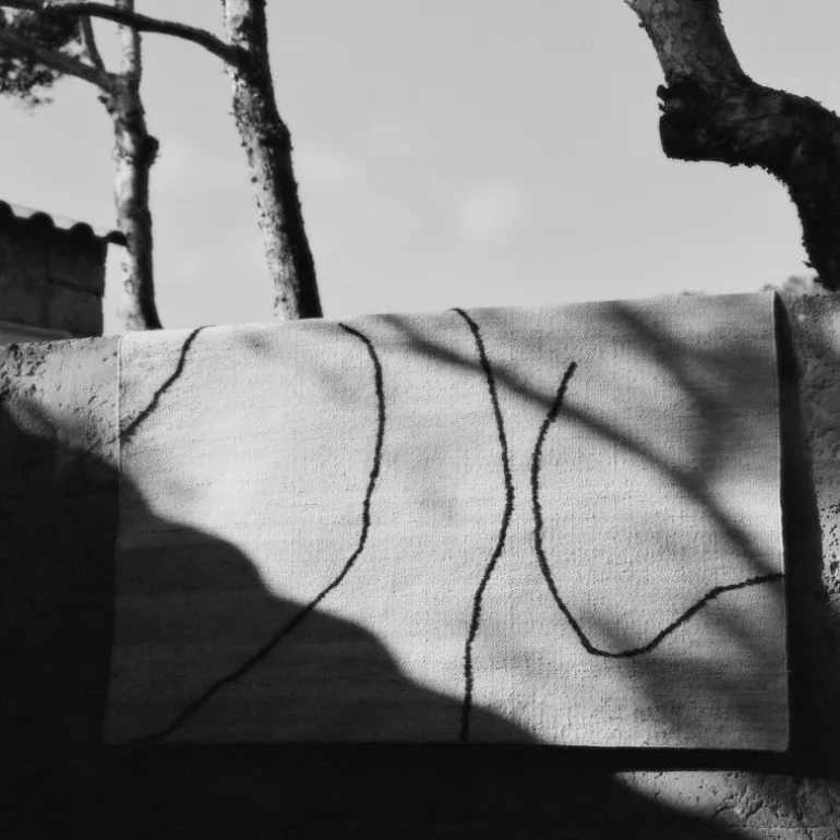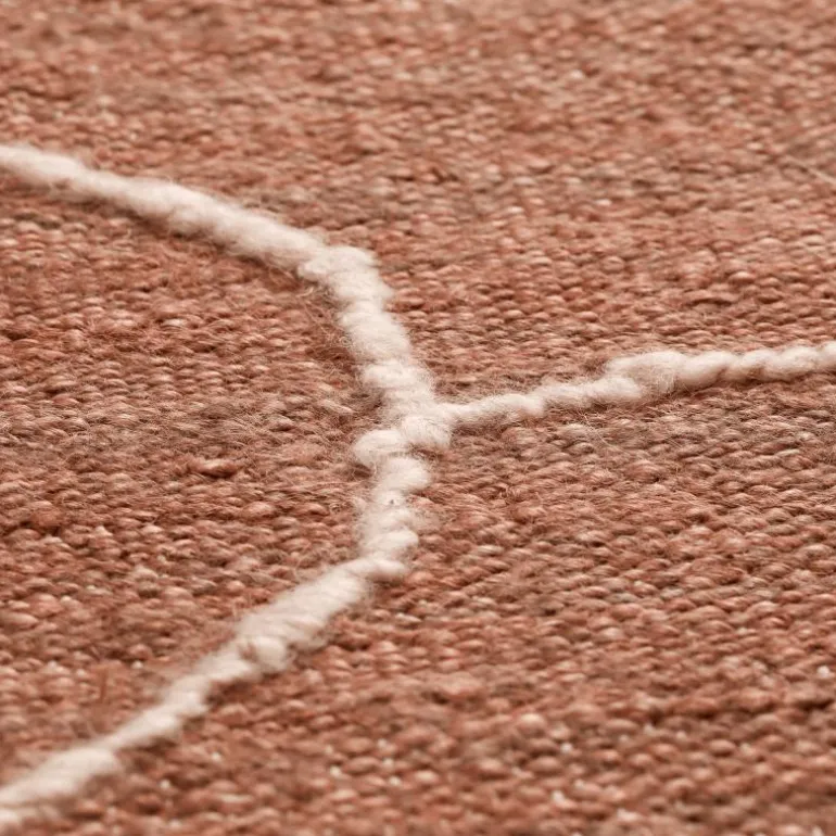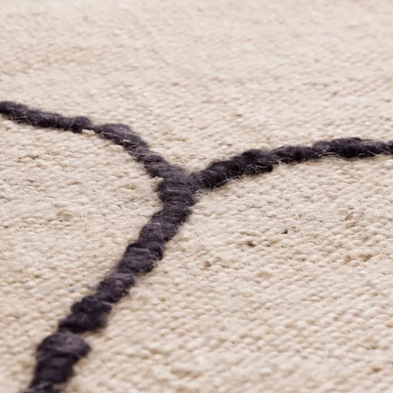 Een kenmerkend element van het ontwerp is het patroon dat wordt gevormd door expressieve lijnen van wol die over het oppervlak zijn aangebracht. Deze lijnen voegen diepte en textuur toe en creëren een subtiele dynamiek. Het resultaat is een abstract patroon dat niet overheersend is, maar dat de vloer tot leven brengt en de ruimte een gelaagde uitstraling geeft. Door dit detail onderscheidt het vloerkleed zich van eenvoudiger geweven tapijten en wordt het meer dan alleen een functioneel gebruiksvoorwerp.