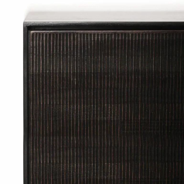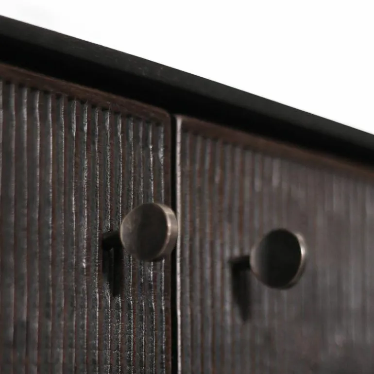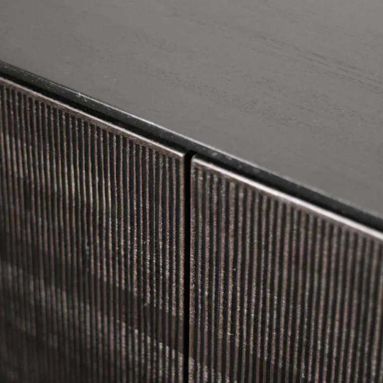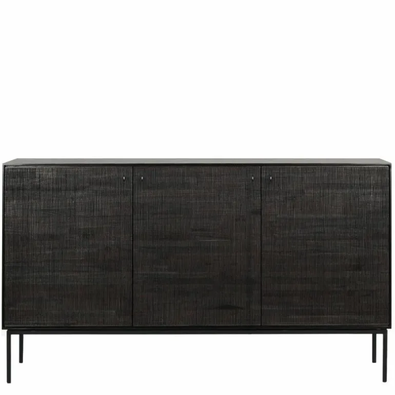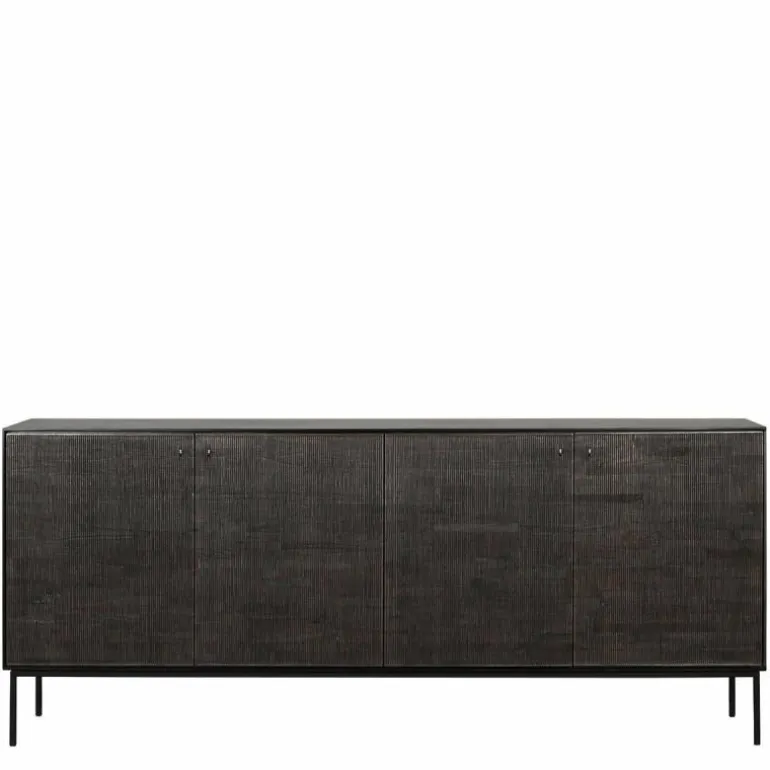 Dit karaktervolle design dankt zijn schitterende uitstraling aan de panelen van donker gekleurd teakhout, dat in het daglicht een prachtig warme gloed uitstraalt. De beschermende vernislaag die op het teakhout is aangebracht, zorgt ervoor dat de natuurlijke uitstraling van het dressoir behouden blijft, maar geeft geen garantie tegen vlekken. Neem vlekken altijd meteen af met een lichtvochtige doek om zo lang mogelijk van dit dressoir te genieten. Het opberggedeelte wordt gedragen door een stevig zwart metalen onderstel met vier poten. Het dressoir is verkrijgbaar in een 3-deurs uitvoering (b. 152 x h. 67 x d. 45 cm.) en een 4-deurs uitvoering (b. 203 x h. 87 x d. 45 cm.)