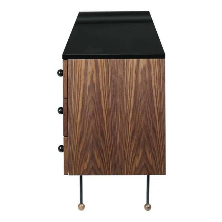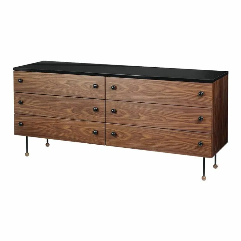Het Gubi Grossman 62 Dressoir met 6 Laden is een ontwerp van Greta M. Grossman.Greta M. Grossman heeft geheel zelf een vruchtbare carrière weten op te bouwen en heeft dit ook nog eens een knappe 40 jaar volgehouden. Met haar talrijke prestaties op meerdere gebieden – industrieel design, interieur en architectuur – en op meerdere continenten – Europa en Noord-Amerika – heeft zij de wereld versteld doen staan. Begonnen in Zweden en later geëmigreerd naar de VS werd zij sterk beïnvloedt door het Europees modernisme en heeft zij een belangrijke bijdrage geleverd aan het Californisch modernisme. Haar bijzondere ontwerpen werden in de jaren ’40 en ’50 in de meest bekende musea over de gehele wereld tentoongesteld, waaronder het MoMA in New York en The National Museum in Stockholm. Door ontwerpen van Greta M. Grossman op te nemen in de collectie van het Deense merk Gubi is deze prachtige vrouwelijke ontwerper weg uit de vergetelheid en heeft zij een verdiende comeback gekregen. Gubi is van oorsprong opgericht door het echtpaar Lisbeth en Gubi Olsen in het jaar 1967. Nu, bijna 50 jaar later, is Gubi een echt Deens familiebedrijf én hebben zij bovendien wereldwijde bekendheid als innovatief designmerk. Ze zien zichzelf als schatzoekers waarbij nieuwsgierigheid, moed én intuïtie de belangrijkste componenten voor hun succes zijn. De collectie van Gubi wordt gekenmerkt door eclectische, intercontinentale ontwerpen die de lijnen tussen het verleden en de toekomst laten vervagen. Het uitgebreide assortiment van zeer esthetische, tot nadenken stemmende ontwerpen, wordt keer op keer gekenmerkt door eenvoud, originele materialen en innovatieve technieken die tijd en ruimte weten te trotseren. Deze kenmerken zijn ook terug te vinden in het Grossman Dressoir. Dit dressoir behoort tot de “62-series”. Het Grossman Dressoir 6 laden van Greta M. Grossman is vervaardig uit blank gelakt Amerikaans walnoothout, hoogglans AICA laminaat in de kleur zwart en gepoedercoat metaal. De breedte van het dressoir bedraagt 160 centimeter, de hoogte is 72 centimeter en het dressoir heeft een diepte van 45 centimeter.