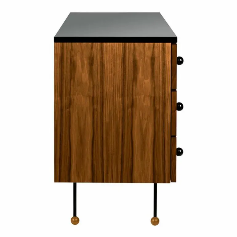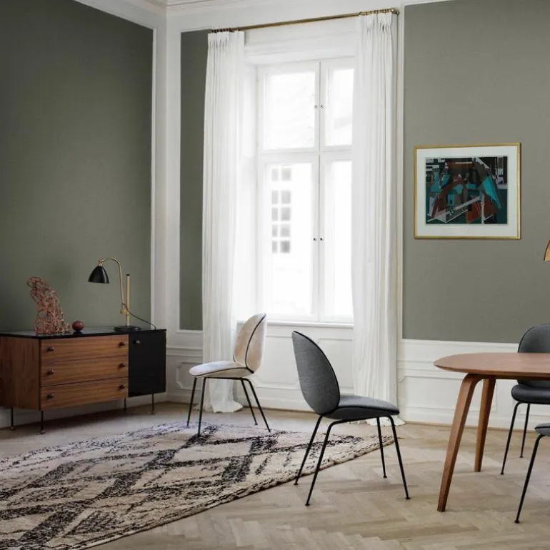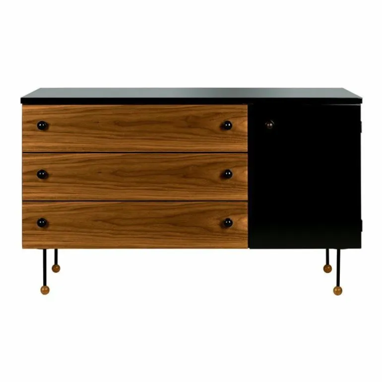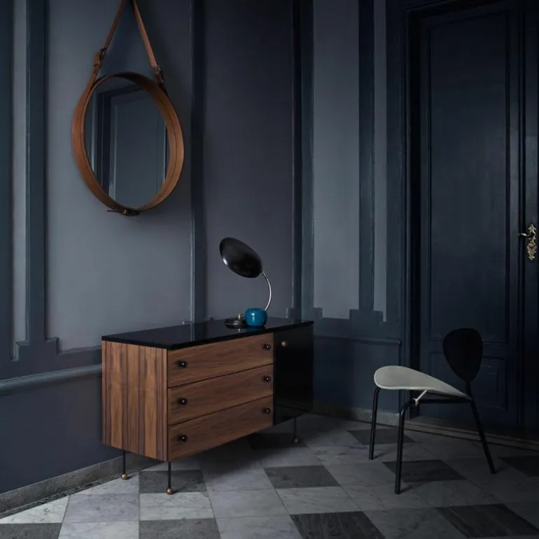 Het Gubi Grossman Dressoir met 3 laden is een ontwerp van Greta M. Grossman.Greta M. Grossman heeft geheel zelf een vruchtbare carrière weten op te bouwen en heeft dit ook nog eens een knappe 40 jaar volgehouden. Met haar talrijke prestaties op meerdere gebieden – industrieel design, interieur en architectuur – en op meerdere continenten – Europa en Noord-Amerika – heeft zij de wereld versteld doen staan. Begonnen in Zweden en later geëmigreerd naar de VS werd zij sterk beïnvloedt door het Europees modernisme en heeft zij een belangrijke bijdrage geleverd aan het Californisch modernisme. Haar bijzondere ontwerpen werden in de jaren ’40 en ’50 in de meest bekende musea over de gehele wereld tentoongesteld, waaronder het MoMA in New York en The National Museum in Stockholm. Door ontwerpen van Greta M. Grossman op te nemen in de collectie van het Deense merk Gubi is deze prachtige vrouwelijke ontwerper weg uit de vergetelheid en heeft zij een verdiende comeback gekregen. Gubi is van oorsprong opgericht door het echtpaar Lisbeth en Gubi Olsen in het jaar 1967. Nu, bijna 50 jaar later, is Gubi een echt Deens familiebedrijf én hebben zij bovendien wereldwijde bekendheid als innovatief designmerk. Zijzelf zien zich als schatzoekers waarbij nieuwsgierigheid, moed én intuïtie de belangrijkste componenten voor hun succes zijn. De collectie van Gubi wordt gekenmerkt door eclectische, intercontinentale ontwerpen die de lijnen tussen het verleden en de toekomst laten vervagen. Het uitgebreide assortiment van zeer esthetische, tot nadenken stemmende ontwerpen, wordt keer op keer gekenmerkt door eenvoud, originele materialen en innovatieve technieken die tijd en ruimte weten te trotseren. Deze kenmerken zijn ook terug te vinden in het Grossman Dressoir.Het Grossman Dressoir met 3 laden van Gubi is vervaardig uit blank gelakt Amerikaans walnoothout, hoogglans AICA laminaat in de kleur zwart en gepoedercoat metaal. De breedte van het dressoir bedraagt 120 centimeter, de hoogte is 72 centimeter en het dressoir heeft een diepte van 45 centimeter. Het dressoir is voorzien van 3 laden en een opbergvak dat mooi weggewerkt is achter de zwarte hoogglans deur.