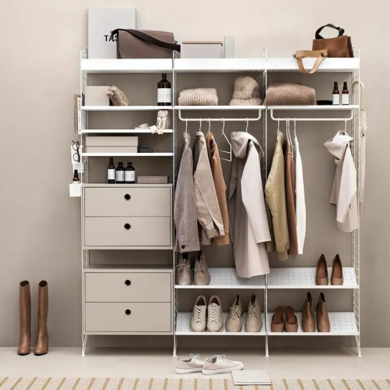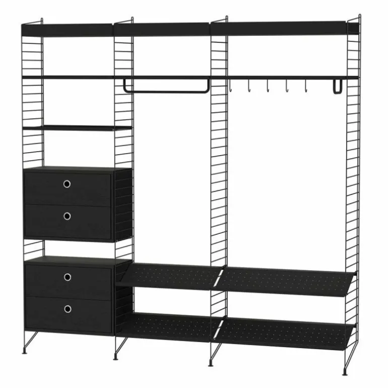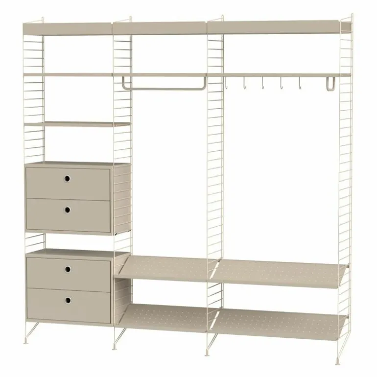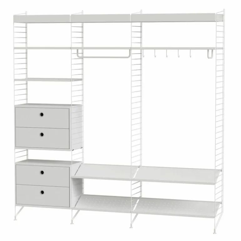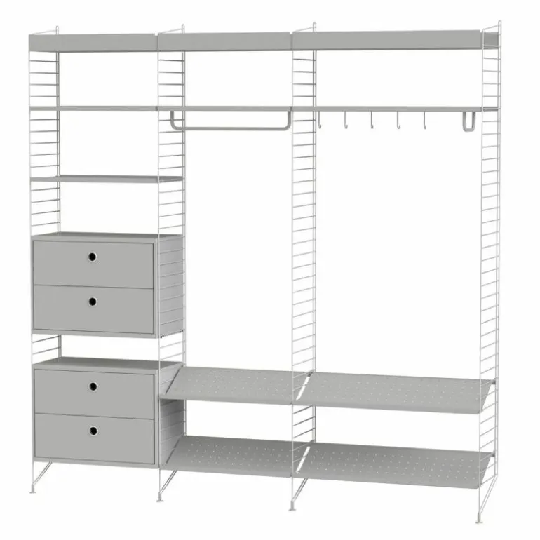 Deze combinatie past perfect in een ruimere gang of hal met een lange en hoge muur. Het systeem is zeer compleet en biedt oplossingen voor alles dat u in de gang zou willen opbergen. De basis van deze configuratie wordt gevormd door vier rekken die sierlijk de grond raken. De metalen rekken zijn maar liefst 2 meter lang, wat zorgt voor een stijlvol grafisch en ruimtelijk effect. De rekken staan met elkaar in verbinding door vier schoenrekken, twee ladekasten met in totaal vier lades, vier planken met lage rand en drie planken met hoge opstaande rand. Daarnaast horen twee ophangrekken en een set van vijf haken bij deze configuratie. r