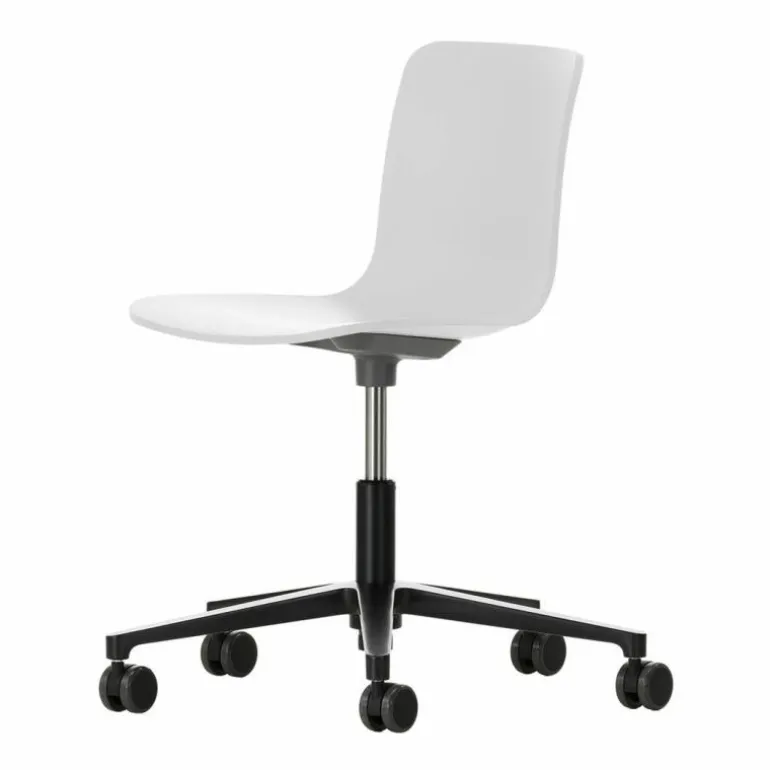 De Hal Studio Bureaustoel van Jasper Morrison heeft een zitschaal vervaardigd uit polypropyleen en een onderstel van spuitgietaluminium, afgewerkt met een basic dark poedercoating. Deze in hoogte verstelbare bureaustoel, voorzien van doelmatige zwenkwielen, vervult alle essentiële eisen waaraan een bureaustoel moet voldoen. Dat het onderstel bovendien draaibaar is en de stoel voorzien is van een schokabsorberende zitting draagt hier alleen maar aan bij. De zitschaal – verkrijgbaar in basic dark, wit, klimop, ijsgrijs, baksteen, warmgrey, chocolade en oranje – zorgt bovendien voor een elegante uitstraling. De Hall Bureaustoel is een kantoorstoel die perfect is voor ieder (thuis)kantoor! De bureaustoel is 47 centimeter breed en 49 centimeter diep. De hoogte van de stoel varieert van minimaal 74 centimeter – met zithoogte 37.5 centimeter – tot maximaal 86 centimeter in hoogte – met zithoogte 49 centimeter. De diameter van het onderstel bedraagt 73 centimeter. r