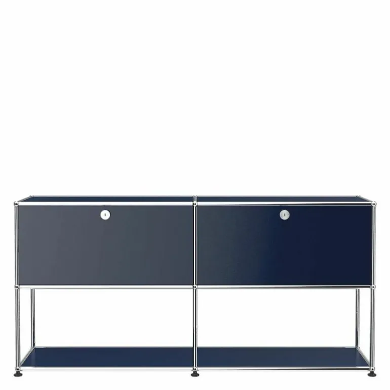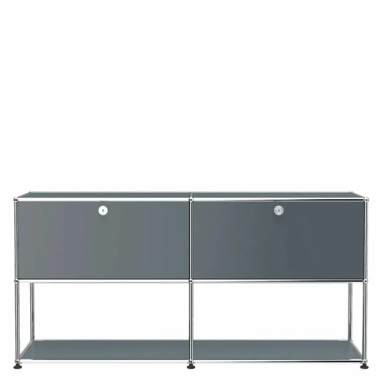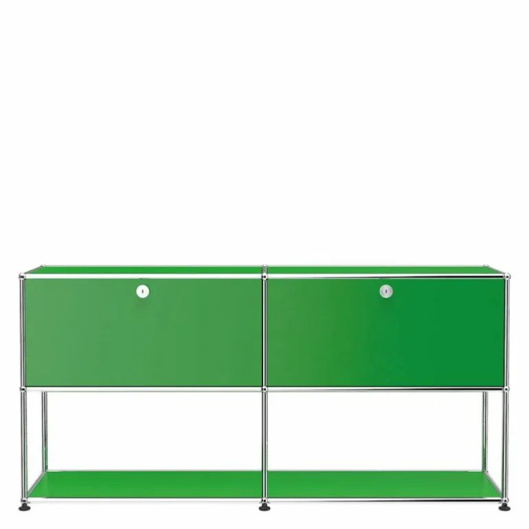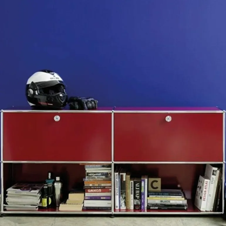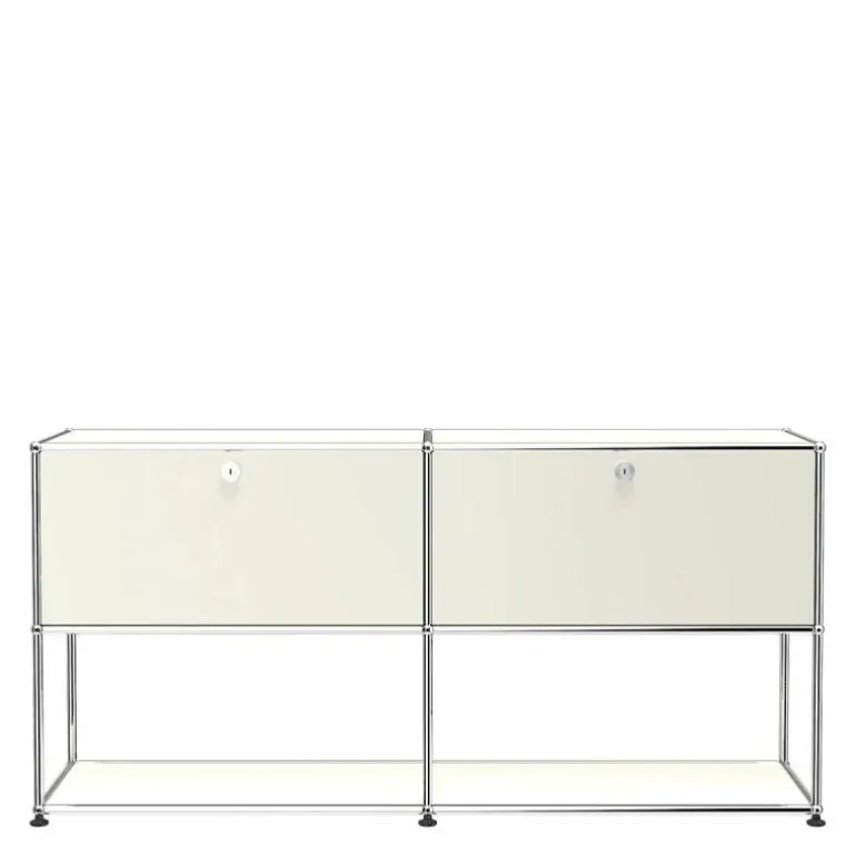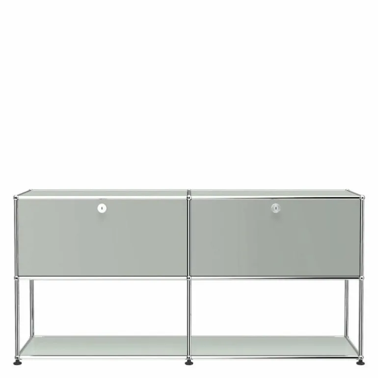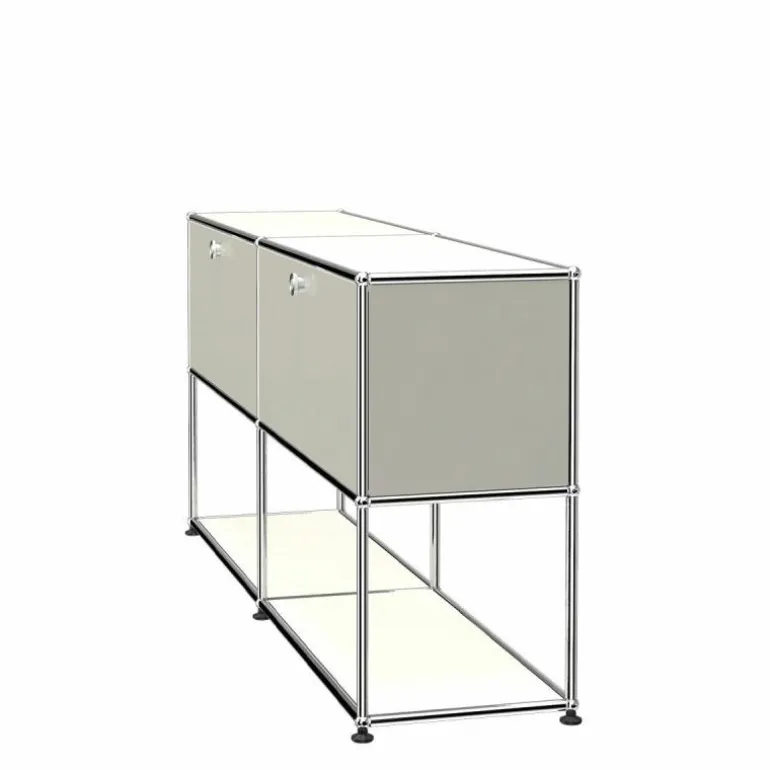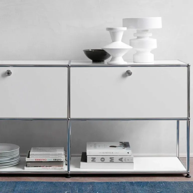 De Haller 2×2 Credenza (F2) Kast is een voorbeeld van de vele mogelijke uitvoeringen van het USM Haller systeem. In deze uitvoering is de kast opgebouwd uit vier compartimenten met twee gesloten compartimenten en twee volledig open compartimenten. De twee klepdeuren van de r