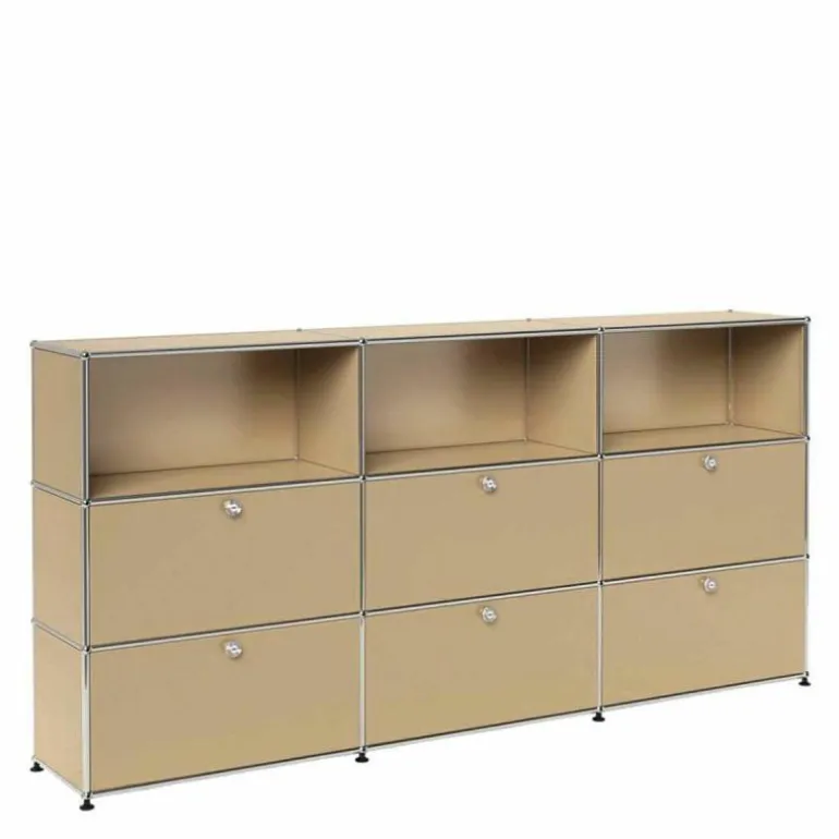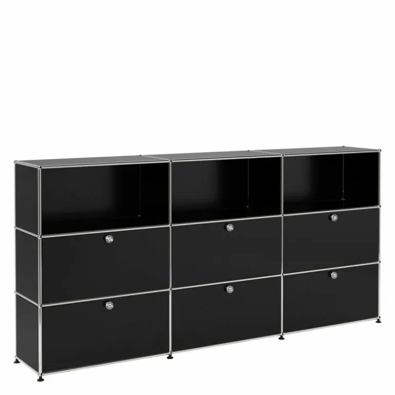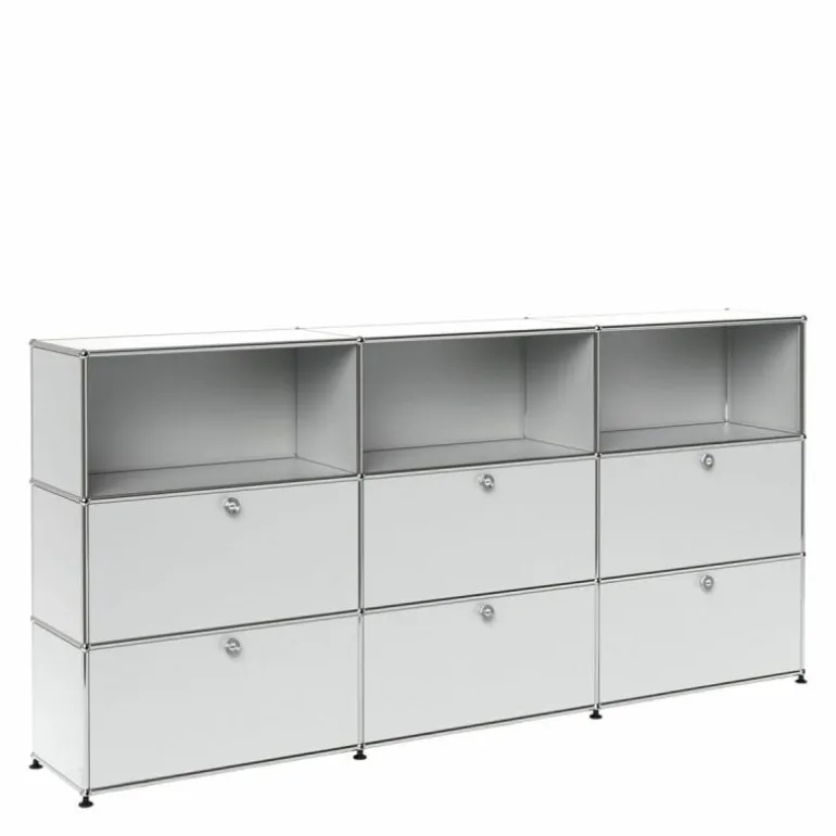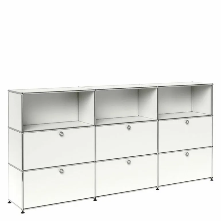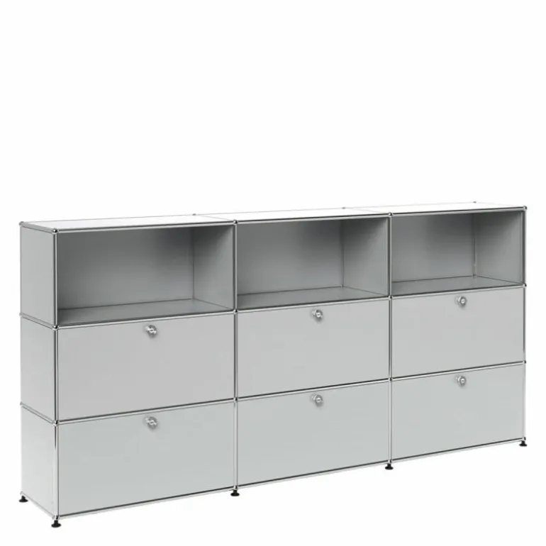 Het Haller Dressoir Combinatie 2 is een voorbeeld van de vele mogelijke uitvoeringen van het USM Haller systeem. In deze uitvoering is de kast opgebouwd uit negen compartimenten waarbij de onderste twee rijen zijn voorzien van horizontale klapdeuren en de bovenste rij aan de voorzijde open is. Zo biedt het meubel voldoende ruimte voor het uit het zicht opbergen van boeken en apparatuur maar is het ook genoeg ruimte om uw favoriete accessoires tentoon te stellen in de open vakken.r