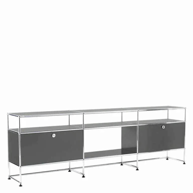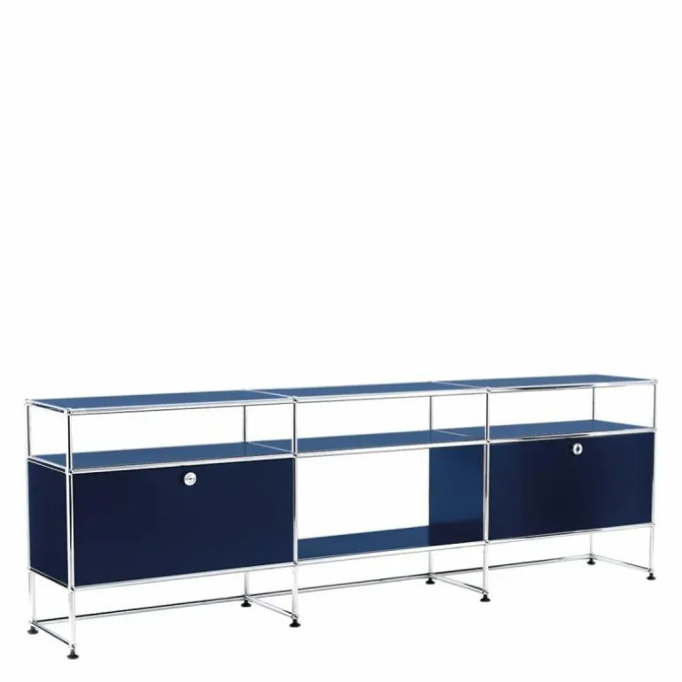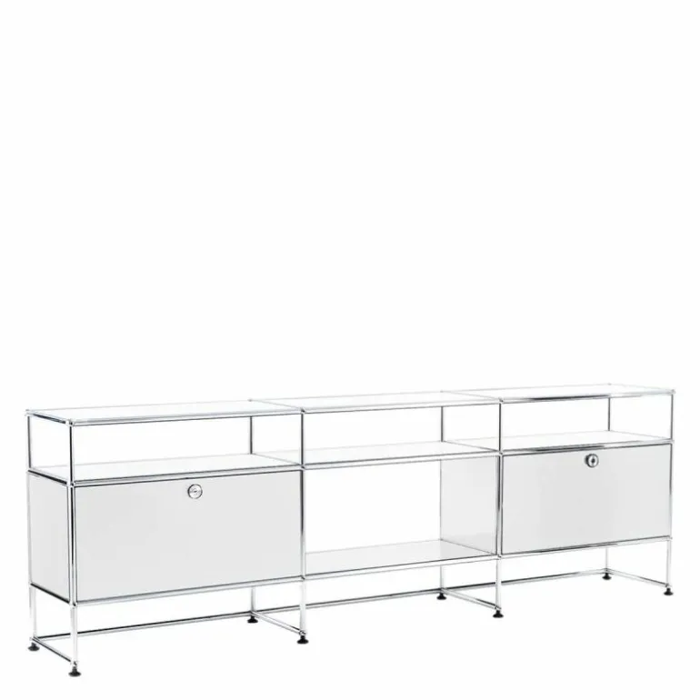 Doordat USM alleen de meest hoogwaardige en verfijnde materialen bij de productie van het Haller Dressoir gebruikt, heeft het meubel een zeer lange levensduur. Het verchroomde stalen frame ziet er bijzonder stijlvol uit en is uitgevoerd met de legendarische gepatenteerde USM-verbindingskogels. Het frame van het USM Dressoir is gemaakt van gepoedercoat plaatstaal. Met een keuze uit 14 kleuren is er voor elke woonstijl een passende USM Haller Kast. De acht poten zorgen voor een stabiele plaatsing van de kast. r