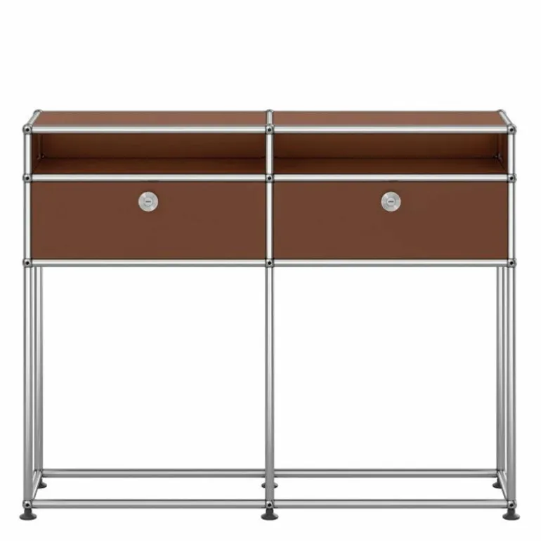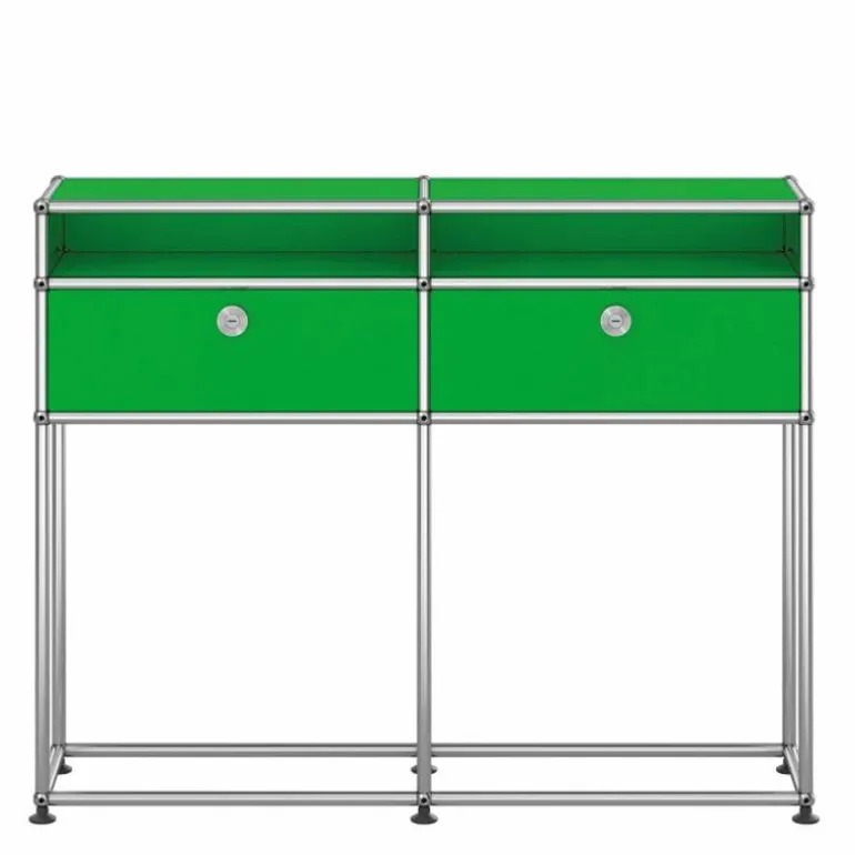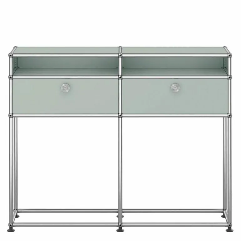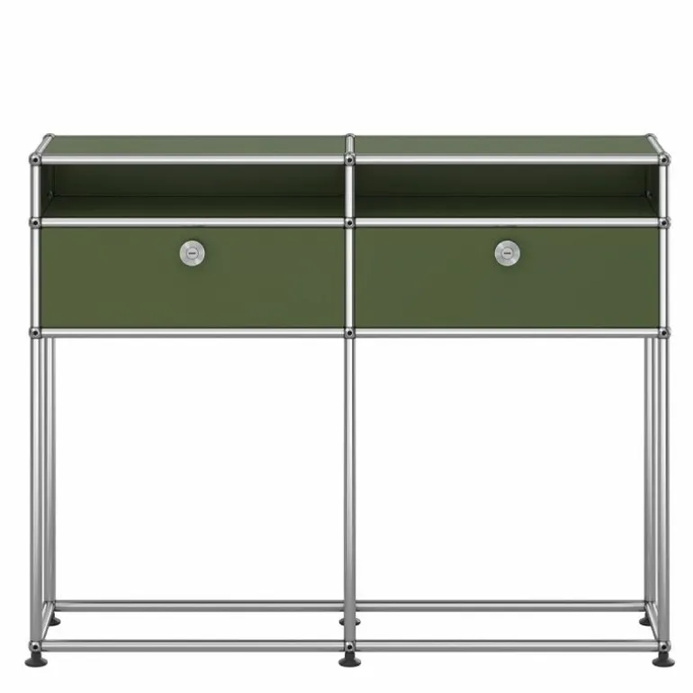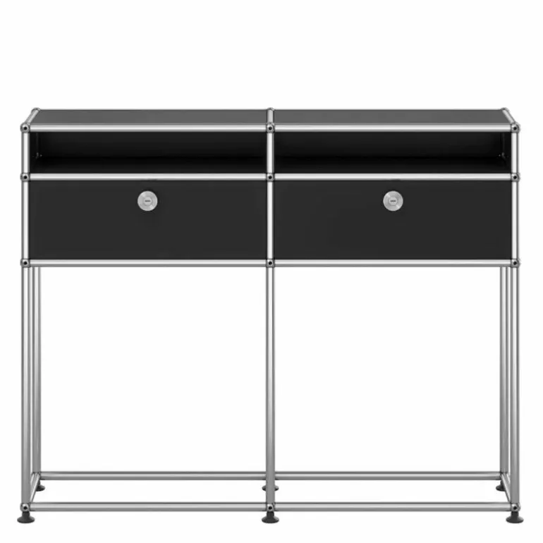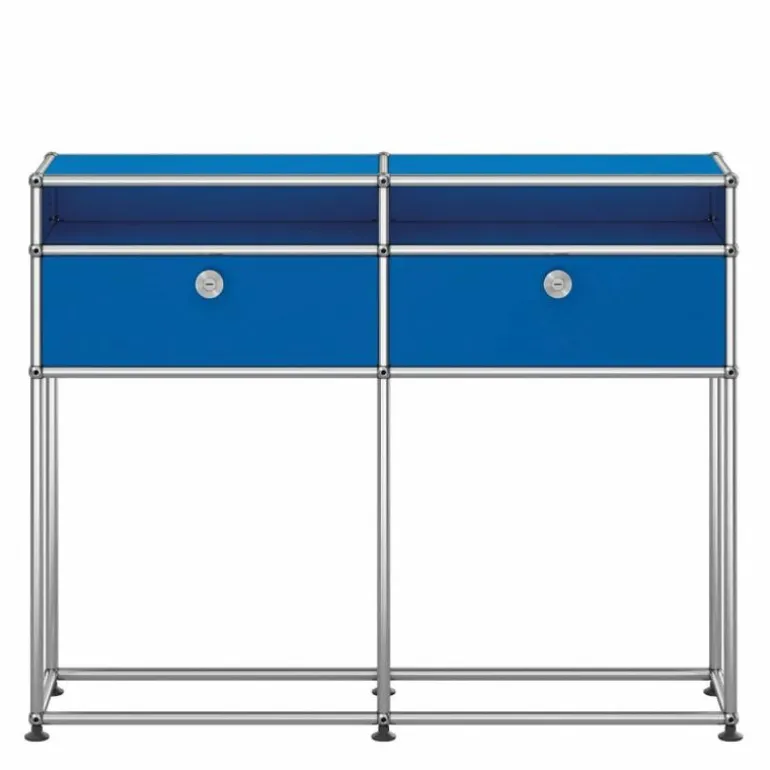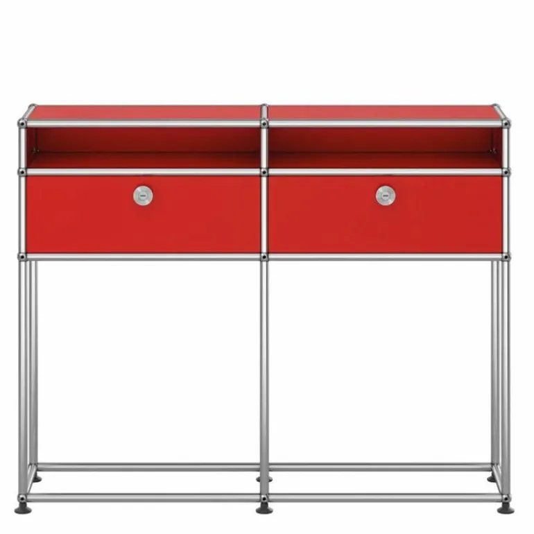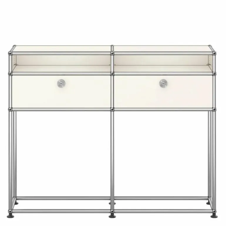Het dressoir heeft een moderne, maar ook decoratieve uitstraling. Elke ruimte zowel thuis als op kantoor vraagt een andere mate van opbergruimte. De Haller kasten, rekken en dressoirs bieden deze ruimte en vormen een fraai meubelstuk in het interieur. In deze uitvoering past het meubel perfect in de hal of entree. De twee gesloten kastjes bieden opbergruimte voor kleine accessoires en in de open vakken kunnen bijvoorbeeld papieren, tijdschriften of boeken worden opgeborgen. Het grote voordeel van het USM Haller systeem is het feit dat de huidige kast altijd kan worden uitgebreid met extra elementen of accessoires voor de kastindeling. Enkele extra opties zijn het toepassen van sloten voor de deuren, uitschuifbare lades en bakken voor de indeling van de kast. Dit model kast kan dus altijd nog extra worden aangepast naar uw individuele wensen.r