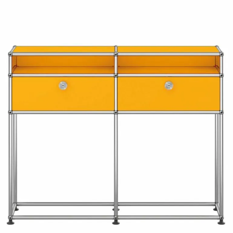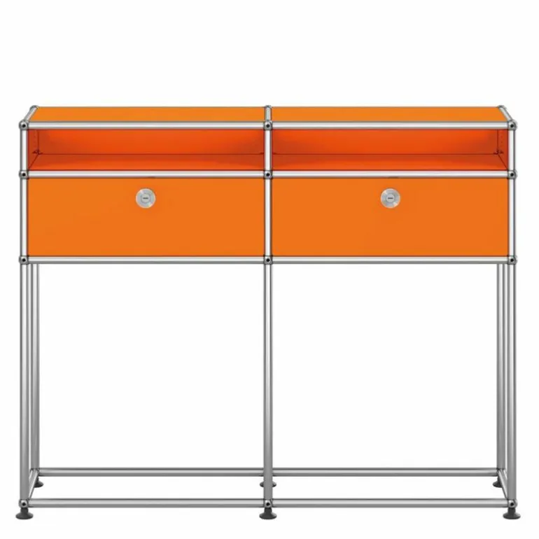 De Haller Sideboard (M51) is gemaakt van gepoedercoat plaatstaal en wordt omgeven door een verchroomd, stalen frame welke het meubel een stijlvol uiterlijk geeft. Bovendien is het meubel voorzien van gepatenteerde USM-verbindingskogels. Met een keuze uit maar liefst veertien kleuren is er voor elke woonstijl een passend meubel samen te stellen. Het ontwerp is geplaatst op zes poten voor een stabiele plaatsing van de wandkast.r