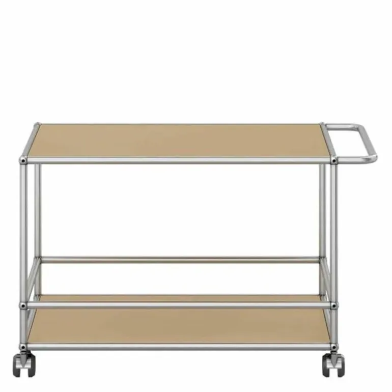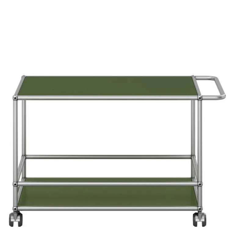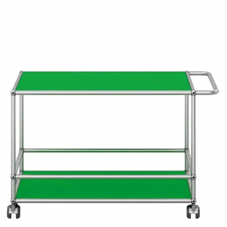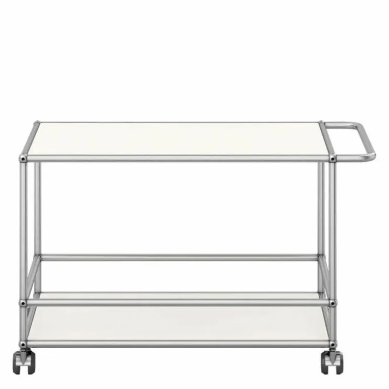 Zo is de USM Haller Trolley L een zeer stijlvolle serveerwagen die vanwege het compacte formaat op veel plekken van pas komt. In de keuken is de trolley een handige opbergplek of koffiebar. Ook bij feestjes en verjaardagen kan de trolley als kleine mobiele bar of cocktailbar worden gebruikt. Het fraaie design van de trolley maakt het tot een meubelstuk dat gezien mag worden. De verrijdbare Haller Trolley heeft vier zwenkwielen om de trolley makkelijk te kunnen verplaatsen. Op het onderste blad van de trolley is voldoende plek voor servies, flessen en andere keukenaccessoires. Het bovenste blad leent zich uitstekend voor het presenteren van een cocktailshaker, ijsemmer of mooi glaswerk. r