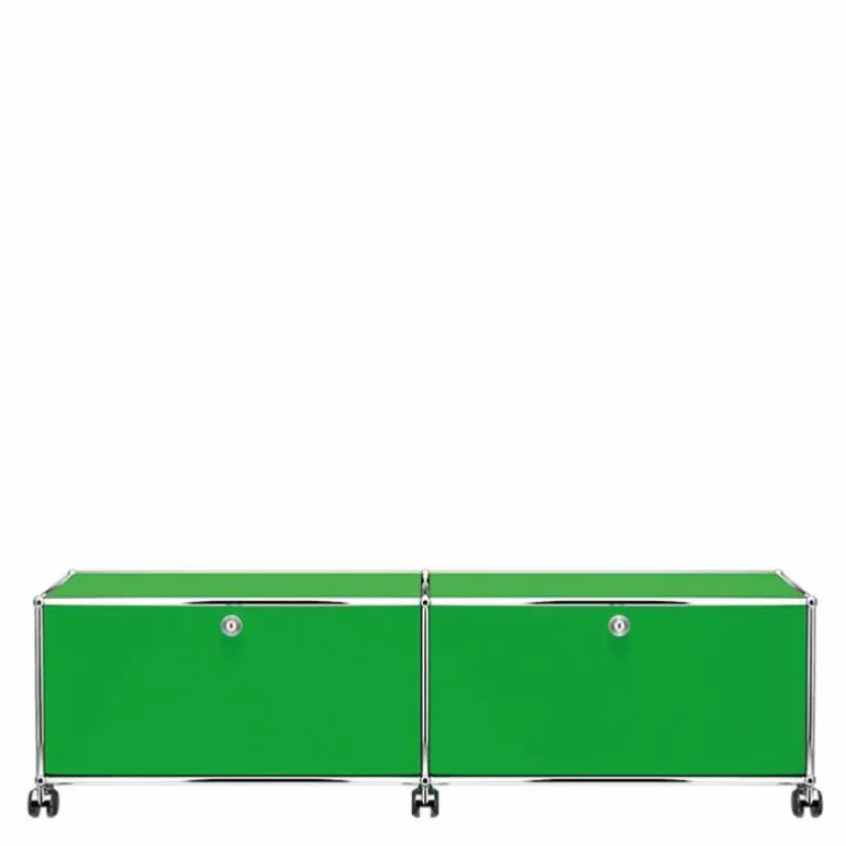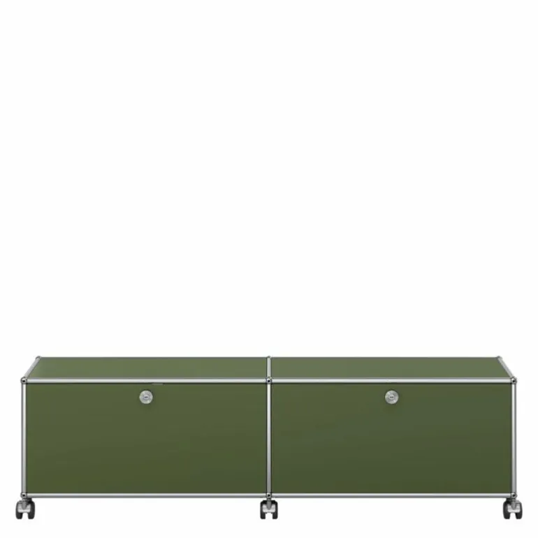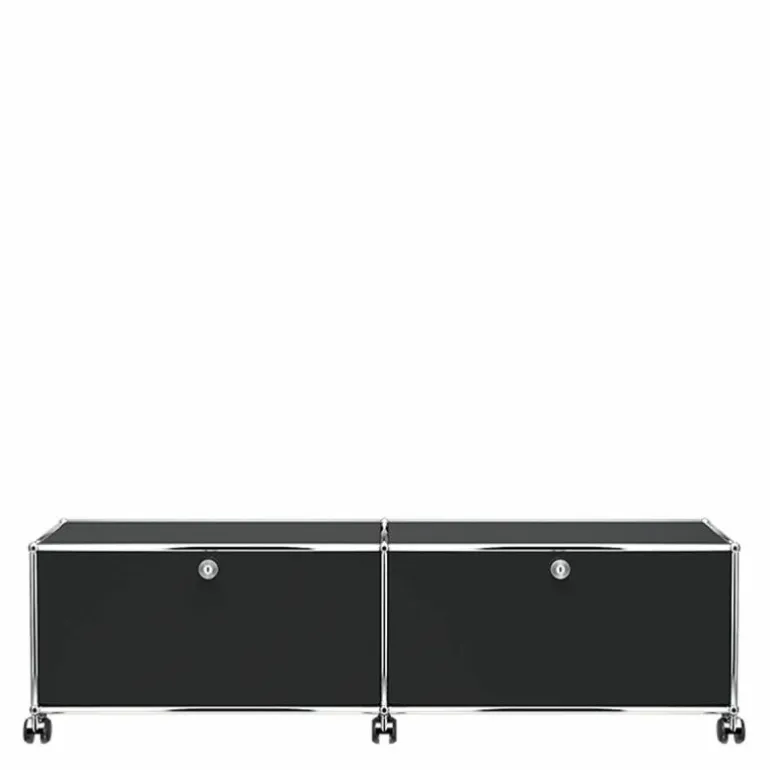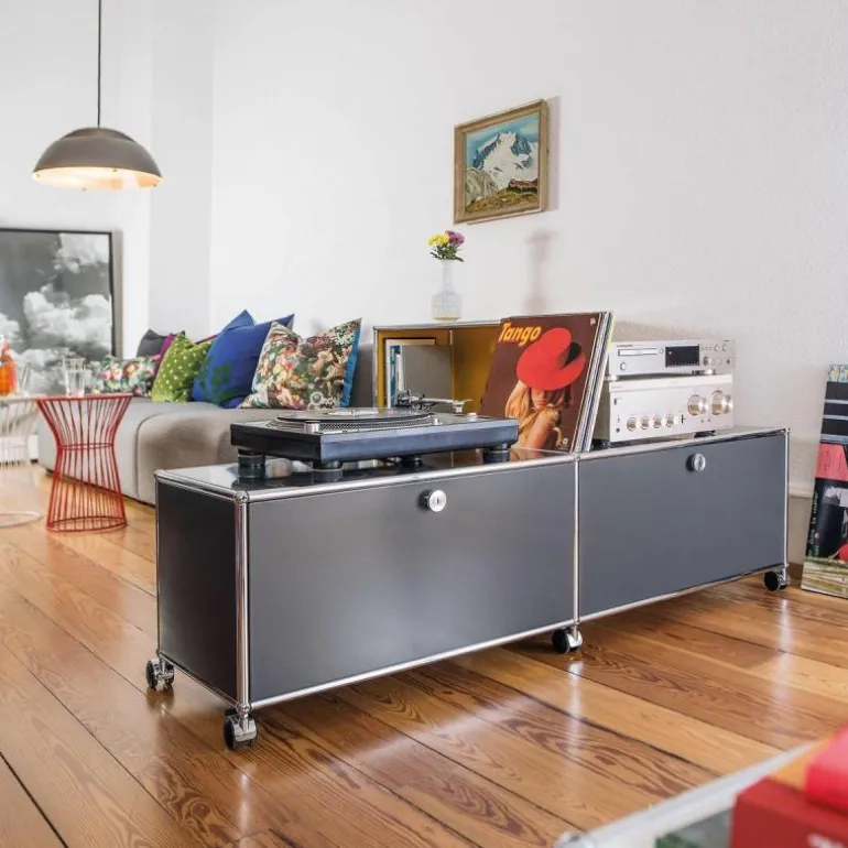 Het Haller TV-meubel op wielen is een voorbeeld van de vele mogelijke uitvoeringen van het USM Haller systeem. In deze uitvoering is het meubel opgebouwd uit twee compartimenten. De compartimenten hebben een horizontale klepsluiting. Deze twee kastjes bieden voldoende opbergruimte om spullen en eventuele apparatuur uit het zicht te kunnen opbergen. Een groot voordeel van het USM Haller systeem is het feit dat het altijd kan worden uitgebreid. Hierdoor kan het meubel meegroeien met het interieur en de gewenste hoeveelheid aan opbergruimte. r
