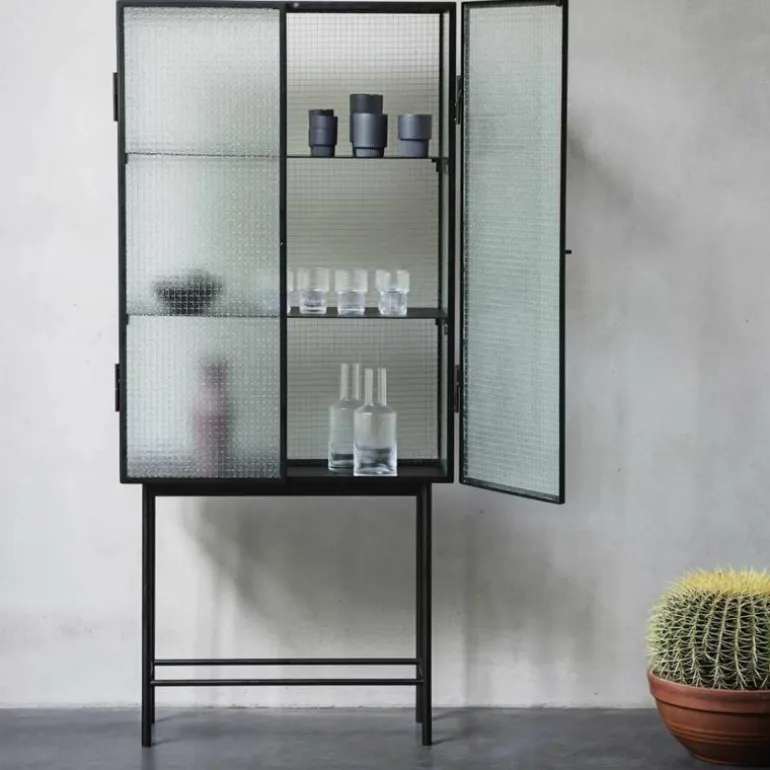De afmeting van de kast bedraagt 155 centimeter in hoogte, 70 centimeter in de breedte en 32 centimeter in diepte. Op de twee bijgeleverde metalen planken met poedercoating kunt u uw eigendommen uitstallen. Dat mooie servies wat gezien mag worden in de eetkamer of uw verzameling verzorgingsproducten in de badkamer; de Haze Vitrinekast leent zich er uitstekend voor en is bovendien een plaatje om te zien. Verkrijgbaar in Zwart of Cashmere. r