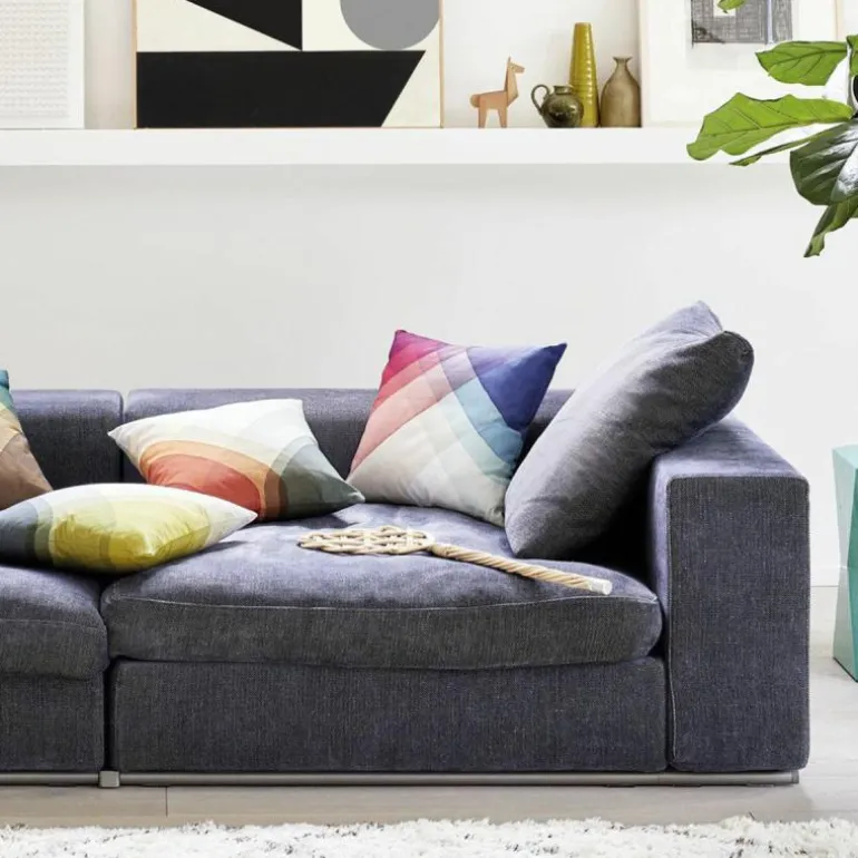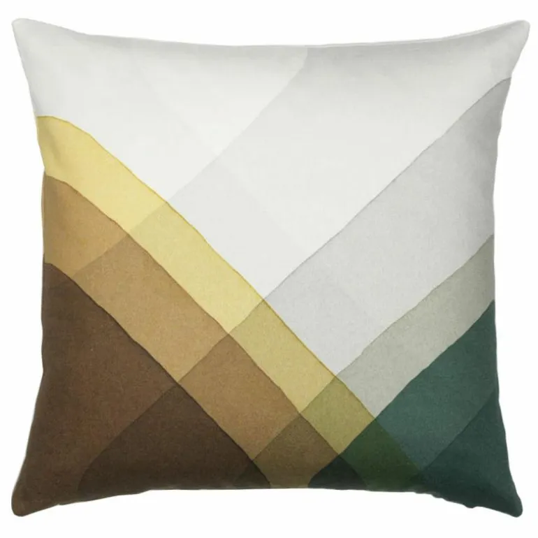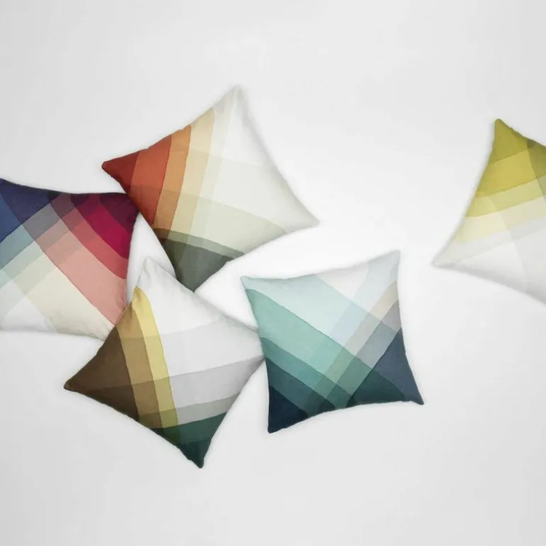 Door de elkaar kruisende en overlappende stroken iedere keer opnieuw onder te dompelen in verschillende kleuren verf, is in ieder ‘vakje’ een nieuwe kleur te ontdekken, die uiteindelijk heel goed bij elkaar passen. Het is een frisse combinatie van vrolijke kleuren, die uw interieur op zullen fleuren. Het kussen, verkrijgbaar in een vijftal kleuren, is gemaakt van 100% katoen en gevuld met eendenhalfdons.