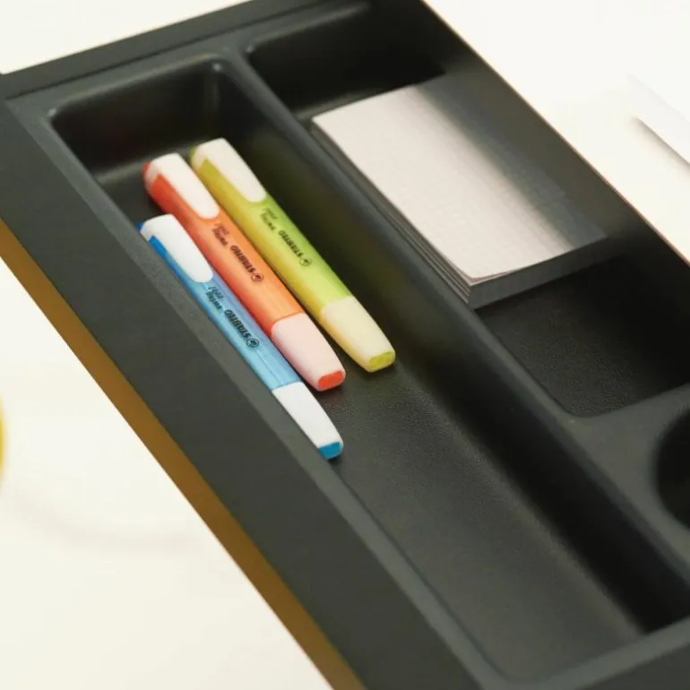 Bovenbladen: wit hogedruklaminaat, houten delen van walnootfineerr