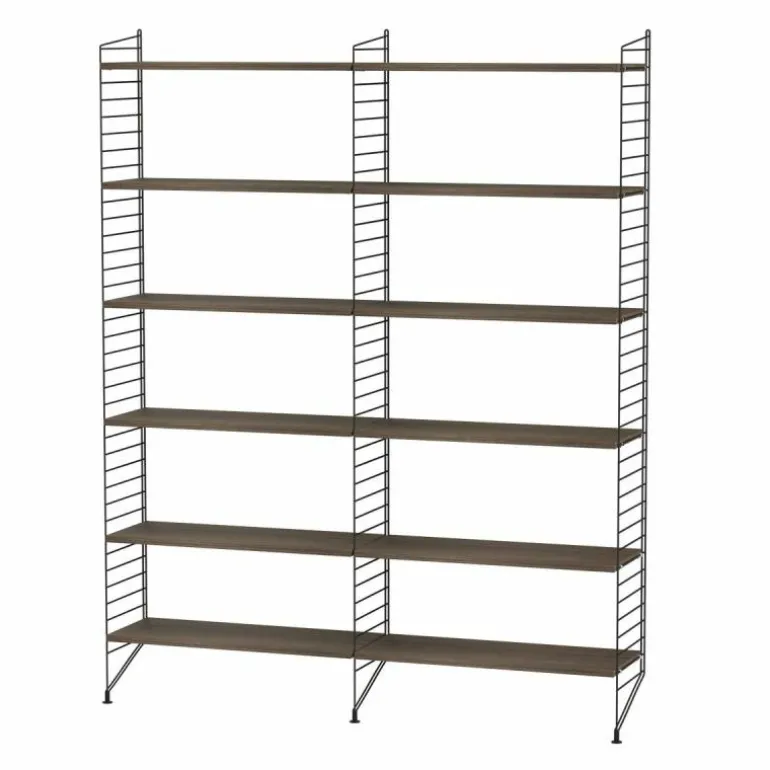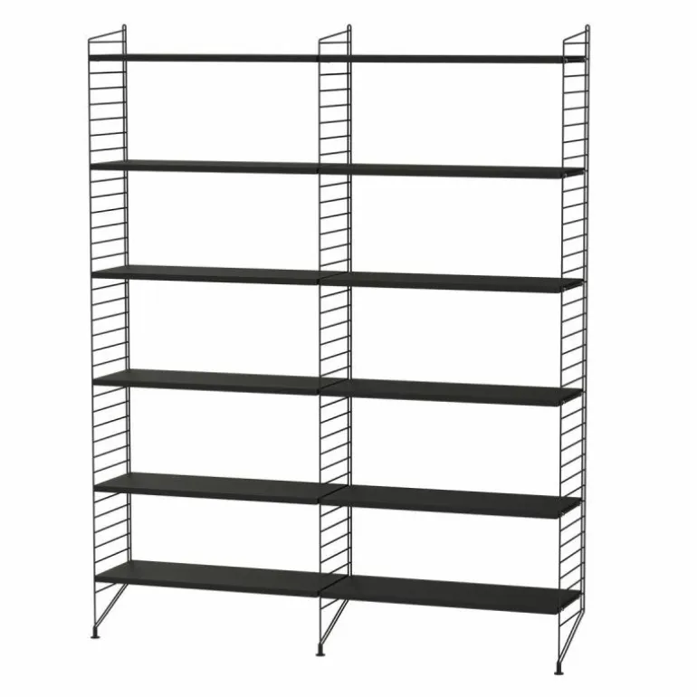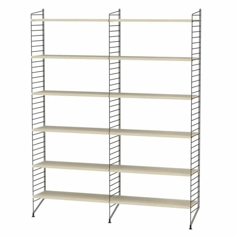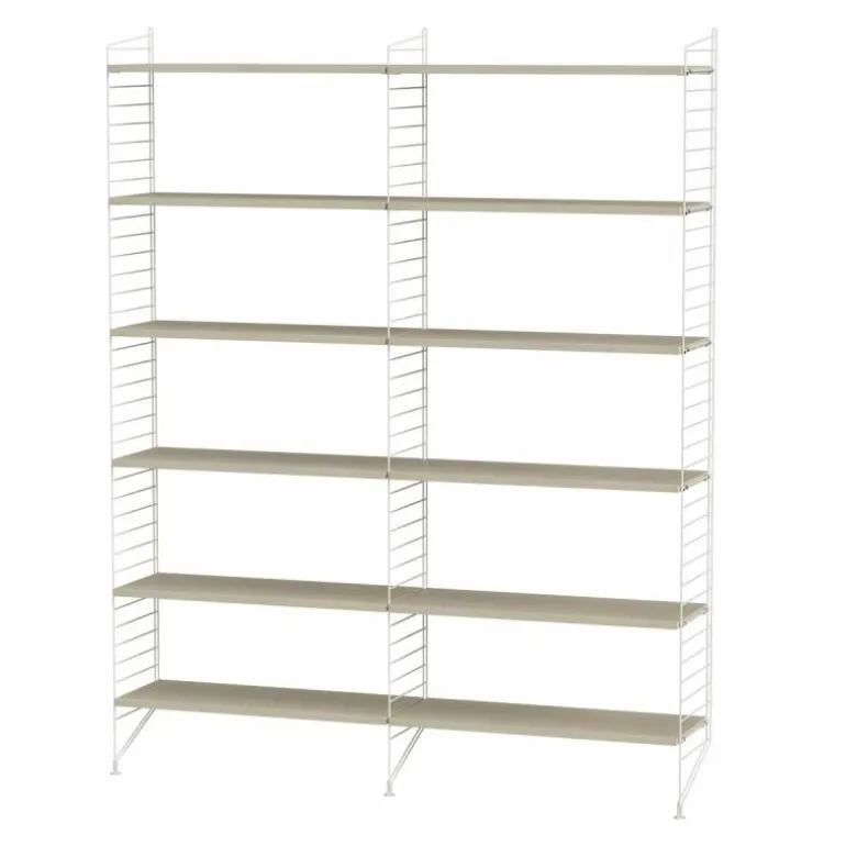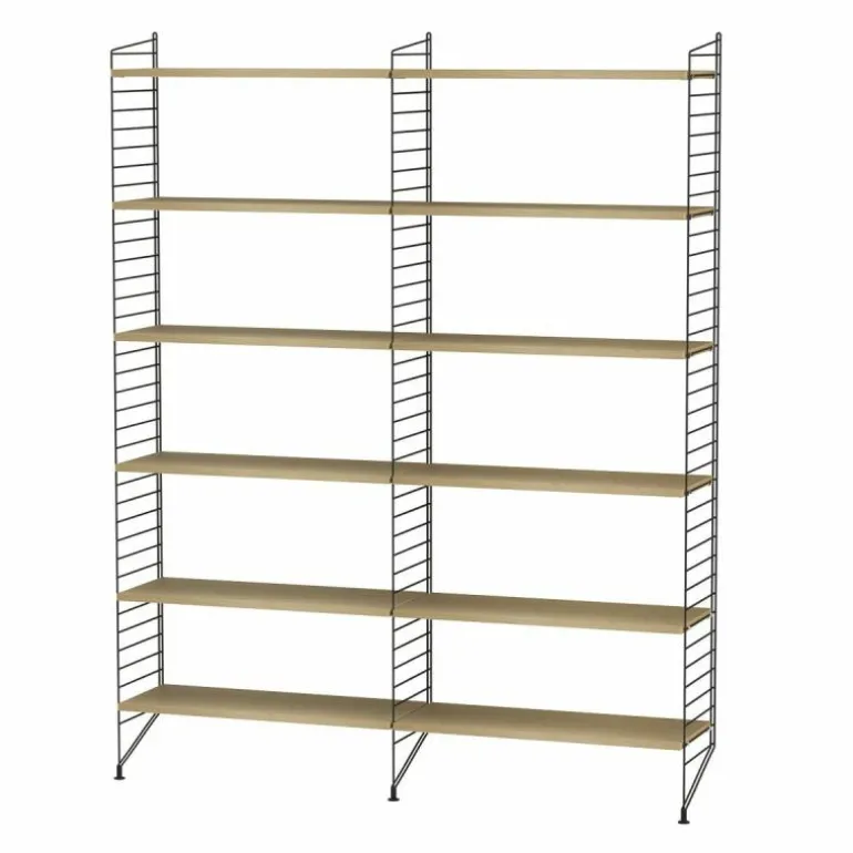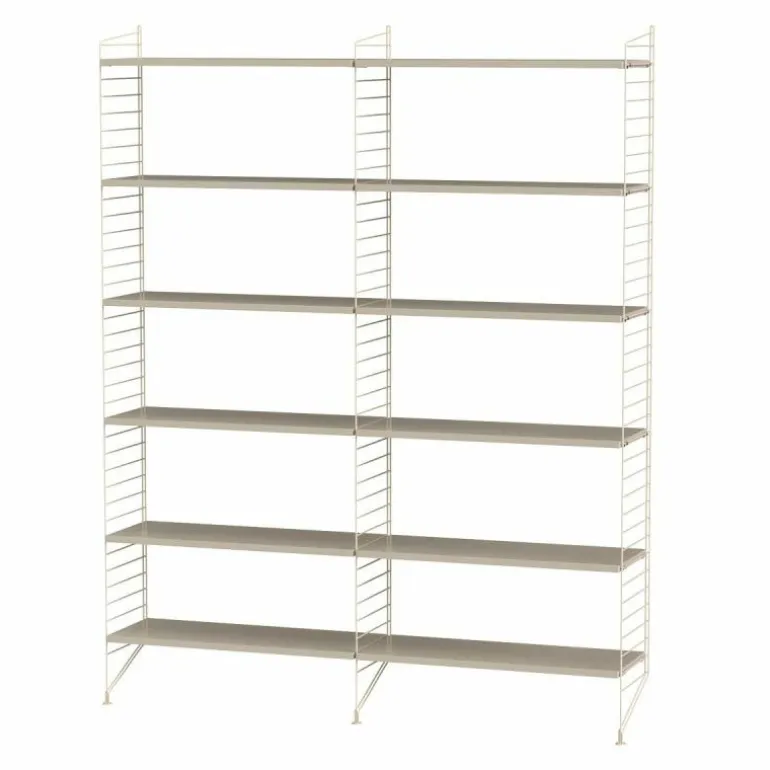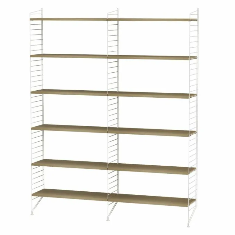Deze combinatie doet perfect dienst als boekenkast in een huiskamer. Het systeem is zeer minimalistisch waardoor de boeken, accessoires en objecten die u erin plaatst de aandacht krijgen die ze verdienen. De basis van deze configuratie wordt gevormd door drie langwerpige rekken die sierlijk de grond raken. Tussen de rekken worden in totaal twaalf planken geplaatst. r