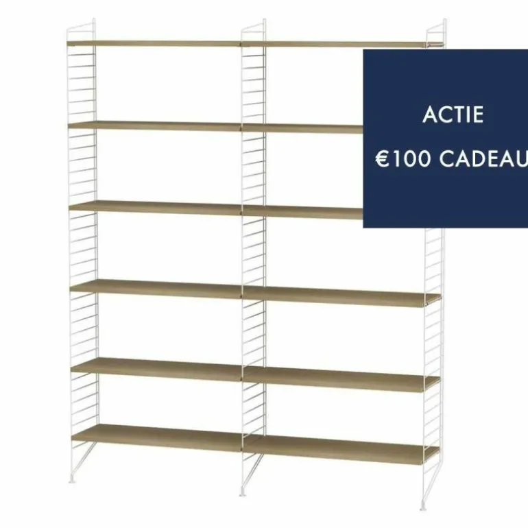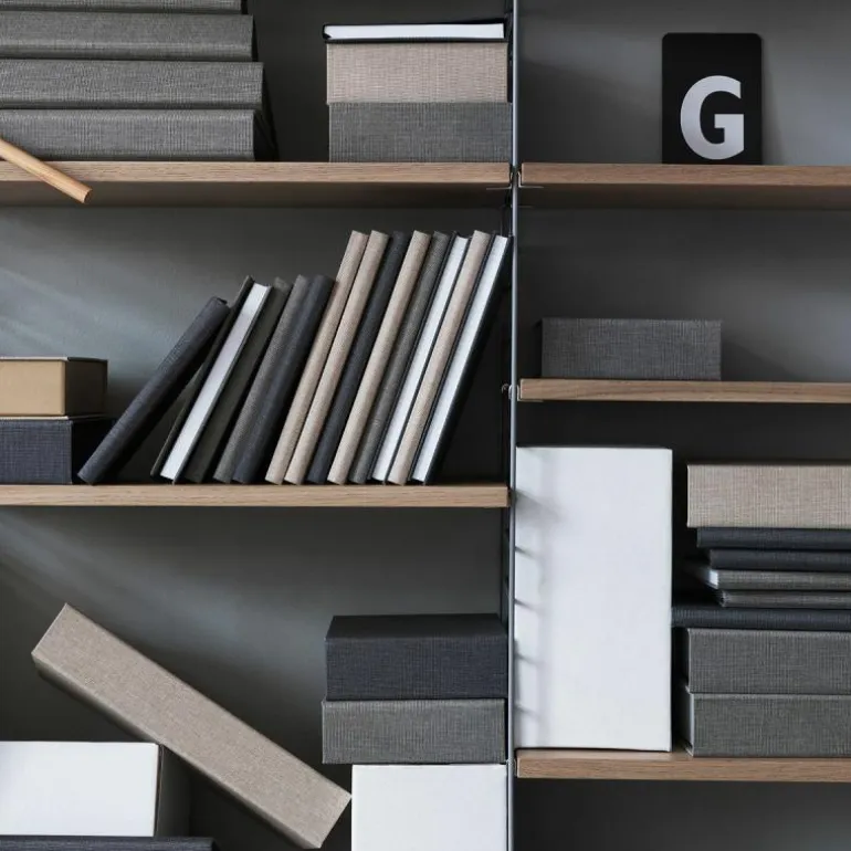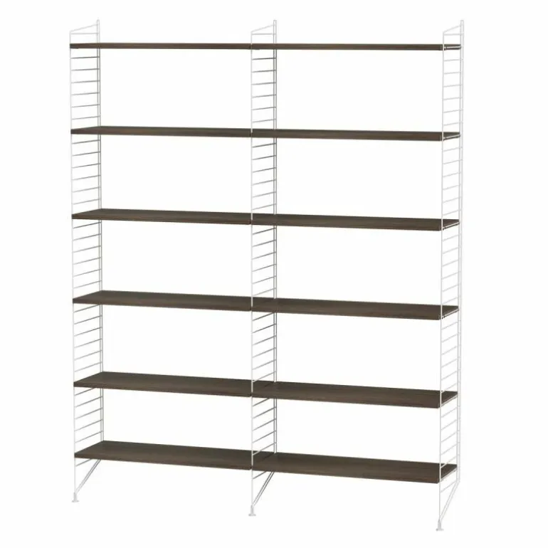 Deze combinatie is standaard verkrijgbaar in 12 kleurcombinaties. De lange panelen kunnen uitgevoerd worden in wit, zwart, beige of grijs metaal en de planken zijn er in naturel walnoot, eiken en essen of zwart, wit, grijs en beige gekleurd fineerhout. De configuratie bestaat uit de volgende onderdelen:r
