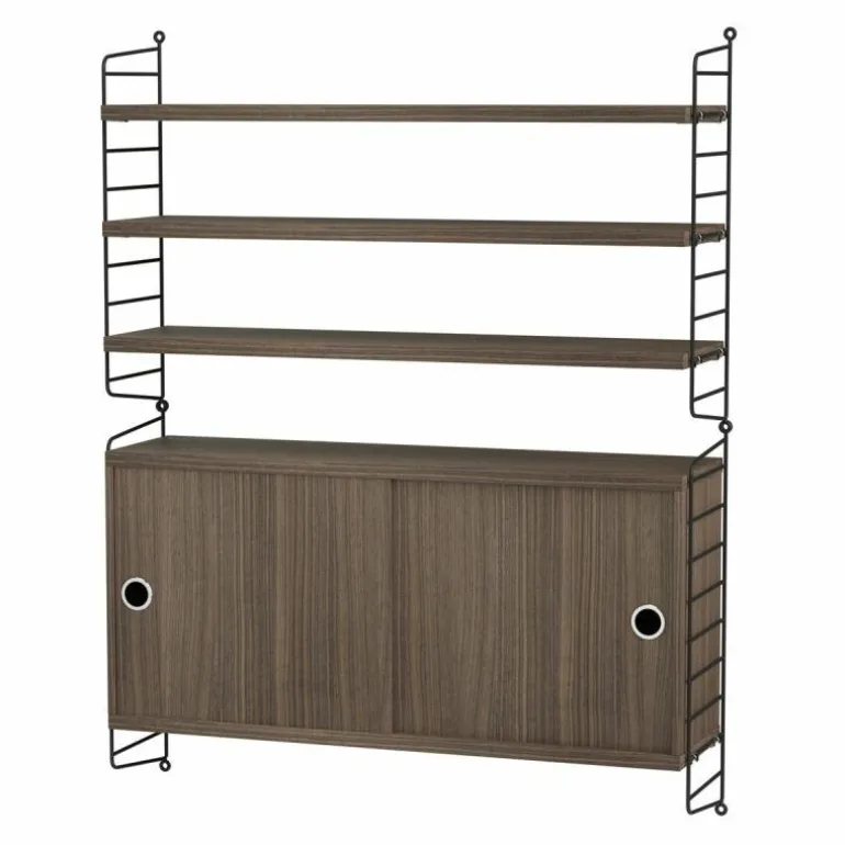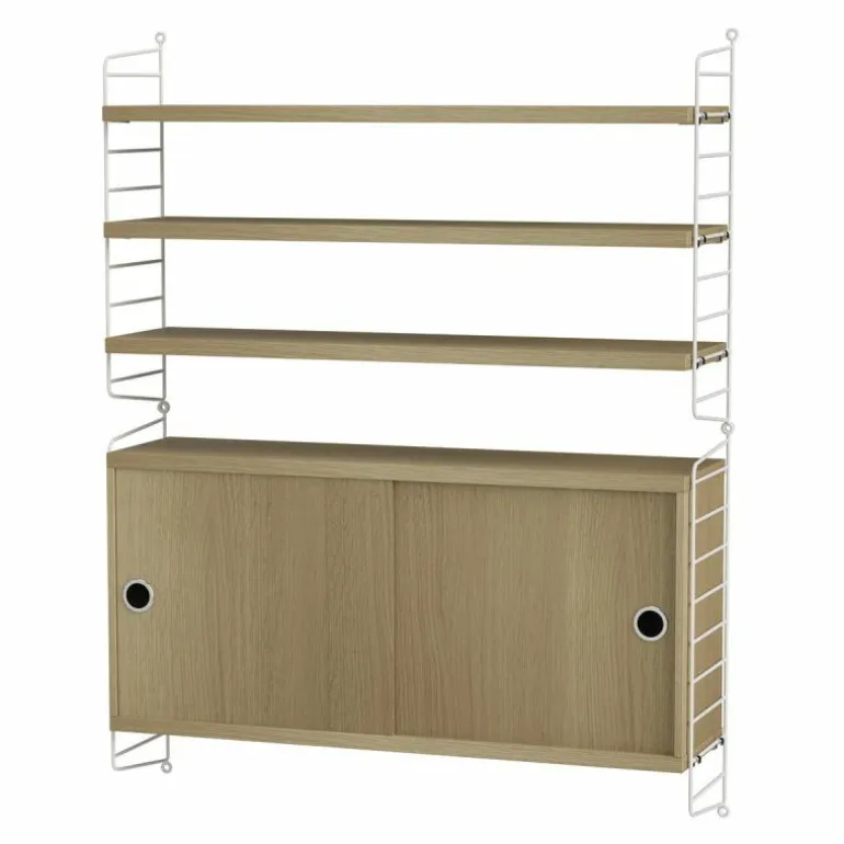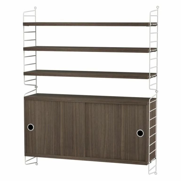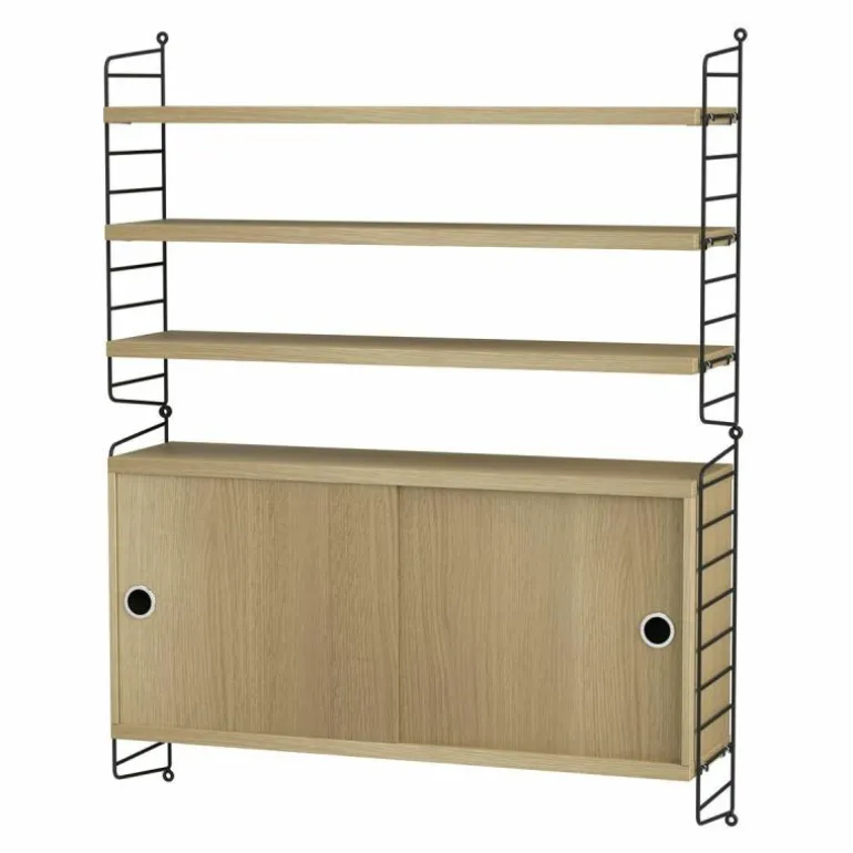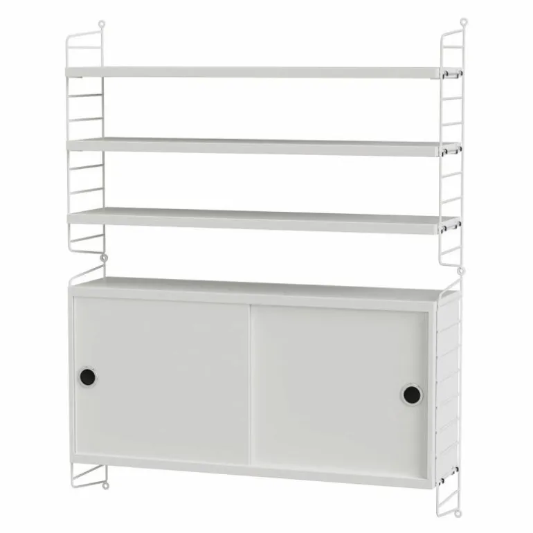 Deze combinatie doet perfect dienst als hangende wandkast voor in de huiskamer. Het betreft een minimalistisch systeem dat weinig ruimte in beslag neemt en tegelijkertijd juist wel genoeg ruimte biedt voor het opbergen en etaleren van bijvoorbeeld boeken, accessoires en kleine kunstobjecten. De samenstelling bestaat uit vier metalen wandpanelen met daartussen een schuifkastje en drie planken met een breedte van 78 centimeter. In totaal heeft dit systeem een hoogte van 1 meter en een diepte van 20 centimeter. r