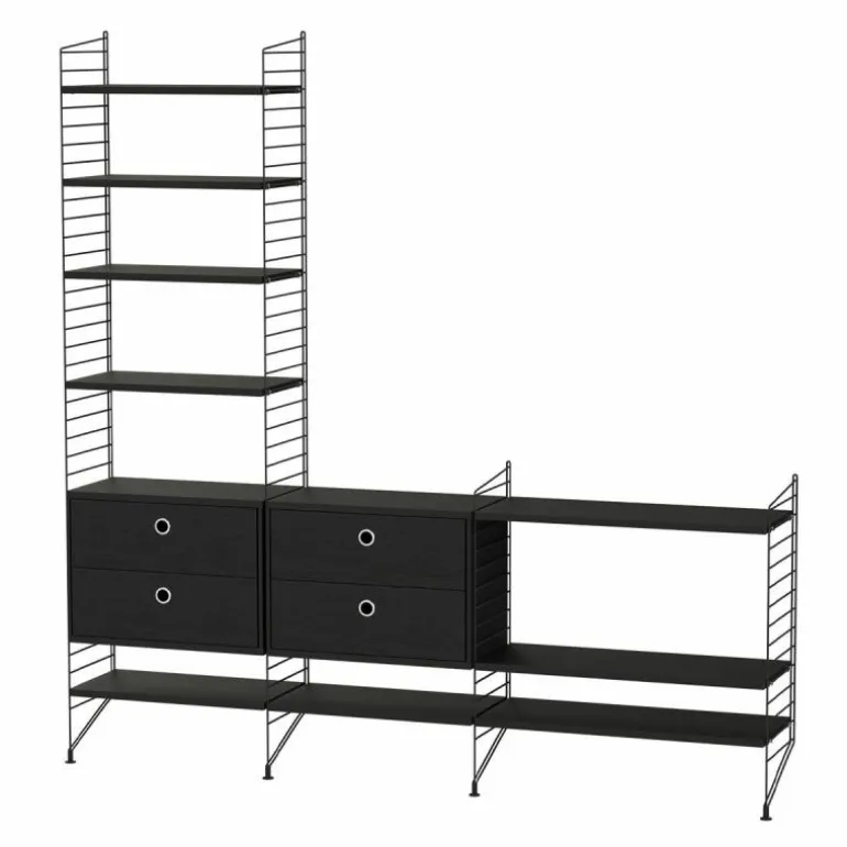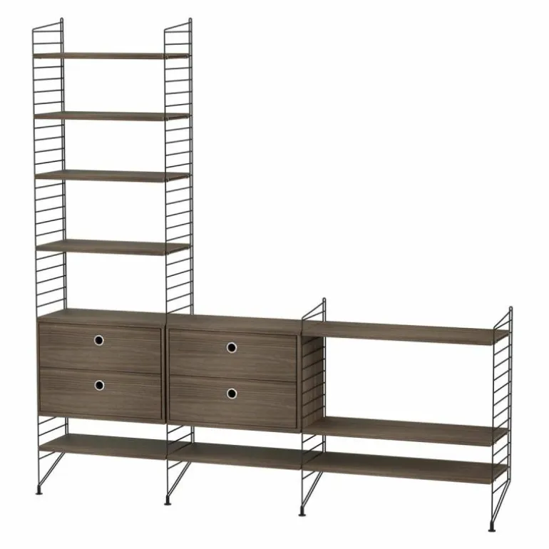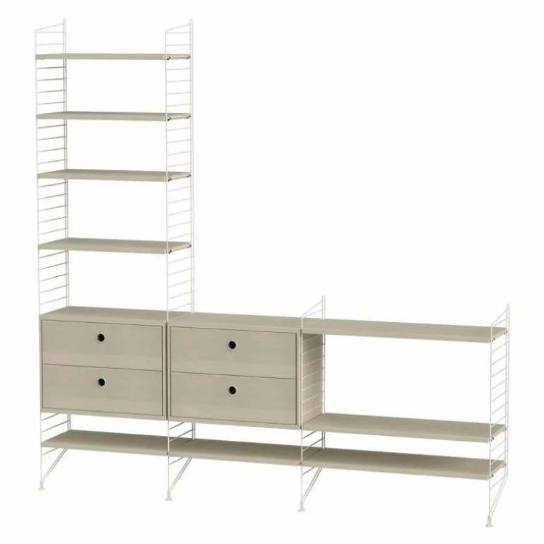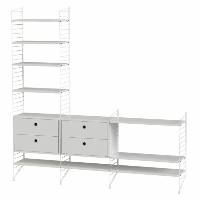 Deze combinatie doet perfect dienst als wandkast voor in de huiskamer waar een lange wand vrij is. Het betreft een minimalistische en speelse samenstelling die zowel de hoogte als de breedte in gaat waardoor een gaaf effect ontstaat en er bijvoorbeeld de mogelijkheid is om de configuratie deels onder een raam te plaatsen of om er juist een schilderij of televisie boven te hangen. Het systeem bestaat uit twee kastonderdelen met in totaal vier lades en meerdere planken.r