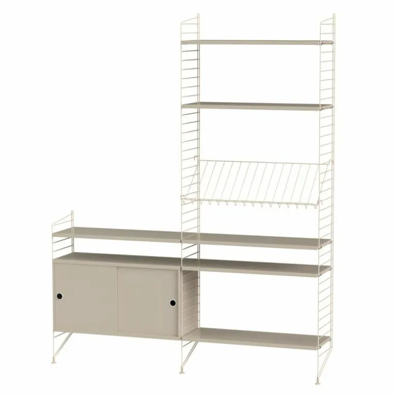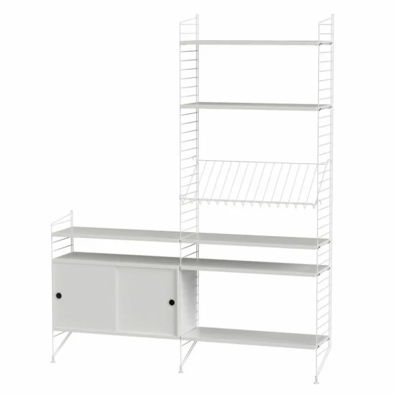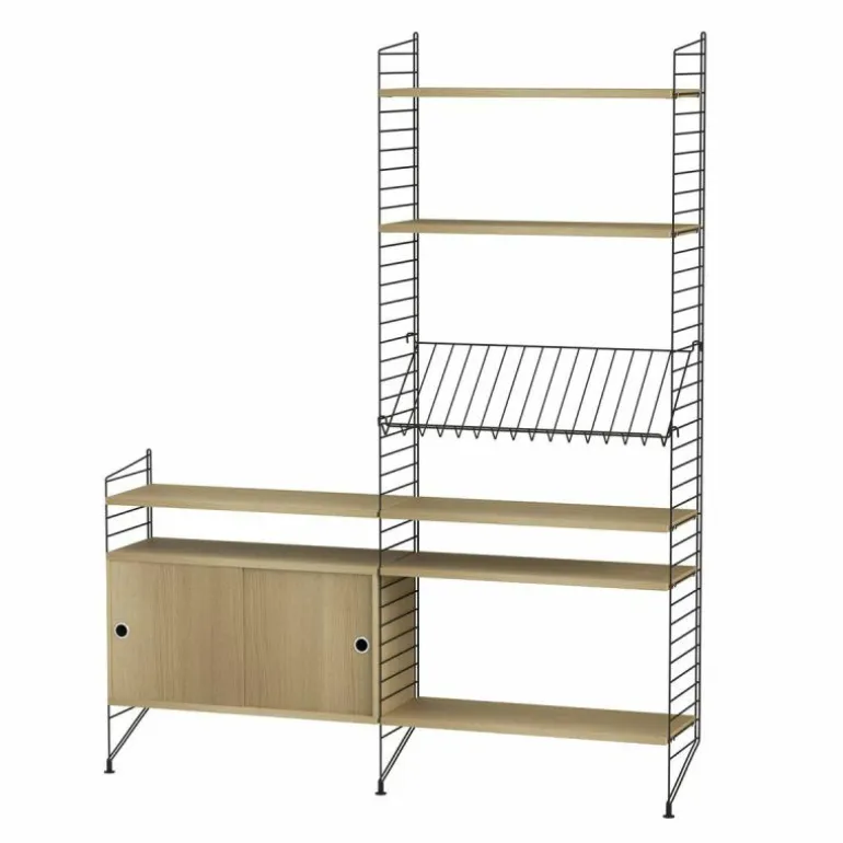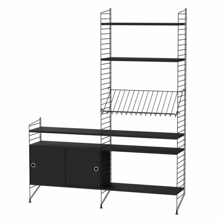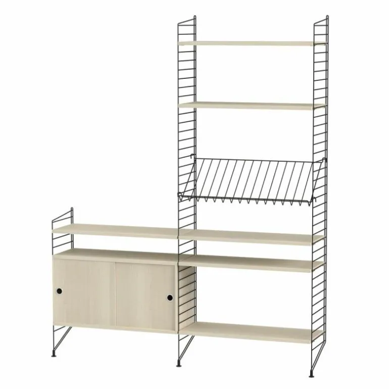 Deze combinatie doet perfect dienst als wandkast voor in de huiskamer. Het betreft een minimalistische en speelse samenstelling die zowel de hoogte als de breedte in gaat waardoor een gaaf effect ontstaat en er bijvoorbeeld de mogelijkheid is om de configuratie deels onder een raam te plaatsen of om er juist een schilderij of televisie boven te hangen. Het systeem omvat een schuifkast, meerdere planken en een metalen rek voor het etaleren van boeken en tijdschriften.r