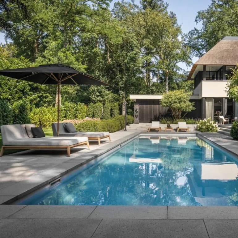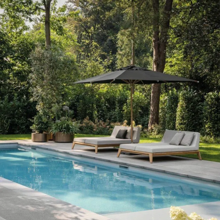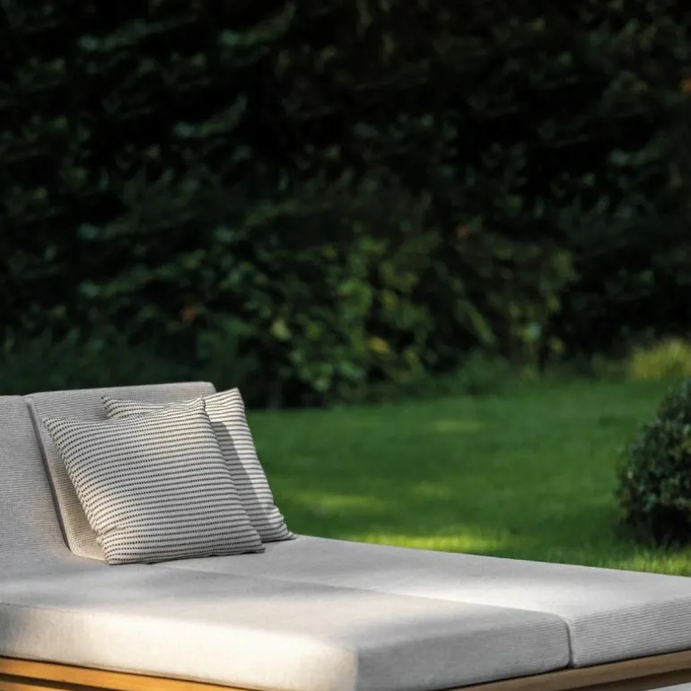 Dit daybed is onderdeel van de Hybrid collectie en dankt zijn tijdloze uitstraling aan de rugsteun van gepoedercoat aluminium en uitlopende poten van massief teakhout. Teakhout staat bekend om zijn weerbaarheid en is tegen weer en wind bestand doordat het van nature rijk is aan oliën. Hierdoor is het een zeer duurzaam materiaal dat veel gebruikt wordt voor tuinmeubelen. Na verloop van tijd zal teakhout op natuurlijke wijze vergrijzen, maar kan door behandeling zijn oorspronkelijke kleur behouden of terugkrijgen. r