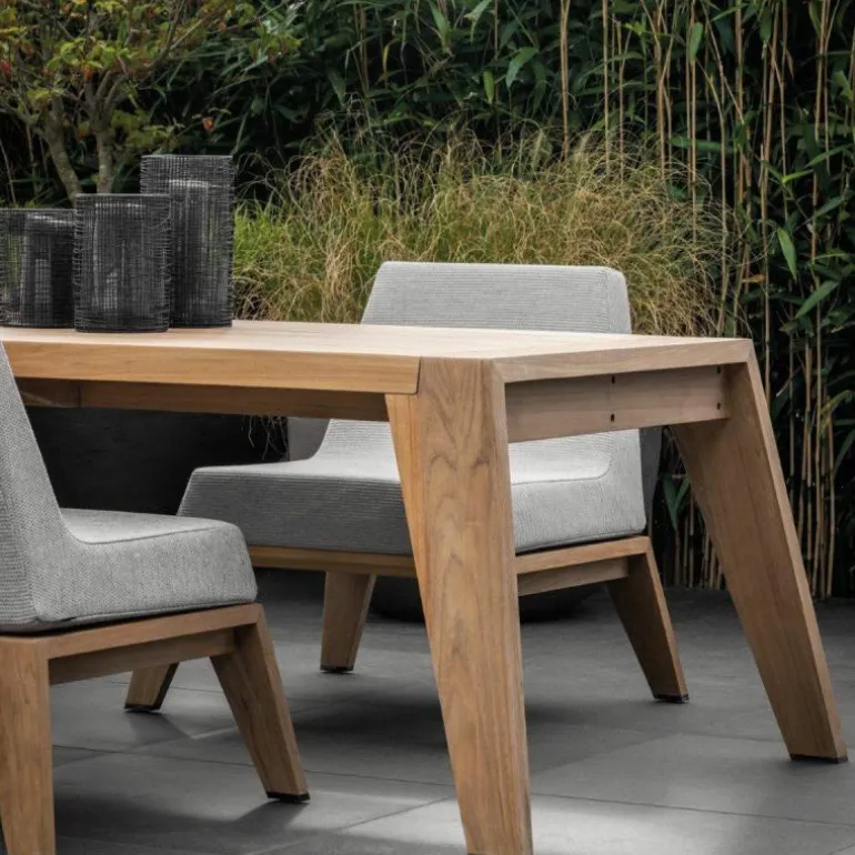 Deze eettafel is onderdeel van de Hybrid collectie en dankt zijn tijdloze uitstraling door de uitlopende poten van massief teakhout. Teakhout staat bekend om zijn weerbaarheid en is tegen weer en wind bestand doordat het van nature rijk is aan oliën. Hierdoor is het een zeer duurzaam materiaal dat veel gebruikt wordt voor tuinmeubelen. Na verloop van tijd zal teakhout op natuurlijke wijze vergrijzen, maar kan door behandeling zijn natuurlijke kleur behouden of terugkrijgen. r