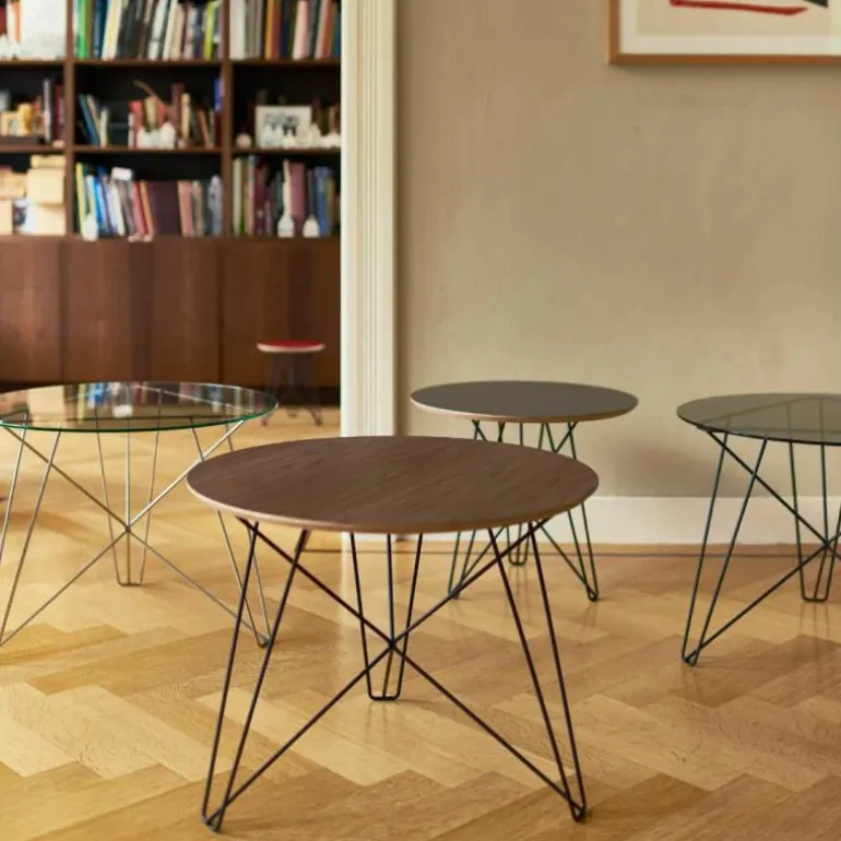Het blad is verkrijgbaar in HPL, Amerikaans notenhout en glas. HPL is een robuuste laminaatsoort dat bij Spectrum verkrijgbaar is in zwart, donkergrijs of rood. Met een blad van Amerikaans notenhout versterkt u de retro uitstraling van de bijzettafel. Als u kiest voor een blad van glas heeft u de keuze uit helder glas of gerookt donker glas. Het onderstel wordt standaard geleverd in dun draadstaal, voorzien van een zwarte epoxylaag (RAL 9005). Optioneel is het ook mogelijk om te kiezen voor een RVS onderstel. Naast deze grote variant is de IJhorst Bijzettafel ook verkrijgbaar in twee kleinere uitvoeringen. r