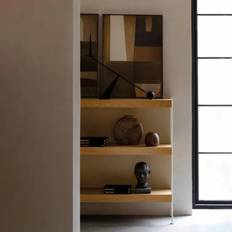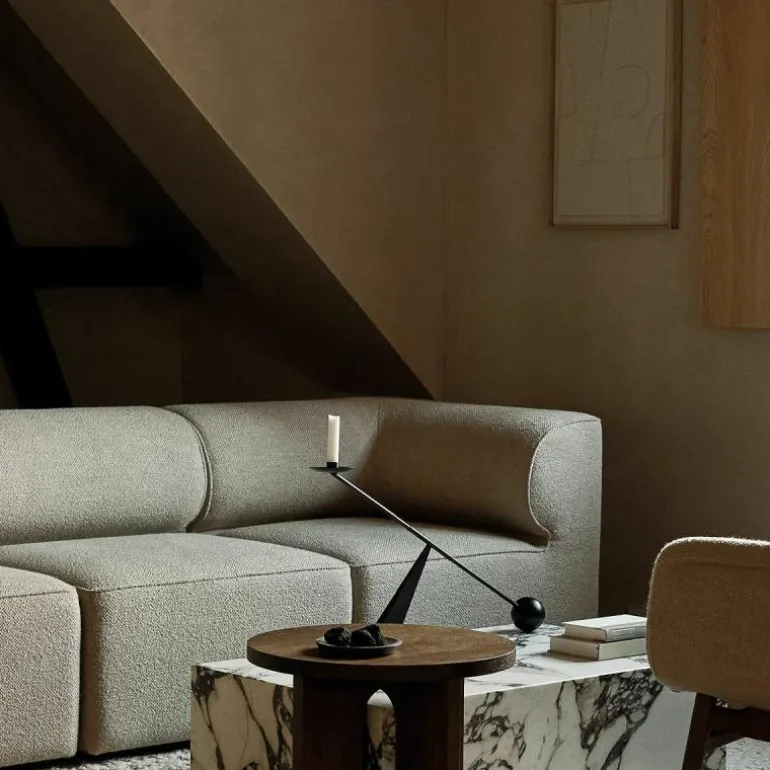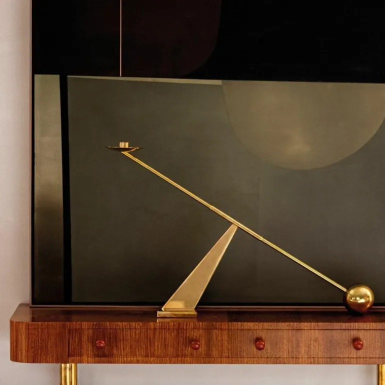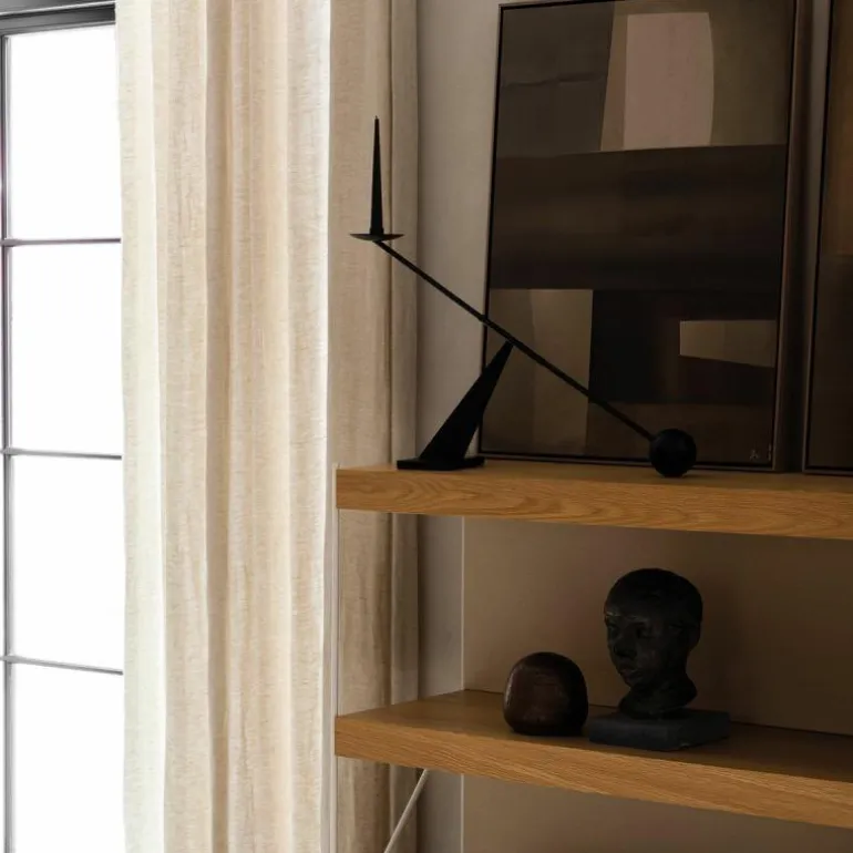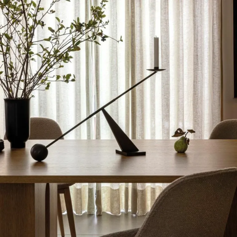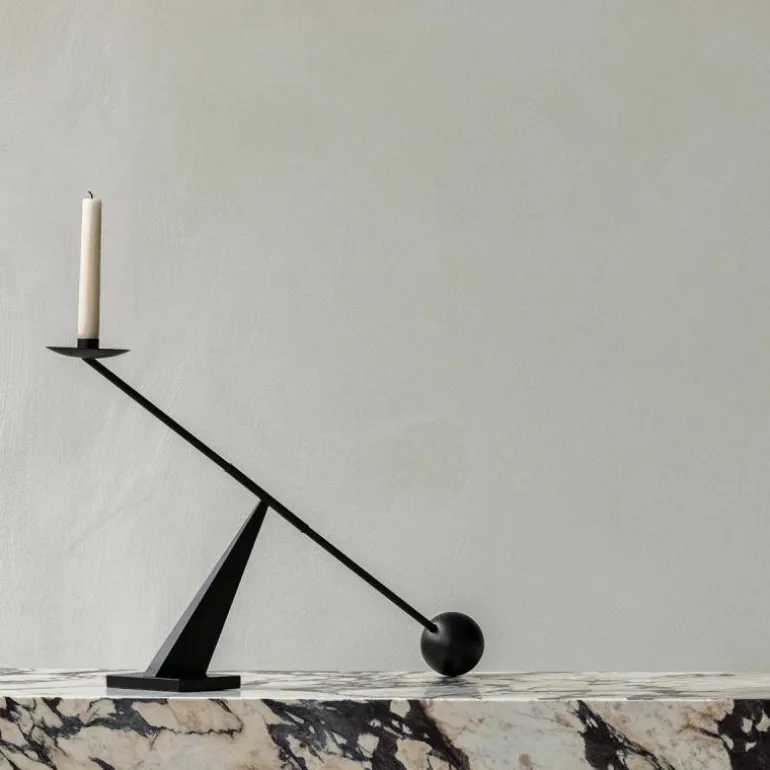 De Menu Interconnect Kandelaar is een gedurfd en kunstzinnig ontwerp van Colin King. De opvallende metalen sculptuur weet een statement te maken in elk interieur. Met zijn bijzondere vorm en overdreven proporties is het een kandelaar die vele overeenkomsten heeft met geometrische abstractie als kunstvorm. Zo zorgt de geometrische vormentaal van de kandelaar voor een tijdloos en open karakter dat typerend is voor geometrische abstractie. Bovendien zorgt deze statige kandelaar voor de verspreiding van een warm licht door elke ruimte, dankzij de hoge plaatsing van de kaars.r