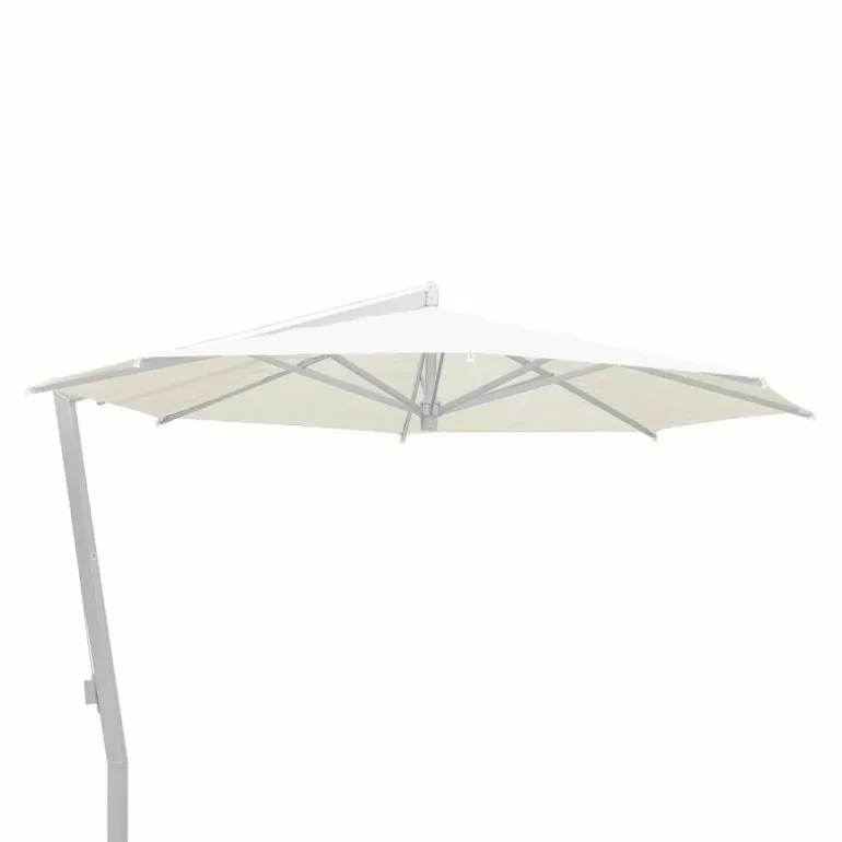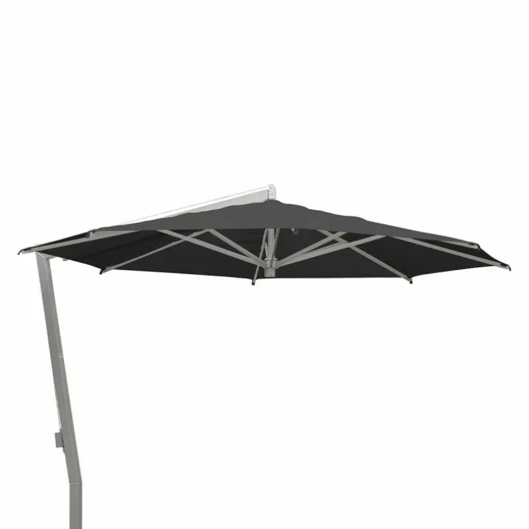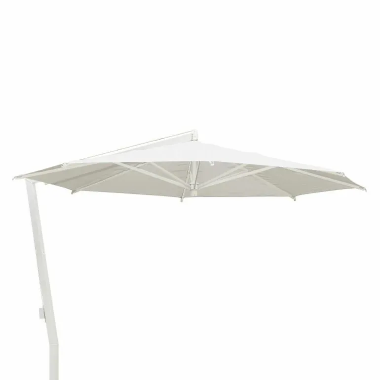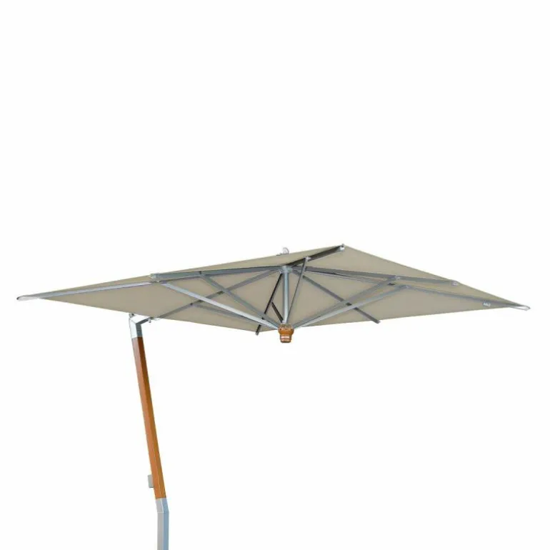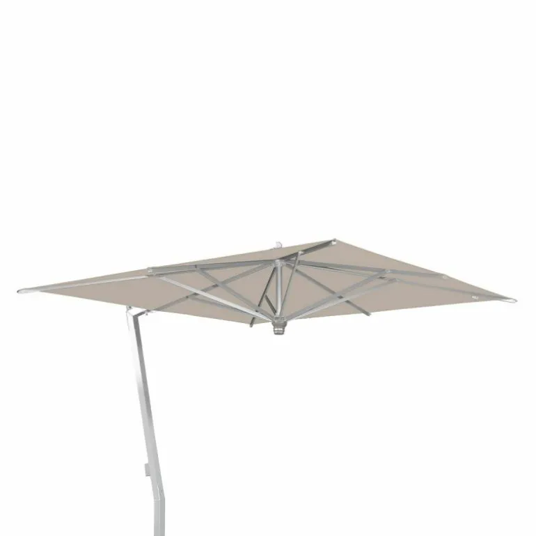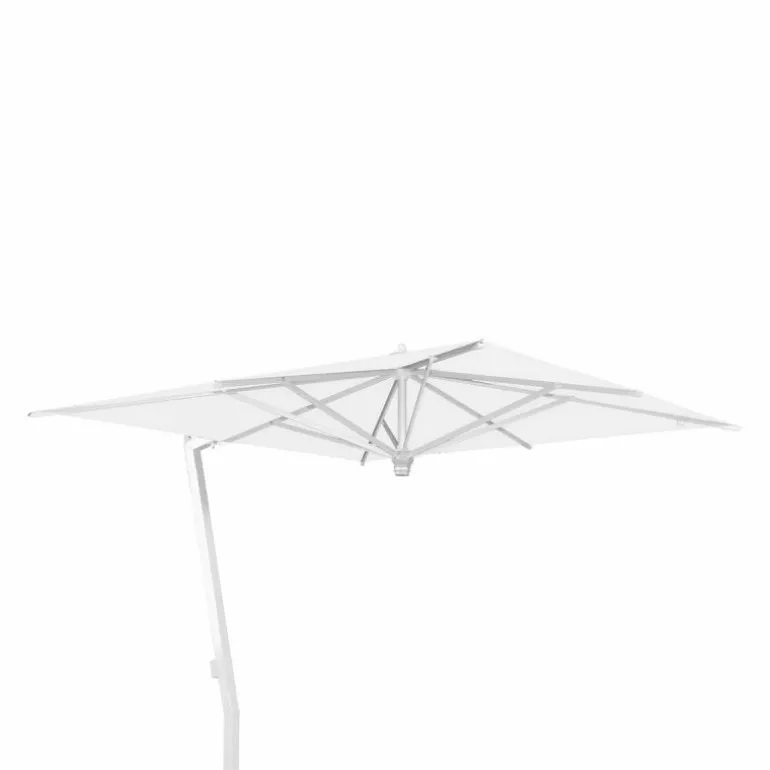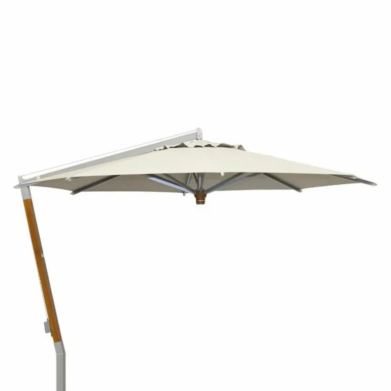 De Ischia Parasol is verkrijgbaar met een wit, zilver of grafiet aluminium frame voor een strakke look. Daarnaast is het frame tevens uitvoerbaar in zilverkleurig aluminium gecombineerd met teakhout waardoor de parasol een warme touch krijgt. Het vrijhangende ontwerp is zowel kantelbaar als 360° draaibaar, waardoor op elke gewenste plek schaduw gecreëerd kan worden. Het doek is voorzien van een Sunbrella of Batyline stof. Sunbrella is een water- en vuilafstotende stof, vervaardigd uit polyacrylaat. Het is UV-, kleur- en schimmelbestendig en daardoor tegen weer en wind bestand. Batyline is vervaardigd uit een polyestervezel die wordt gecoat met een laag PVC en daarna geweven. Door dit vervolgens samen te smelten, wordt de stof scheurbestendig en bestand tegen extreme weersomstandigheden. r