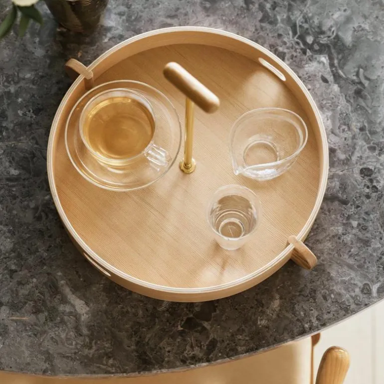 Het ronde JH Tray Dienblad is gemaakt van Oregon dennenhout met een messing handvat. Het esthetische dienblad heeft een diameter van 38 centimeter met een hoogte van 2,65 centimeter.