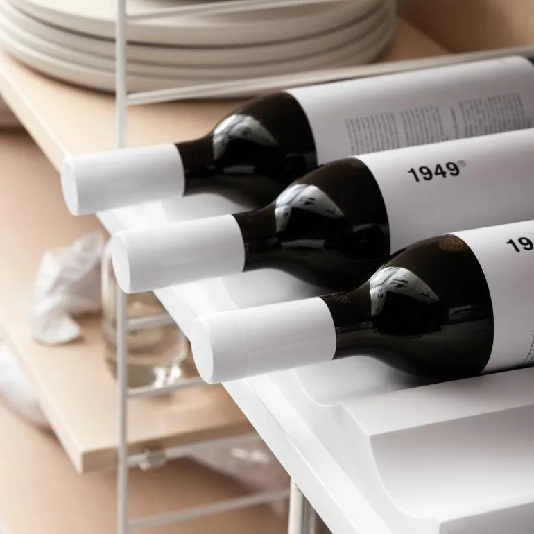 Deze combinatie is de perfecte oplossing voor in de keuken. Het is een minimalistisch en bescheiden hangende samenstelling die goed boven het aanrecht geplaatst kan worden. Het systeem bestaat uit drie wandrekken (van slechts 50 centimeter hoog) waartussen twee planken met lage opstaande rand en twee planken met hoge opstaande rand hangen. De metalen planken zijn voorzien van gaatjes. Hieraan kunnen verschillende accessoires gehangen worden zoals een messenhouder of wijnrek. Deze zijn bij te bestellen. r