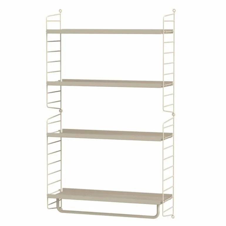 Deze combinatie is de perfecte oplossing voor in de keuken. Het is een minimalistisch en vrij kleine hangende samenstelling die goed naast of boven het aanrecht geplaatst kan worden. Het betreft een lange stelling met vier planken die een lage opstaande rand hebben. De metalen planken zijn voorzien van gaatjes. Hieraan kunnen verschillende accessoires gehangen worden zoals het meegeleverde ophangrek, maar ook wijnrekken en haakjes zijn verkrijgbaar. r