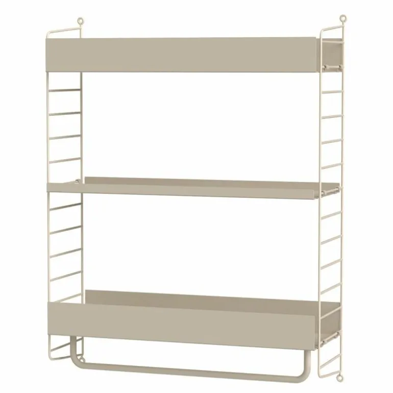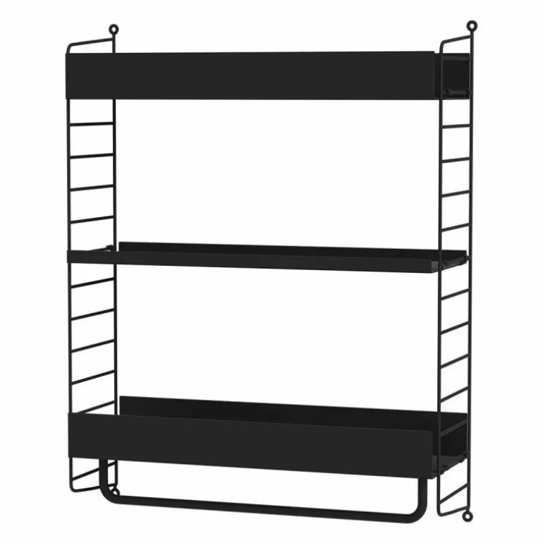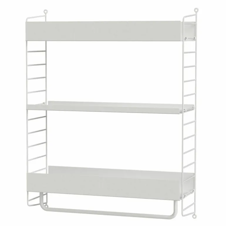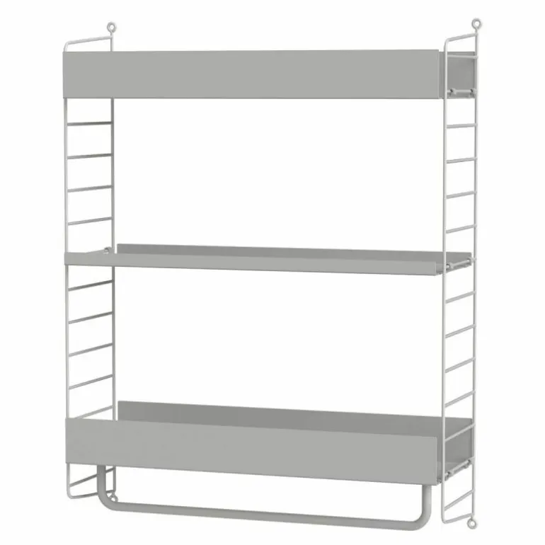 Deze combinatie is de perfecte oplossing voor in de keuken. Of het nu een ruime of kleine keuken betreft, dit systeem biedt praktische ruimtebesparende opbergmogelijkheden voor tal van keukenattributen zoals drinkglazen, specerijen en handdoeken. Het is een minimalistisch en compacte samenstelling die goed naast of boven het aanrecht geplaatst kan worden. Het betreft een stelling met twee diepe planken en één plank met lage opstaande rand. De metalen planken zijn voorzien van gaatjes. Hieraan kunnen verschillende accessoires gehangen worden zoals het meegeleverde ophangrek, maar ook wijnrekken en haakjes zijn verkrijgbaar. r