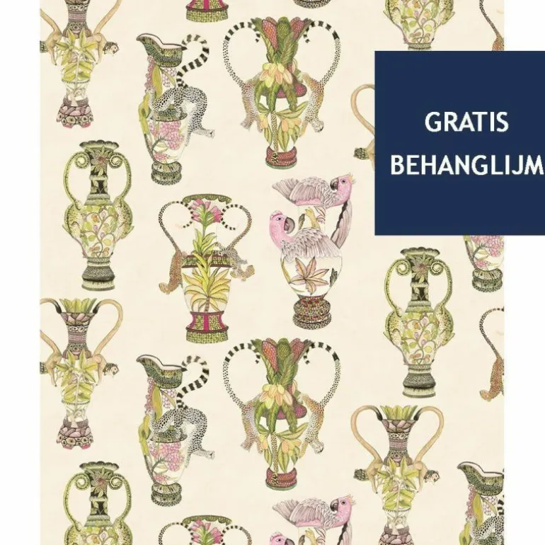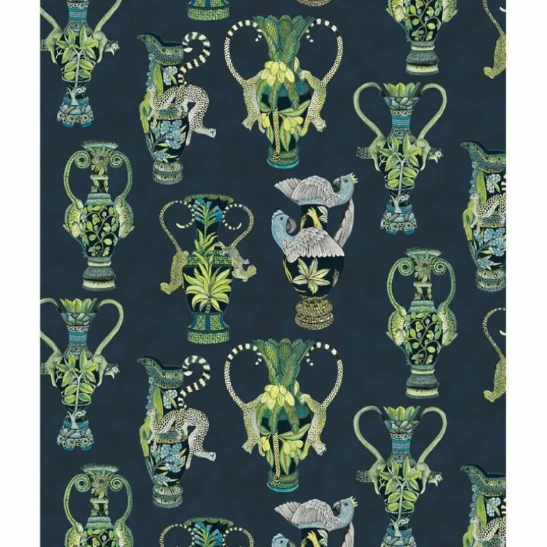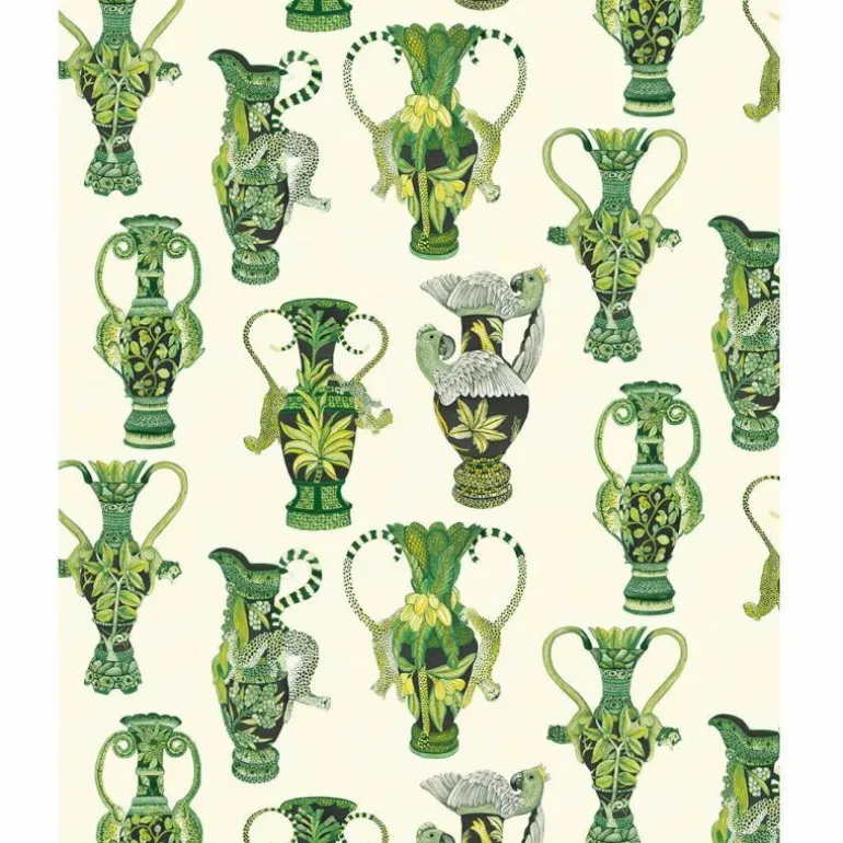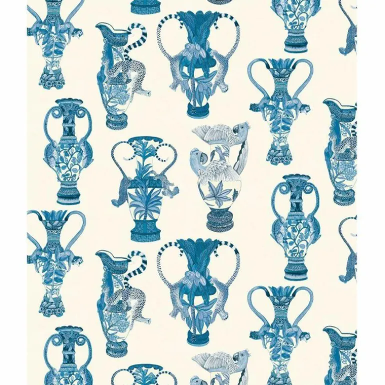 Het Khulu Vases behang is verkrijgbaar in de kleurcombinaties: zachtroze met oranje op een roomkleurige achtergrond, Chinees blauw op een ivoorkleurige achtergrond, levendig groen gecombineerd met houtskool op een ivoorkleurige achtergrond en tot slot petrol met emerald groen op een nachtblauwe achtergrond. De patronen worden om de 68,5 cm herhaald.