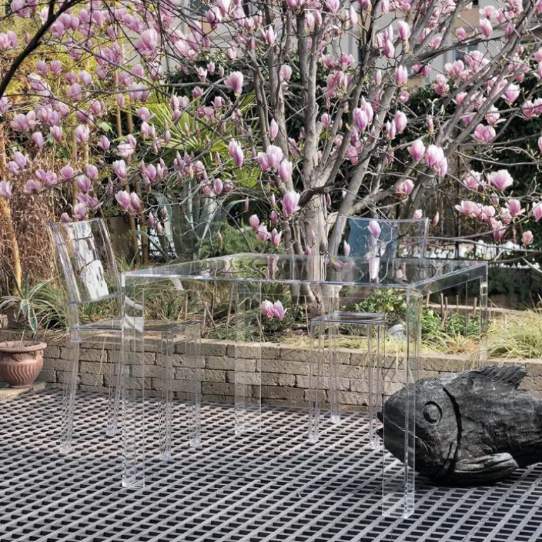 La Marie Stoel voegt de lichtheid en ongrijpbaarheid van haar uitzicht toe aan een hoogwaardig design en een uitzonderlijk sterke structuur. Een geniale combinatie van lichtheid en stevigheid, resultaat van een zorgvuldig en nauwkeurig onderzoek van het materiaal, polycarbonaat, bestand tegen schokken.r