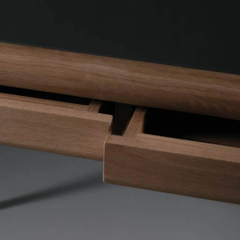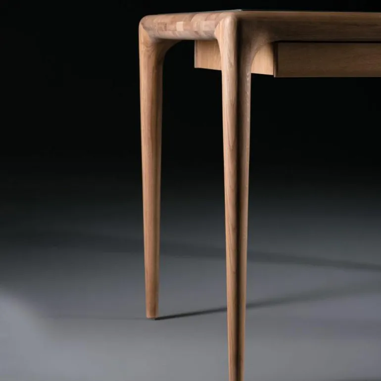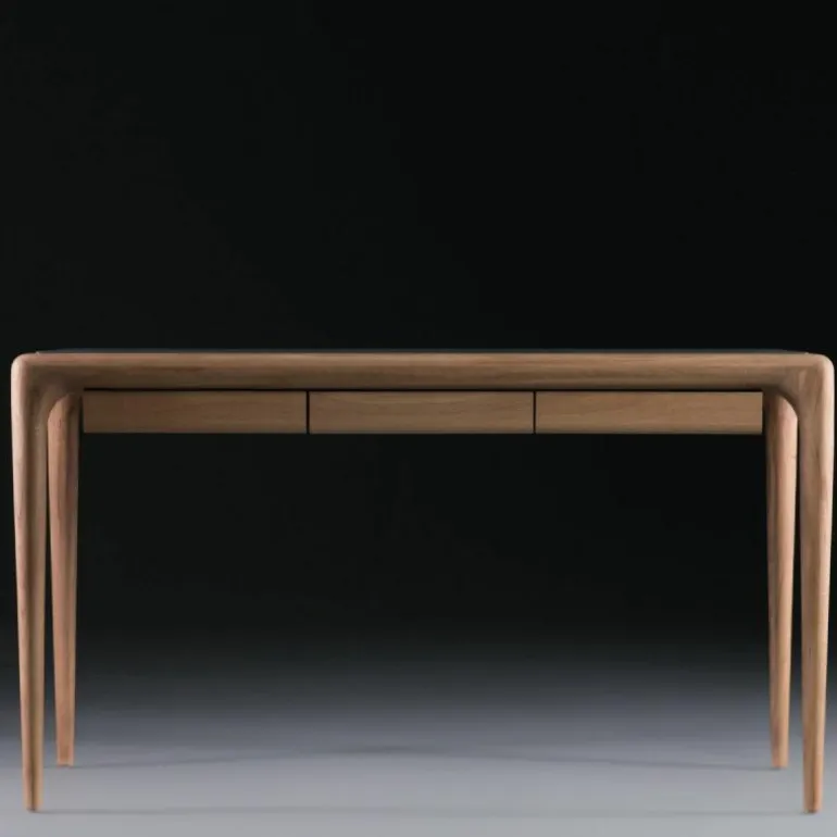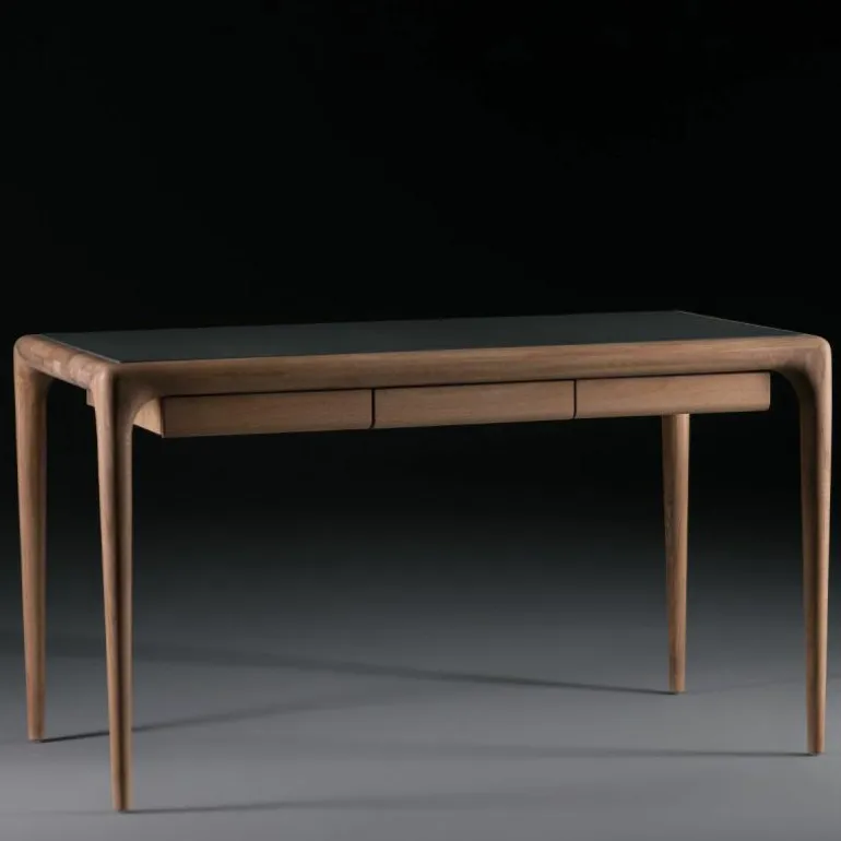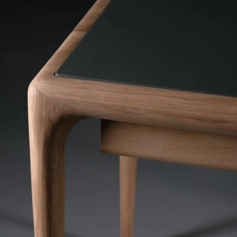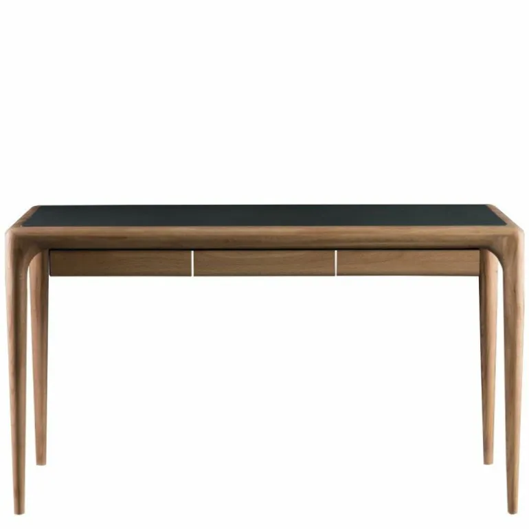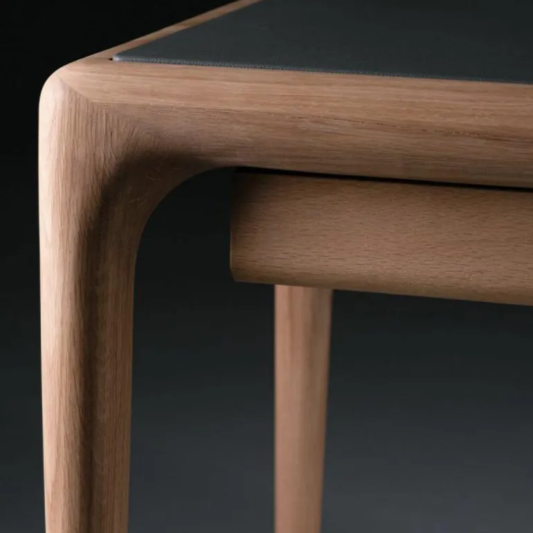 Het Latus Leder Bureau oogt ondanks het massieve materiaal zeer elegant door minimalistische vormgeving met afgeronde hoeken en randen. De taps toelopende poten voegen nog meer elegantie toe aan het bureau en zorgen voor een luchtige uitstraling. Daarnaast is het tafelblad, zoals de naam verklapt, voorzien van leder. Dit geeft een gevoel van luxe en maakt het bureau uniek. Voorzien van drie lades biedt het bureau genoeg opbergruimte voor diverse benodigdheden zoals pennen, schriften of boeken. Het design is verkrijgbaar in twee verschillende afmetingen met keuze uit drie ledersoorten en zeven houtsoorten. Hierdoor zal er een geschikte variant tussen zitten voor iedere (thuis)werkplek. Met het Latus Leder Bureau wordt er in een handomdraai een mooie en functionele werkplek gecreëerd. r