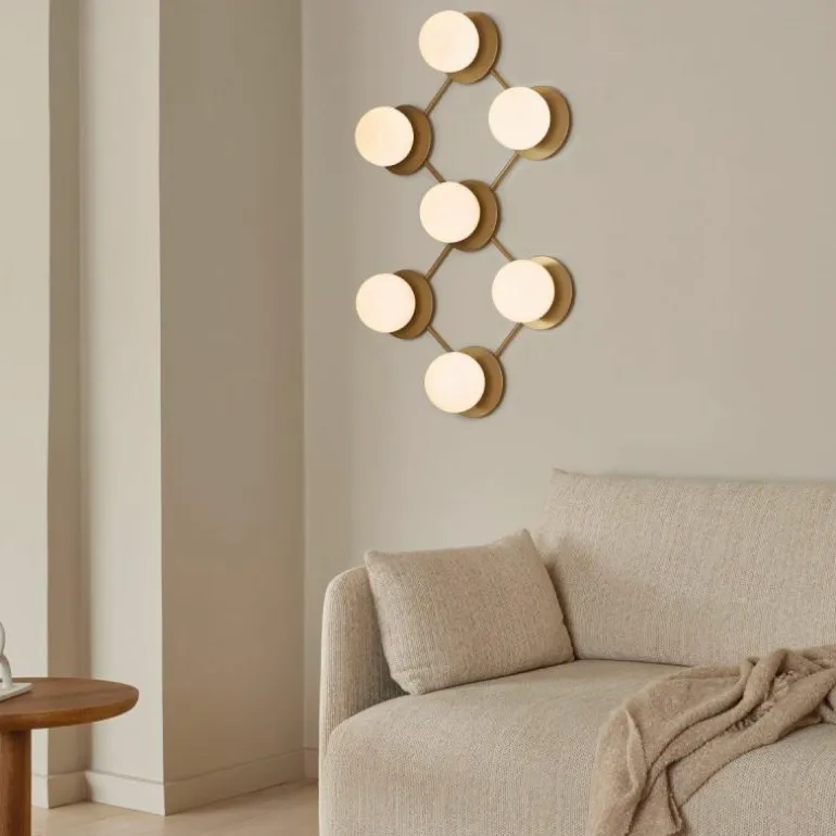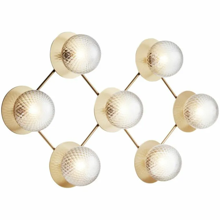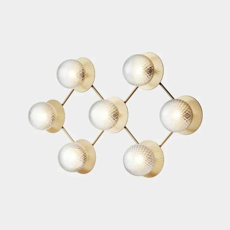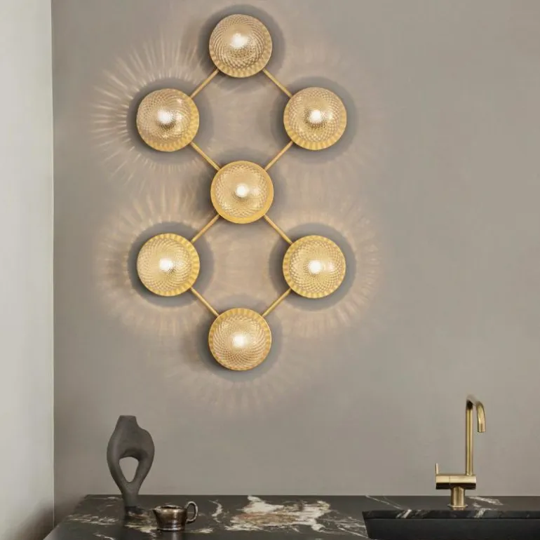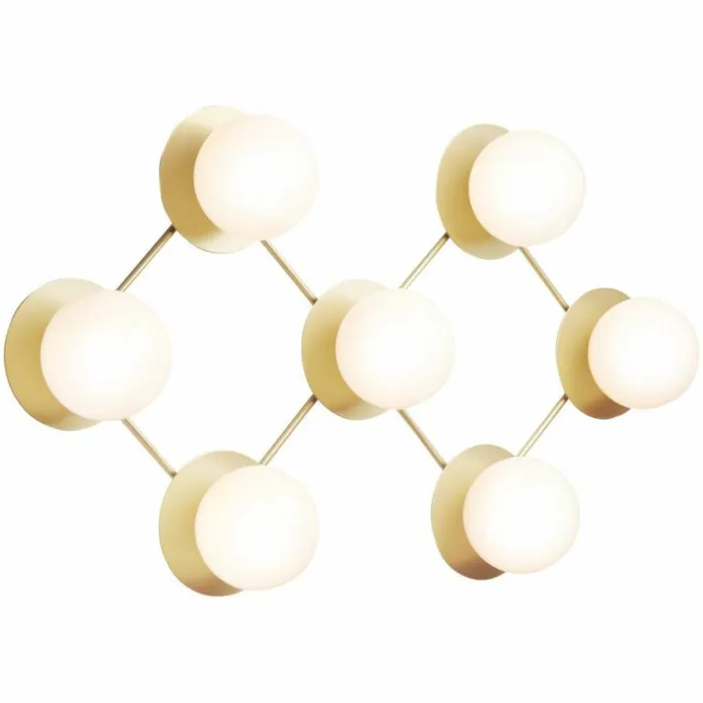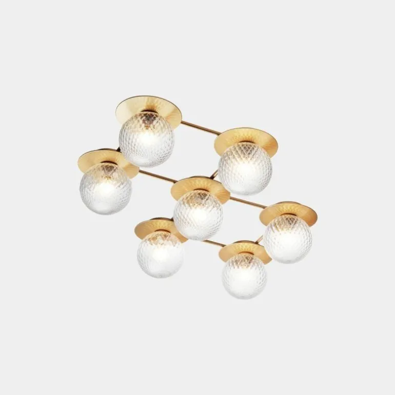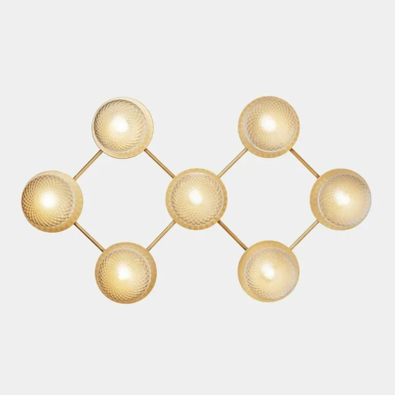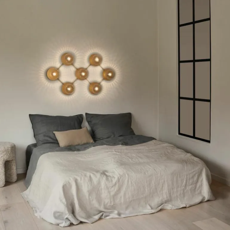 De Liila 7 beschikt zoals de naam al prijsgeeft over zeven lichtbronnen. Deze zijn gehuld in een mondgeblazen kap van semi-transparant opaalglas of helder optisch glas. Het opaalglas verspreidt een zacht en diffuus licht dat doet denken aan de maan tijdens een heldere nacht, en het heldere optische glas laat het licht daarentegen juist schijnen zoals de stralen van de zon. Deze bollen van licht worden elegant omlijst door een zacht afgewerkt metalen rasterframe in de kleur ‘Nordic Gold’ die het licht van de lamp fijntjes reflecteert. De Liila 7 lamp beschikt over fittingen geschikt voor een G9 LED lichtbron van maximaal 7 Watt, deze laatste is niet inbegrepen en kan apart worden mee besteld.r