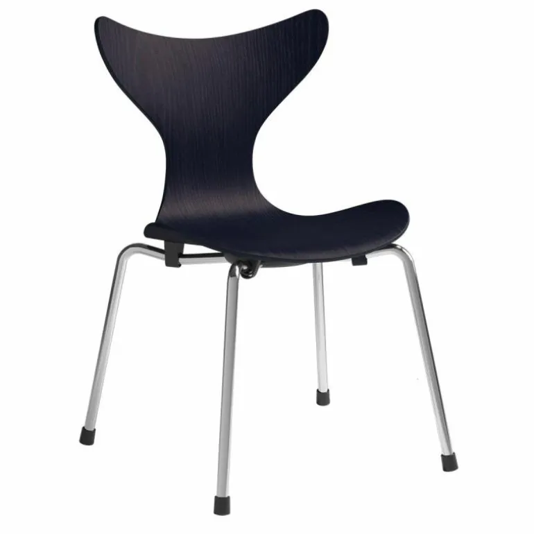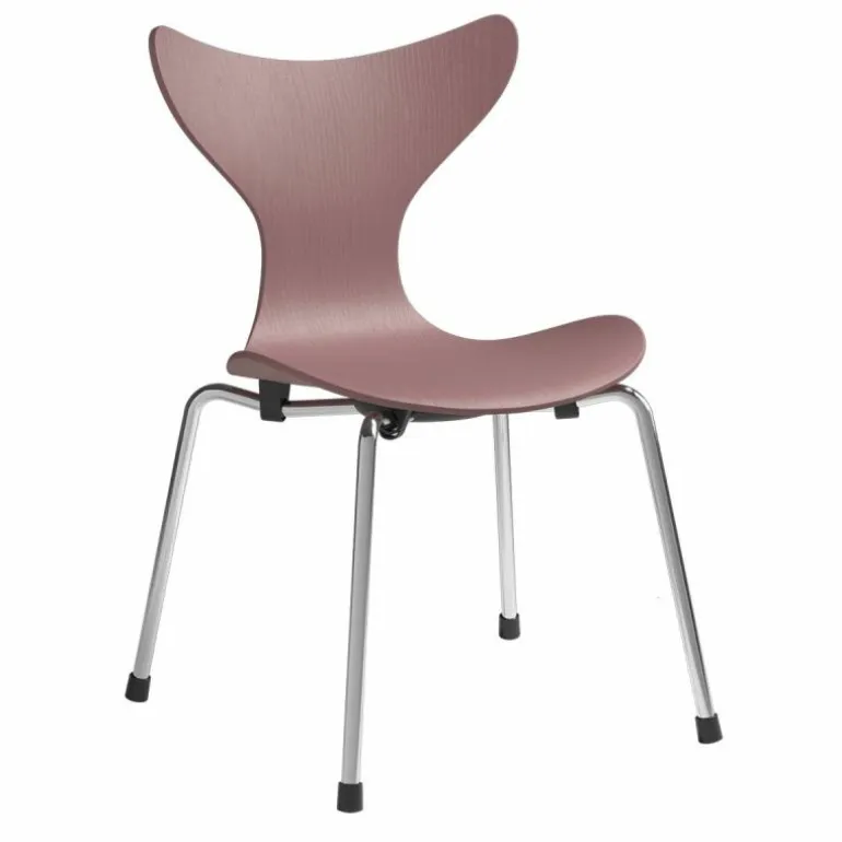 De zitting van de Lily Kinderstoel is gemaakt van onder druk gegoten fineer en is verkrijgbaar met een transparante lak of een gekleurde lak in Midnight Blue of Wild Rose. Zijn kenmerkende zitschaal wordt gedragen door een vierpotig, verchroomd onderstel. Bovendien is de stoel stapelbaar, waardoor hij eenvoudig verplaatsbaar en op te bergen is.