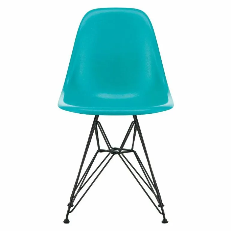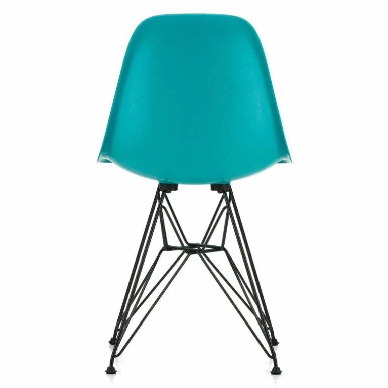 De turquoise zitschaal van de Limited Edition Eames Fiberglass Chair DSR wordt gedragen door een zwart draadonderstel. De DSR Chair is 55 centimeter diep, 46,5 centimeter breed en 83 centimeter hoog. De zithoogte bedraagt 43 centimeter.