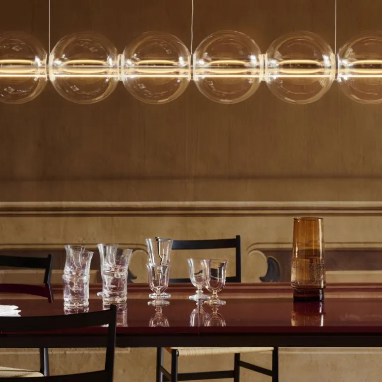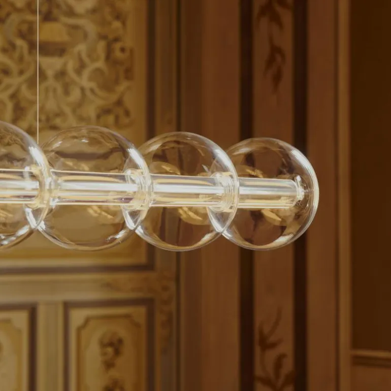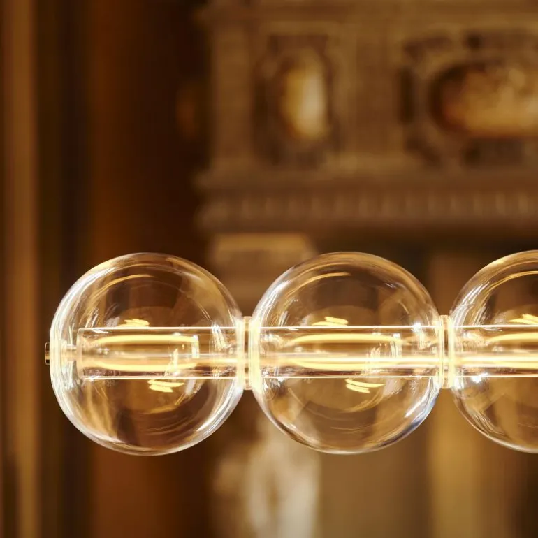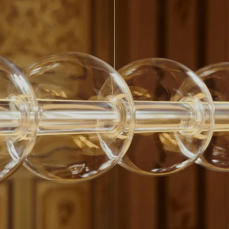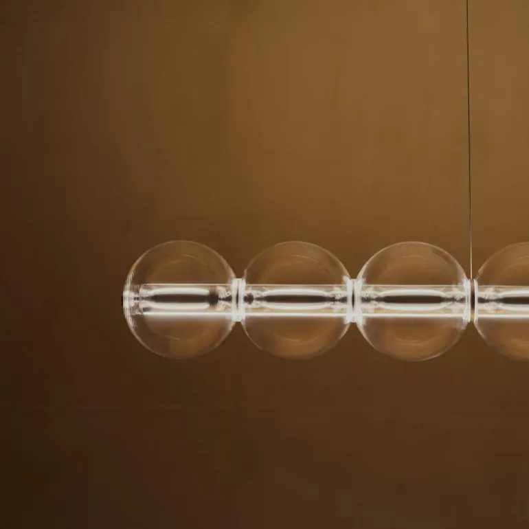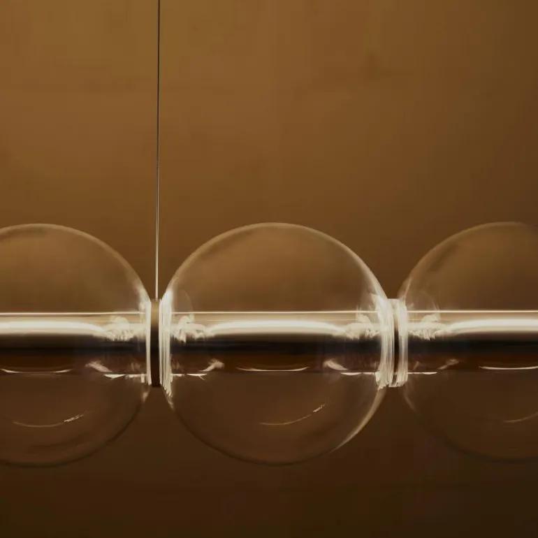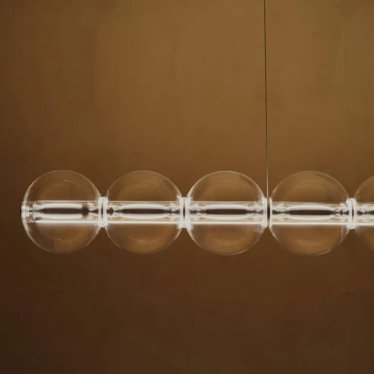 Rond het aluminium profiel bevindt zich een reeks met de hand geblazen glazen bollen, gescheiden door subtiele metalen afstandhouders. Deze constructie geeft de lamp een lichte, transparante uitstraling en benadrukt de technische precisie van het ontwerp. De modulaire opbouw maakt het mogelijk om meerdere elementen in parallelle rijen te plaatsen, waardoor de lamp schaalbaar is voor verschillende interieurconcepten. Het gebruik van hoogwaardige materialen garandeert duurzaamheid, terwijl de afwerking het karakter van ambachtelijk vakmanschap behoudt.