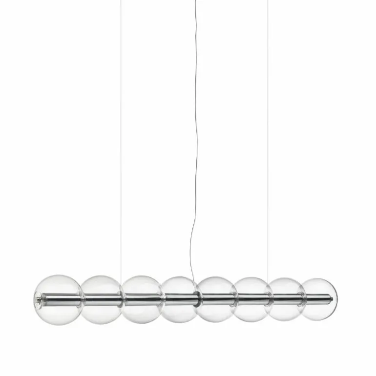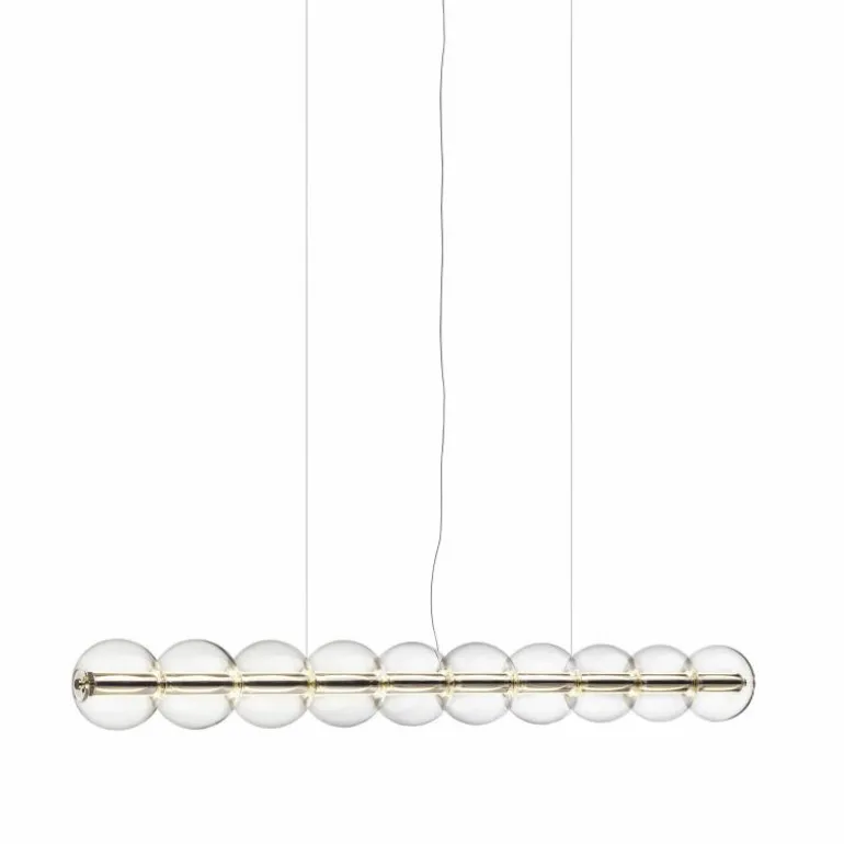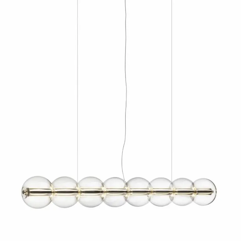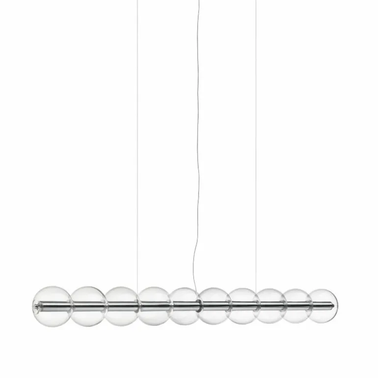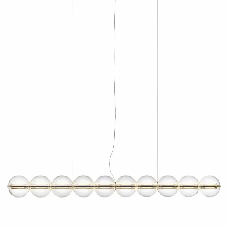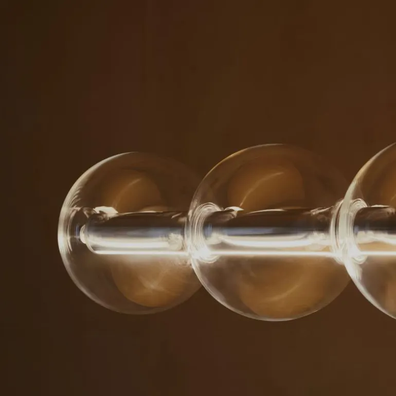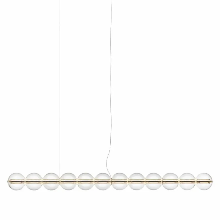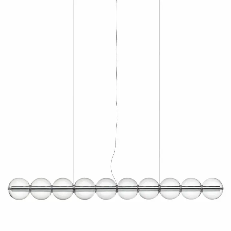 Rond het aluminium profiel bevindt zich een reeks met de hand geblazen glazen bollen, gescheiden door subtiele metalen afstandhouders. Deze constructie geeft de lamp een lichte, transparante uitstraling en benadrukt de technische precisie van het ontwerp. De modulaire opbouw maakt het mogelijk om meerdere elementen in parallelle rijen te plaatsen, waardoor de lamp schaalbaar is voor verschillende interieurconcepten. Het gebruik van hoogwaardige materialen garandeert duurzaamheid, terwijl de afwerking het karakter van ambachtelijk vakmanschap behoudt.